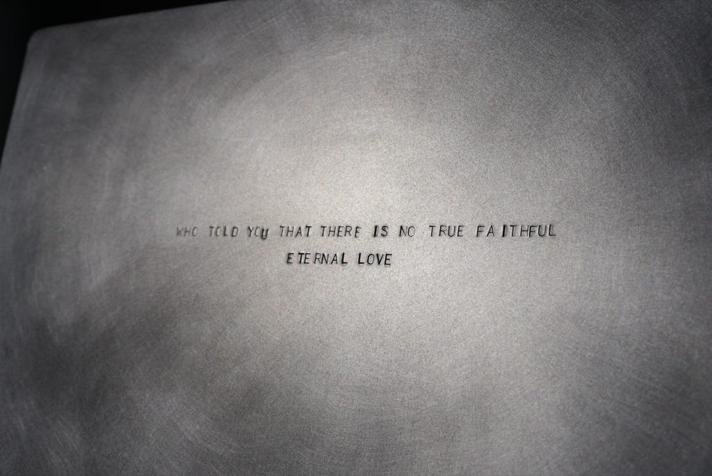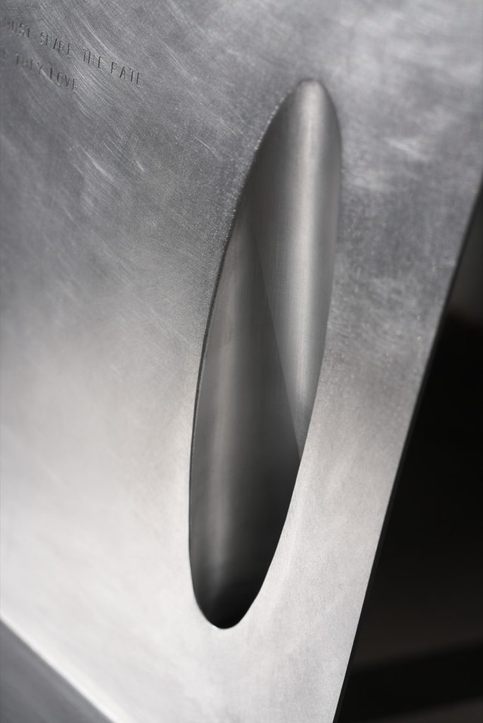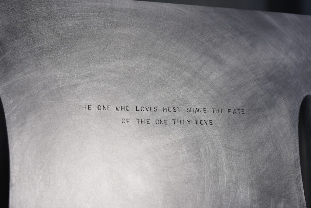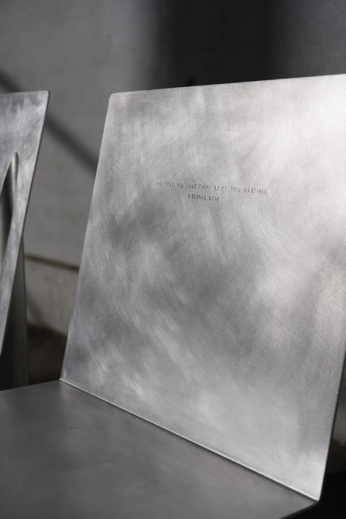 The literary reference is not left as a title card. Each chair is engraved with a quote from Bulgakov’s novel, turning the objects into carriers of text and, by extension, remembrance. The Margarita chair bears the line “The one who loves must share the fate of the one they love,” while the Master chair reads “Who told you that there is no true, faithful, eternal love?” With the words etched into metal, the chairs shift from furniture to mnemonic devices, places where reading and sitting overlap.