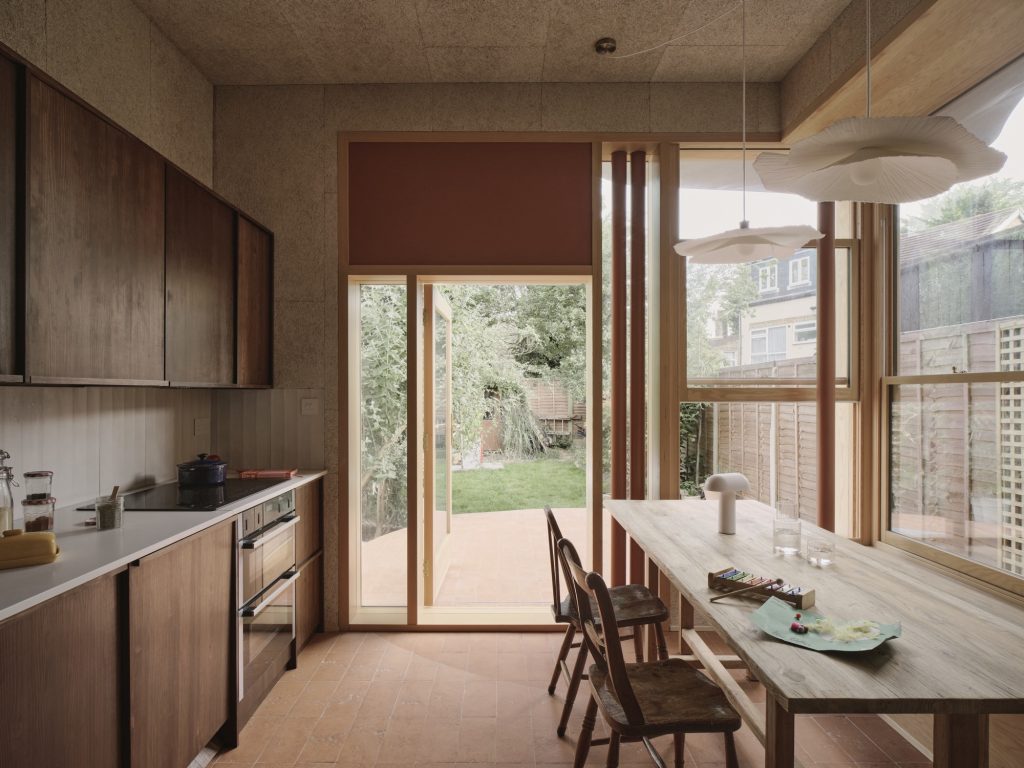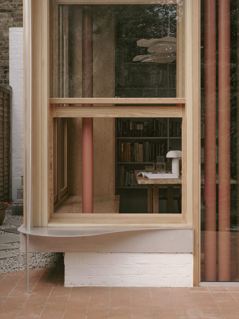 THISS Studio’s strategy centred on reconfiguring the rear of the dwelling. The architects introduced a cantilevered dining bench framed by three oversized timber sash windows, creating a bay of light that visually enlarges the room and dissolves the boundary between kitchen and garden.