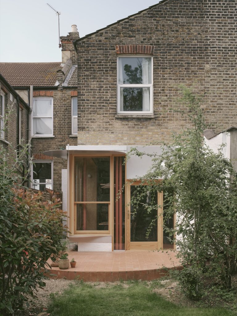 Outside, a sculptural curved canopy made from recycled aluminium projects from the building’s corner. Laser-cut and fixed above the south-facing elevation, it provides shade and weather protection for the timber windows while adding a moment of architectural whimsy. A smaller aluminium ledge below mirrors this gesture, offering an informal seat or outdoor table.