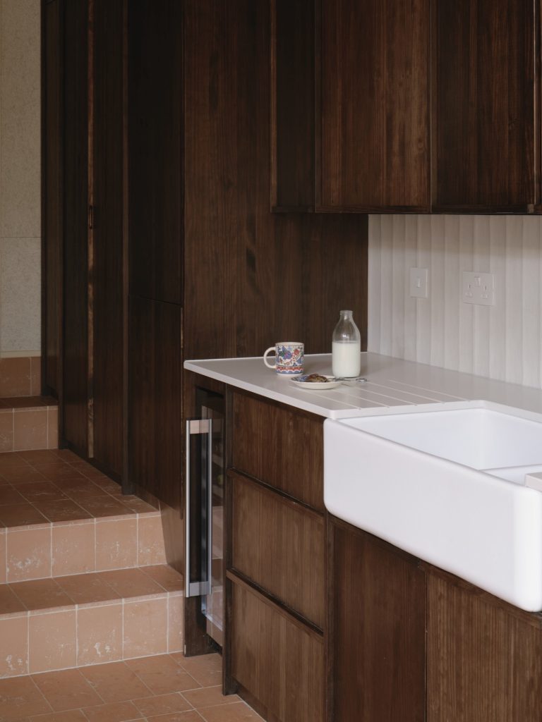 The relationship between inside and outside is choreographed with subtlety. Terracotta tiling extends from the kitchen into the garden, forming a circular patio affectionately nicknamed the “disco ball patio,” where a tonal shift in the tilework marks a gentle transition between the two realms.