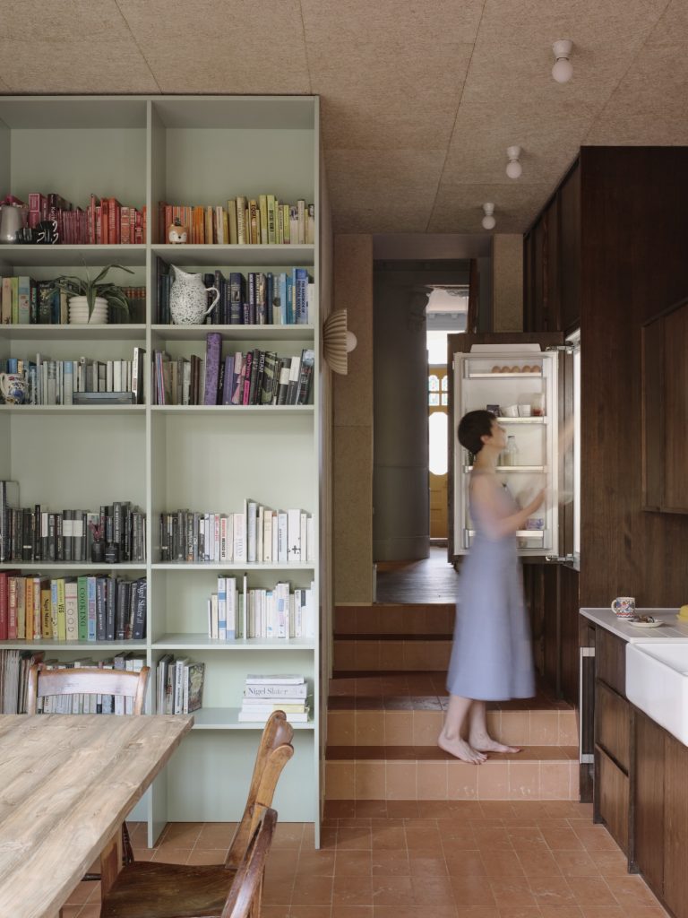 A palette of natural wood, terracotta, and pale cream acoustic panels made from recycled paper gives the interior a calm groundedness. A mint-green, floor-to-ceiling shelving unit introduces vertical rhythm, while playful floral light fixtures echo the family’s lively personality.
