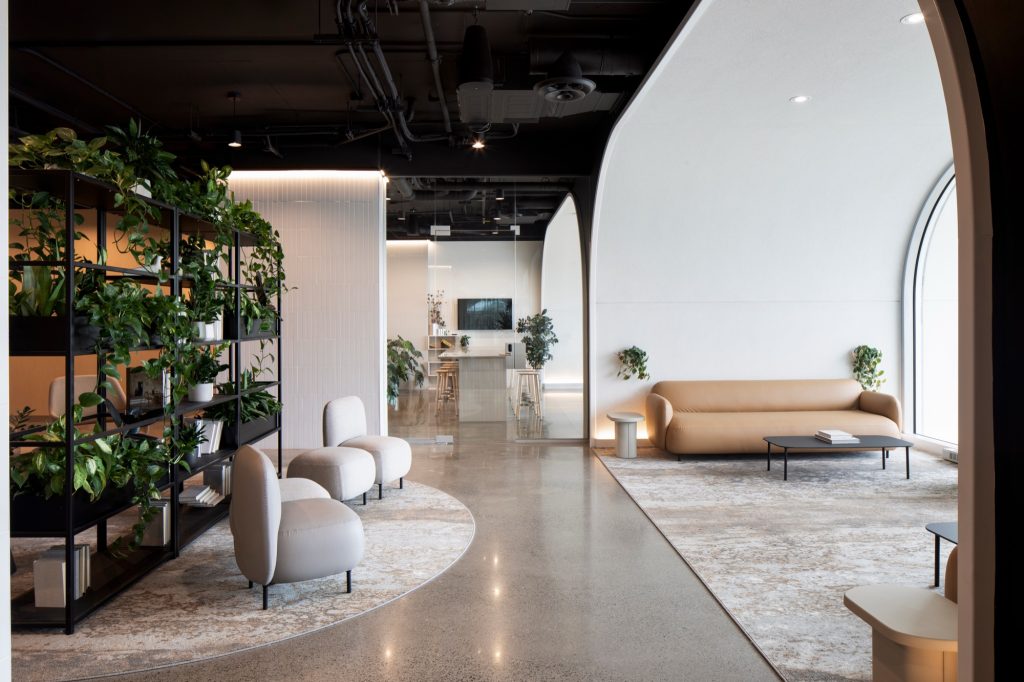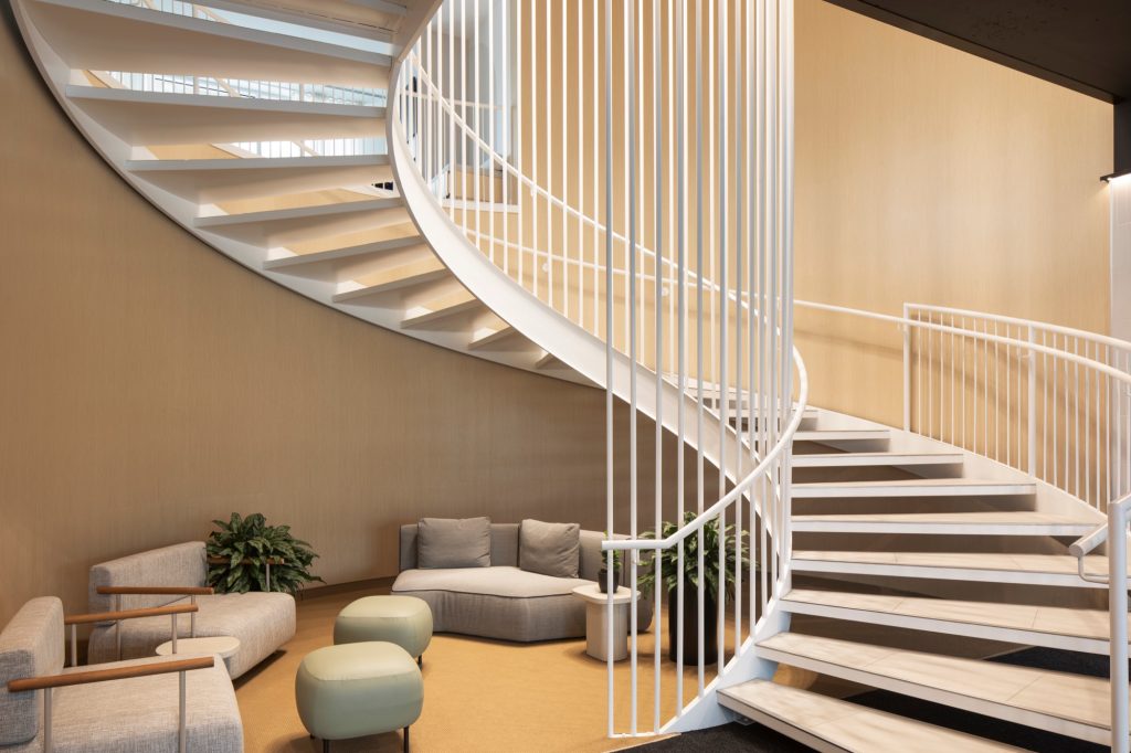 Inside, the architectural language continues into the common areas, where arches reappear to organize co working spaces, a communal kitchen, a gym, and lounge areas. Light toned walls maximize daylight, while darker ceilings absorb exposed technical elements, producing interiors that feel both economical and welcoming.