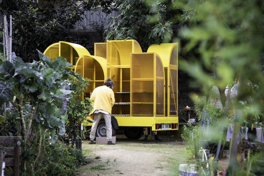 When anchored in place, the Mobile Seedbed operates as a compact greenhouse dedicated to seed germination. Sunlight filters through the polycarbonate skin, activating a controlled microclimate that nurtures seedlings before their redistribution across the city. In this stationary state, the structure becomes a laboratory of growth, foregrounding the slow temporality of cultivation within a context defined by circulation and consumption.