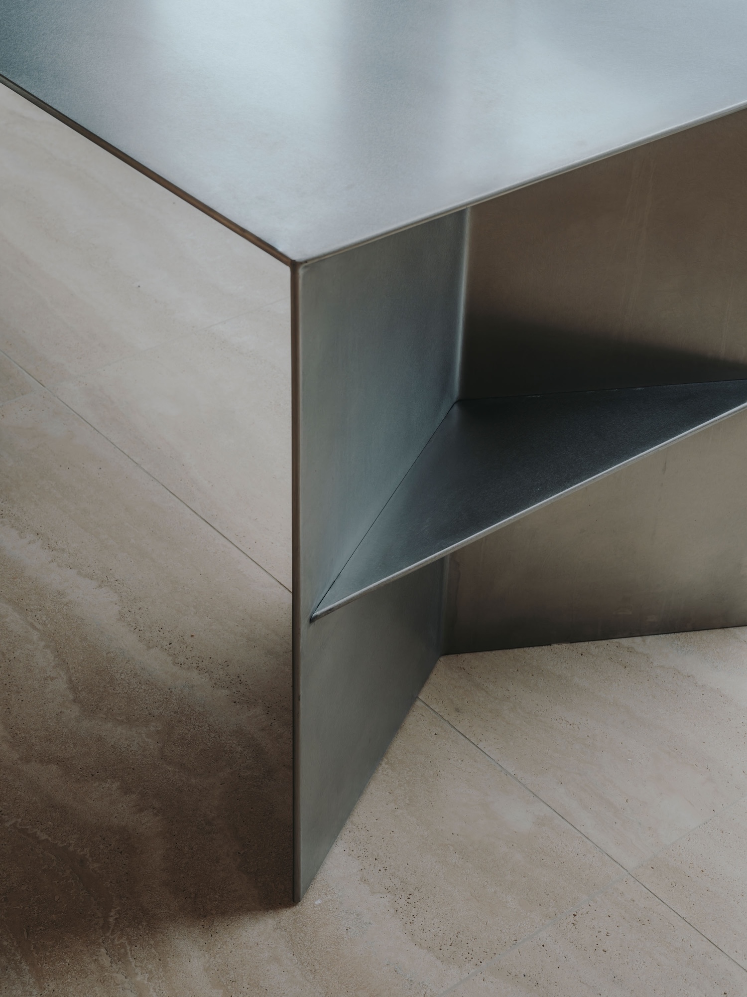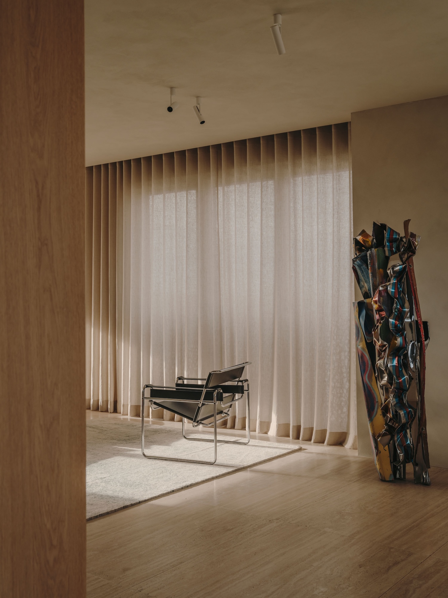 The bar occupies a privileged position facing the most dramatic view, transforming everyday domestic use into a contemplative experience of the landscape. Its stainless steel fronts are finished with a swirl technique that softly captures and diffuses light, adding depth without introducing visual distraction. This sensitivity to surface treatment extends throughout the apartment, from brushed stainless steel details to the earthy texture of Matteo Brioni plaster walls. Together, these elements create a tonal cohesion that allows the surrounding cityscape and distant mountains to remain the true protagonists.