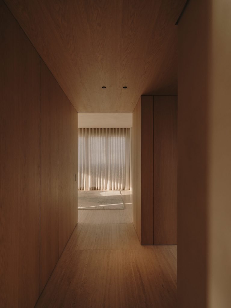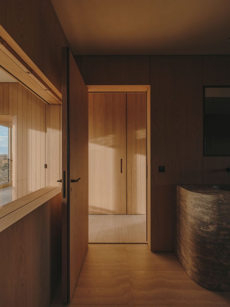 The wooden core embodies Holzrausch Studio’s integrated design-and-fabrication approach, developed through close collaboration between architectural conception and in-house workshop craftsmanship. Sliding panels embedded within the structure allow rooms to open fully into one another or close off as needed, enabling the apartment to oscillate between total openness and carefully controlled enclosure. Visual continuity is preserved even when spaces are separated, ensuring that light, views, and material coherence remain uninterrupted.