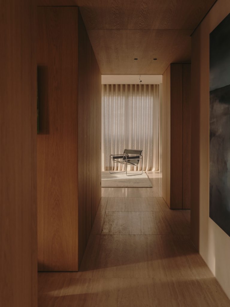 Rather than dividing the plan into fixed enclosures, Holzrausch introduced a single architectural gesture that defines the entire project. At the center of the apartment stands a monumental wooden core, conceived simultaneously as spatial organizer, circulation device, and inhabitable furniture. This vertical timber volume houses the apartment’s functional infrastructure while allowing the surrounding spaces to remain fluid and continuous. From this core, movement unfolds in a loop, encouraging a non-hierarchical experience of the interior that aligns with the expansive horizon beyond the glass.