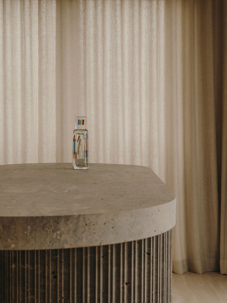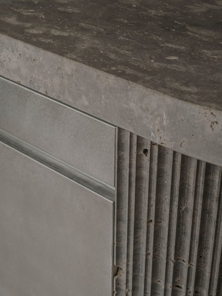 The interior palette is deliberately restrained, verging on austerity, yet rich in tactile nuance. Travertine floors establish a calm, mineral base, complemented by oak veneer surfaces that lend warmth to the otherwise minimal composition. Wachenzeller Dolomit, a German limestone characterized by subtle veining, appears in both the bar and the bathroom washbasins, reinforcing material continuity across the apartment.