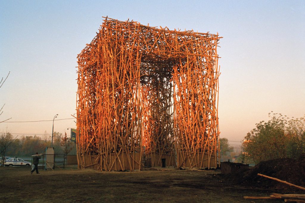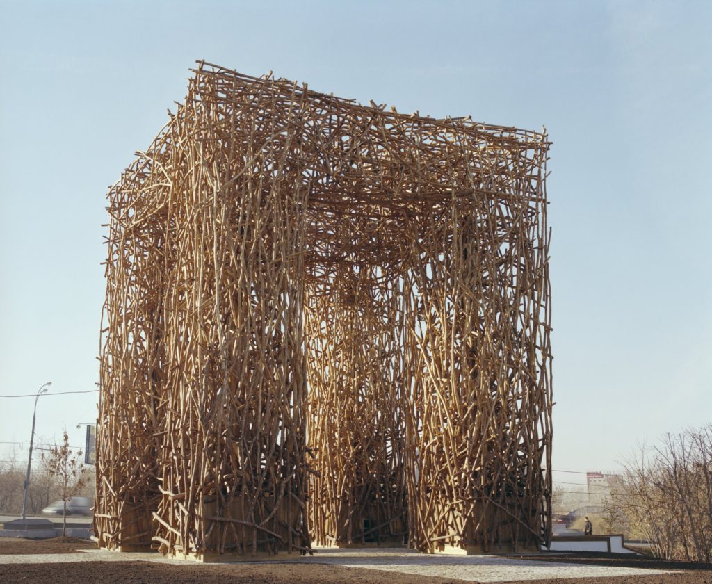 In the northern districts of Moscow, where residential fabric dissolves into infrastructure and parkland, a structure once stood that resisted easy classification. Neither architecture in the conventional sense nor sculpture as a self-contained object, Likhoborskie Gate occupied public space as a provisional threshold. Supported by four concrete pillars and crowned with a dense lattice of wooden rods, the work appeared at once archaic and unresolved, closer to a rural construction than to the symbolic language of the contemporary city.