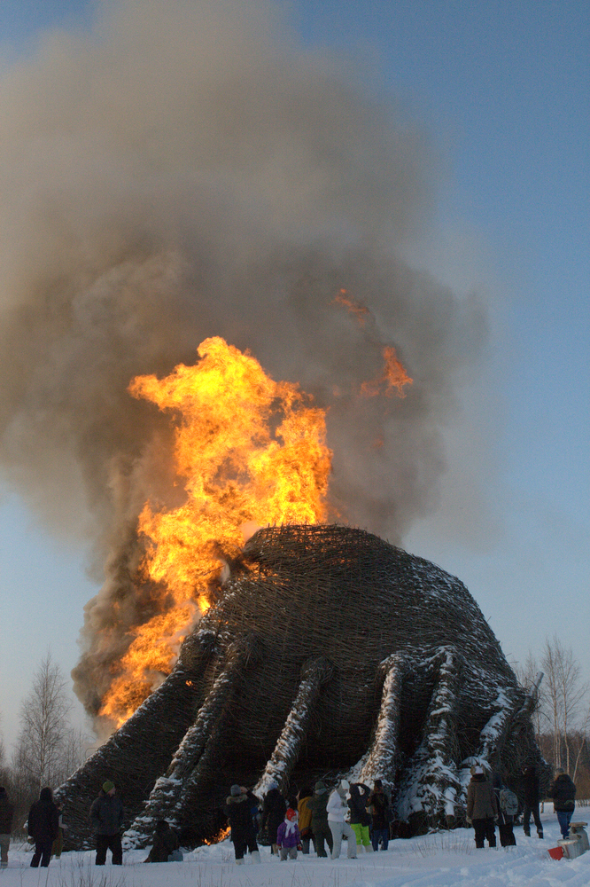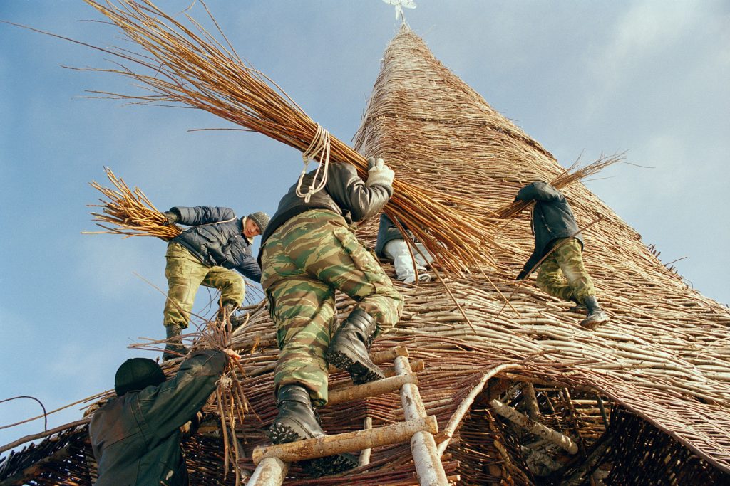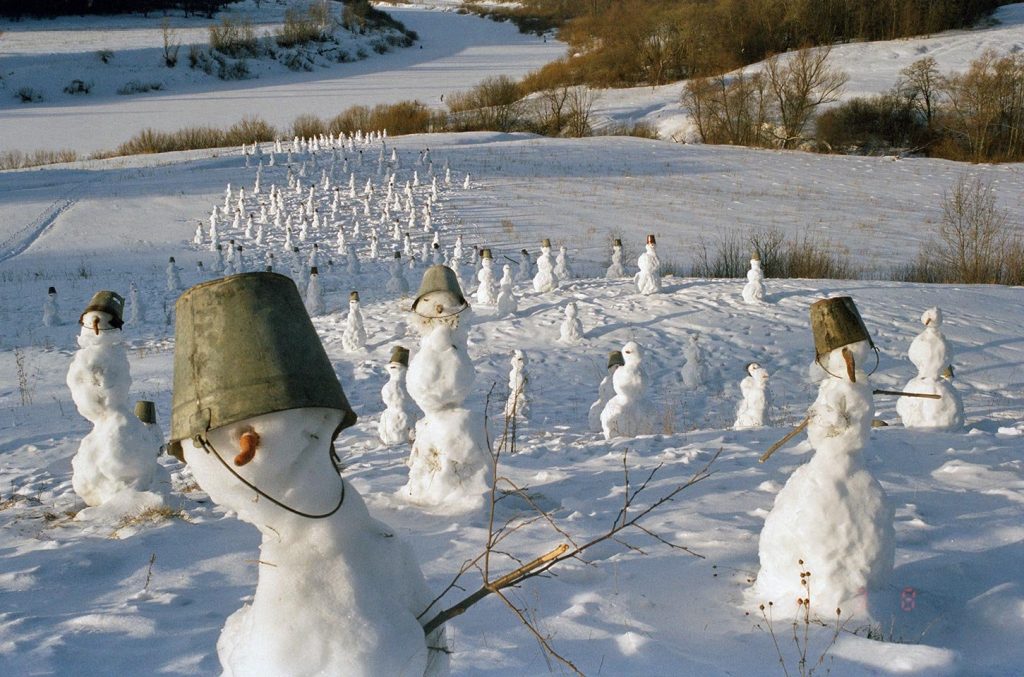 Nikolay Polissky’s Snowmen project (2000), mobilizing local residents to build monumental snow figures in Nikola Lenivets. Credit: Art Focus Now.