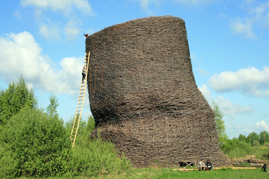 Tower of Babel by Nikolay Polissky, constructed from hay in a spiraling ascent, exemplifying scale and repetition. Credit: Art Focus Now.