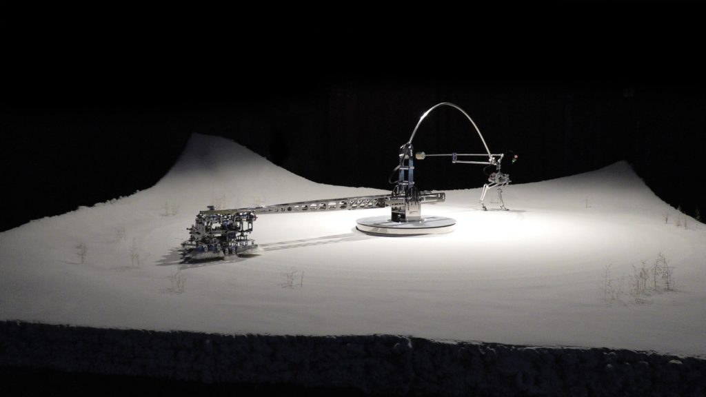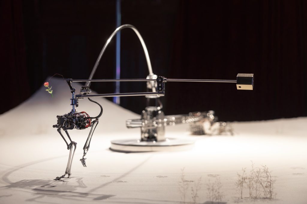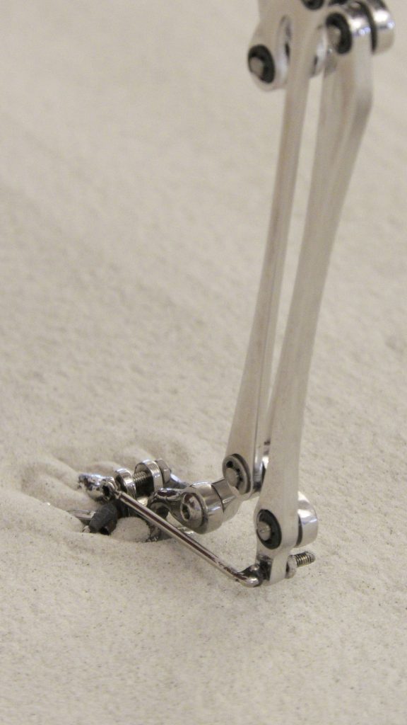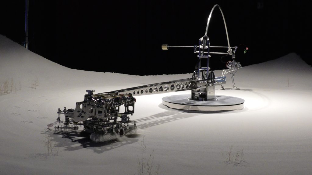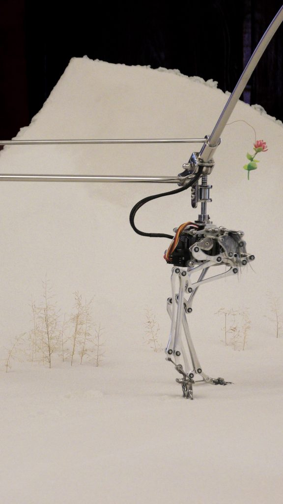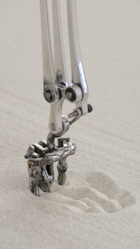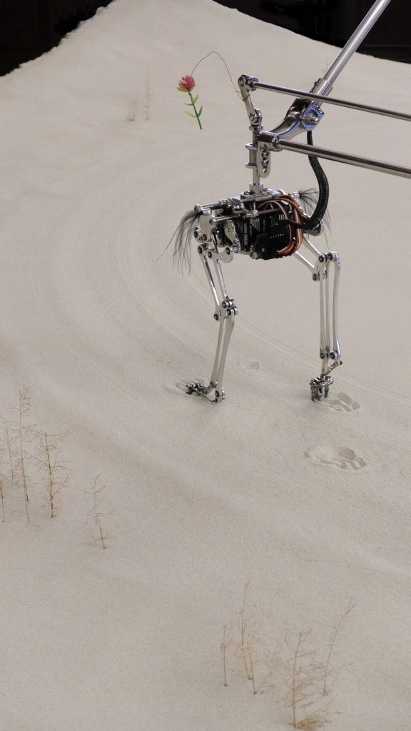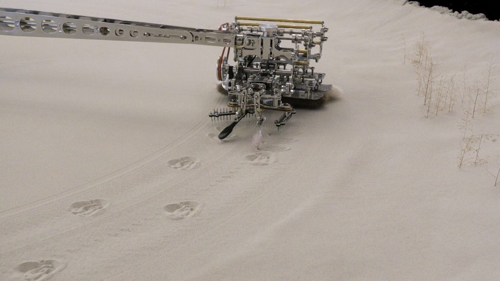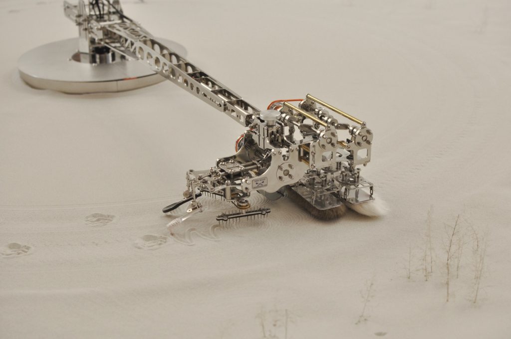 Installed at a scale of 265 by 265 by 150 centimetres, No Bird combines electronics, stepper and servo motors, aluminium, stainless steel, brass, sand and controlled lighting into a self contained ecosystem. The first device plants articulated metal feet into the sand, producing tracks that evoke the delicate rhythm of a bird’s walk. The second machine trails closely behind. A toothbrush head scratches away the impressions, a fine wire rake levels the disturbed surface, and soft bristles restore the sand to a seamless plane. The surface is continuously rewritten, yet never altered.