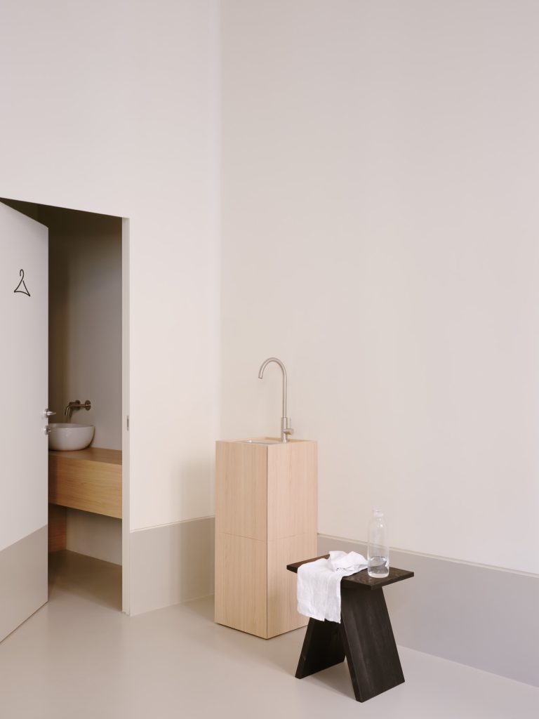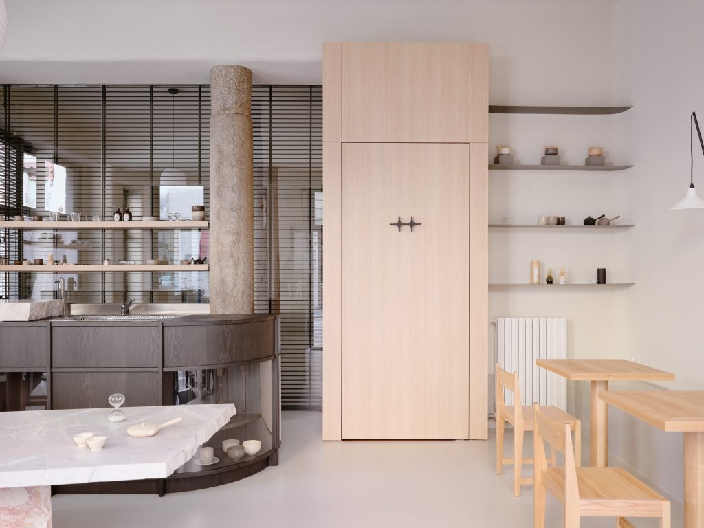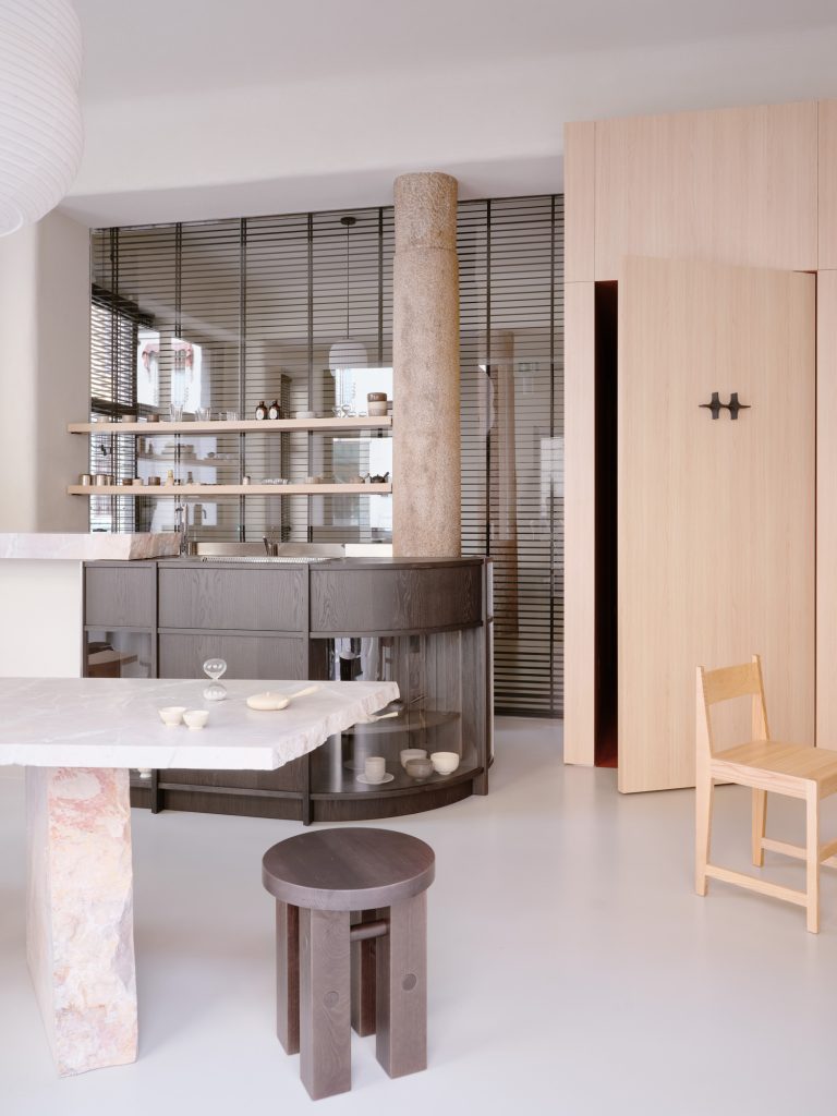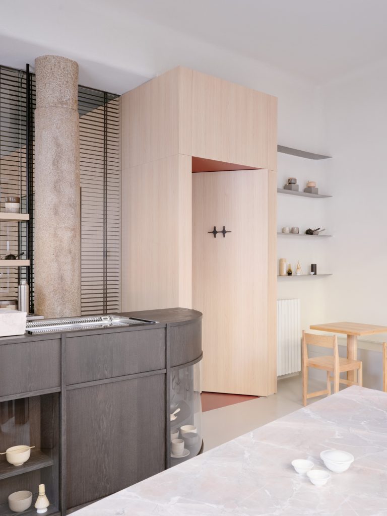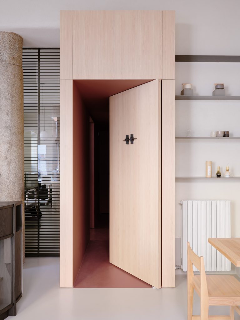 Beyond the bar, a glass partition reveals the project’s second function. The pilates studio is accessed through a pivoting panel concealed within a wooden architectural element that cuts diagonally across the plan. This insertion operates as a spatial device, generating sequences, framing views, and redefining circulation.
