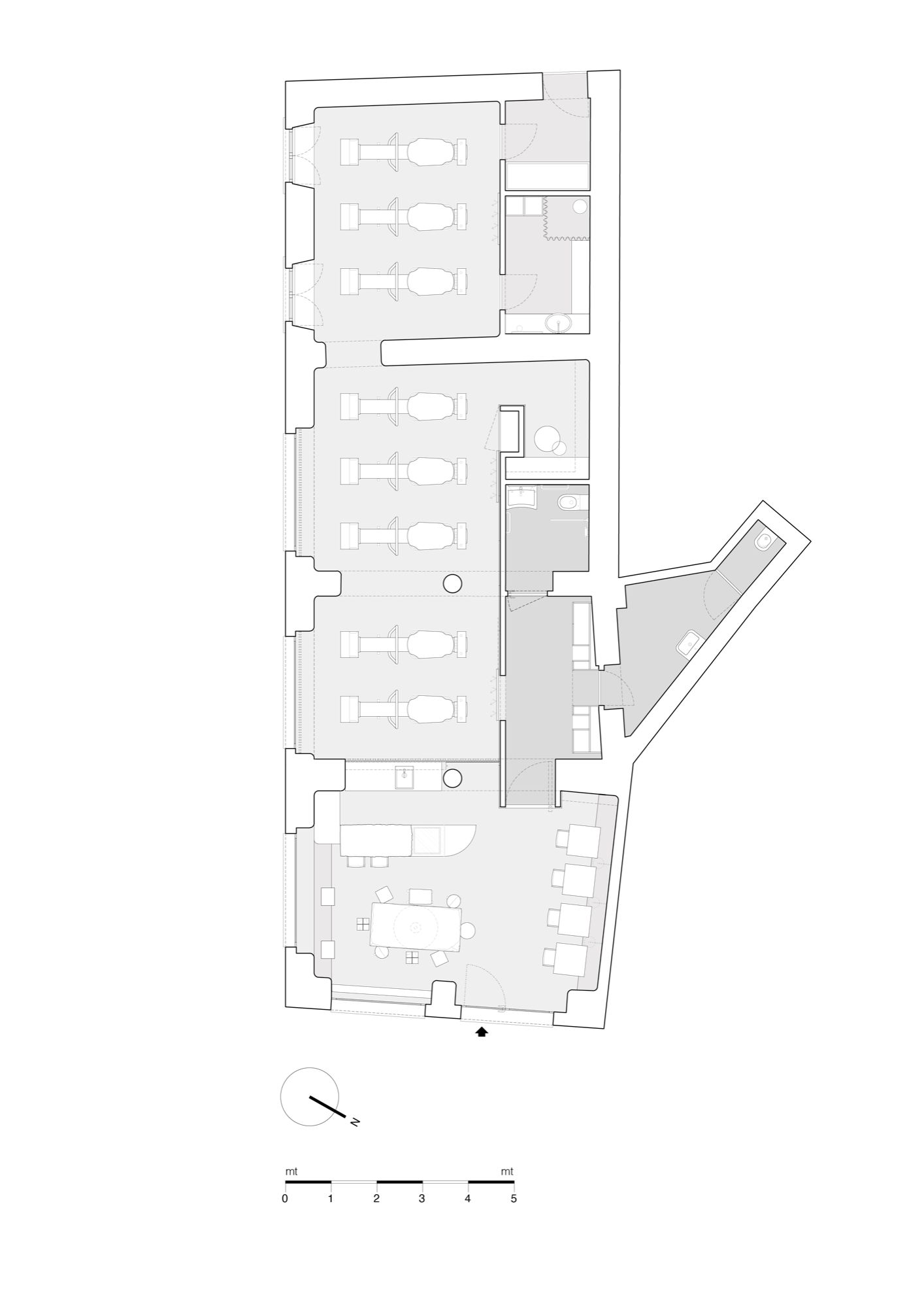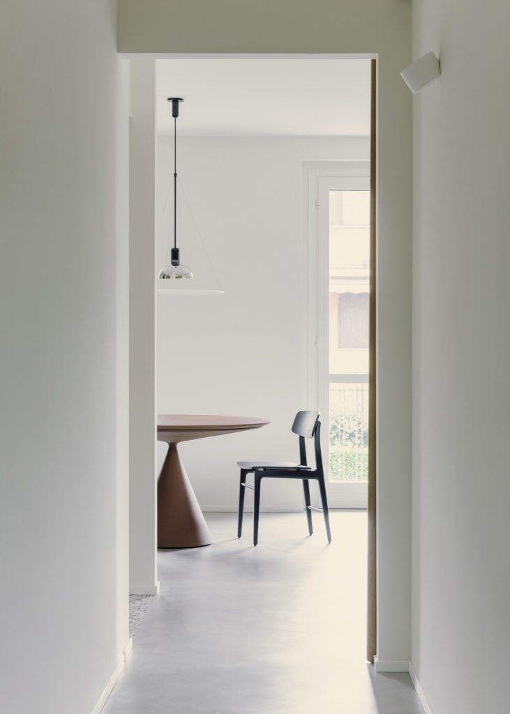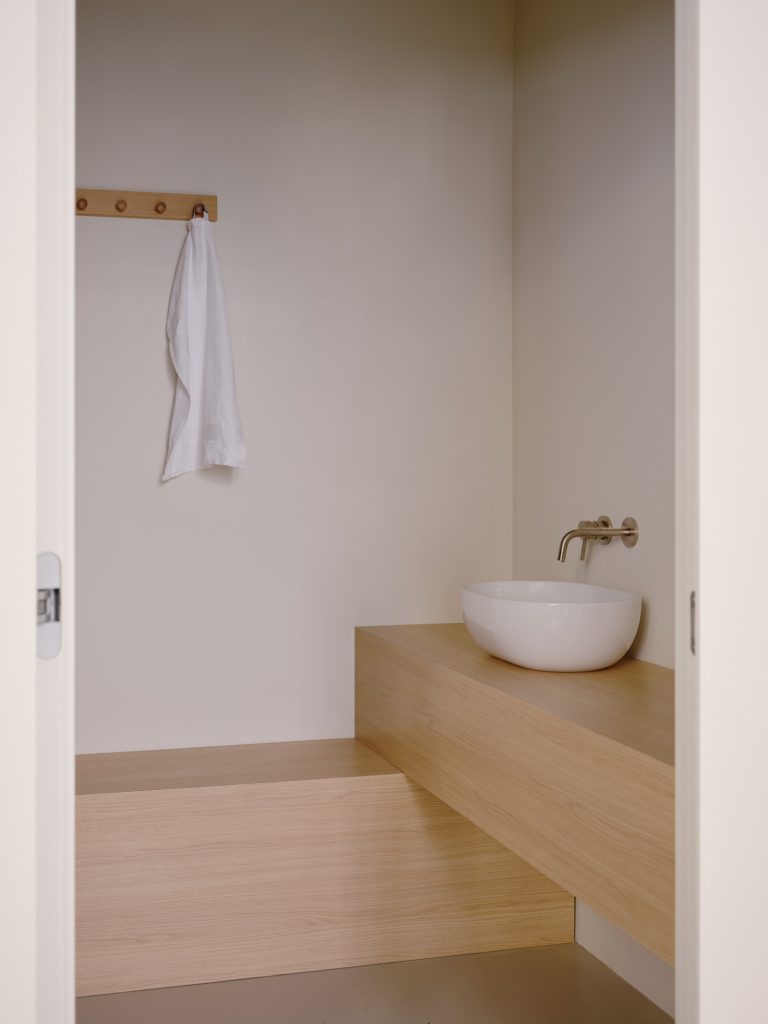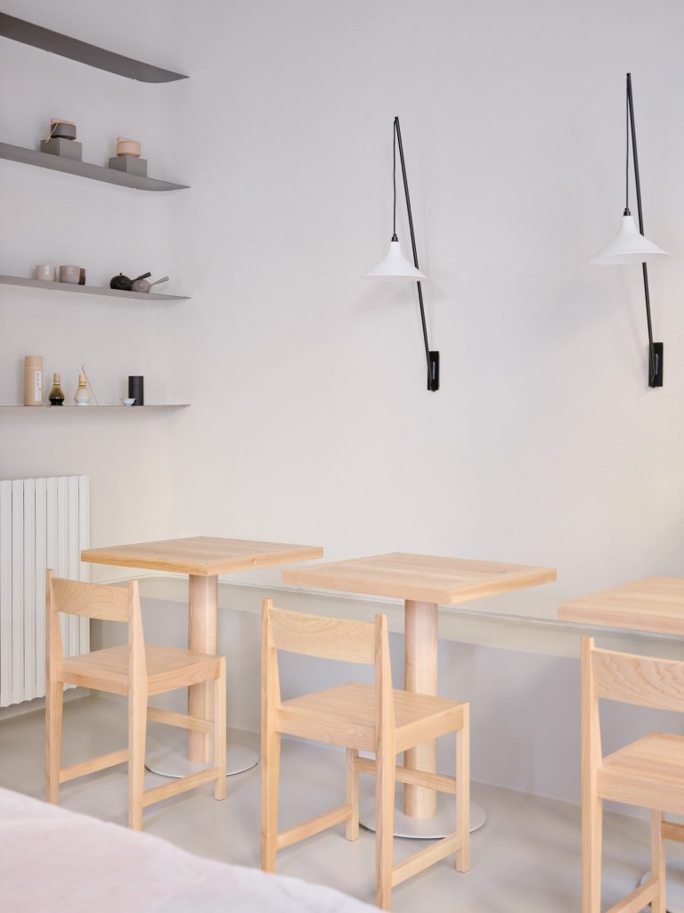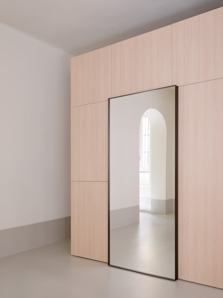 Beyond the bar, a glass partition reveals the project’s second function. The pilates studio is accessed through a pivoting panel concealed within a wooden architectural element that cuts diagonally across the plan. This insertion operates as a spatial device, generating sequences, framing views, and redefining circulation.