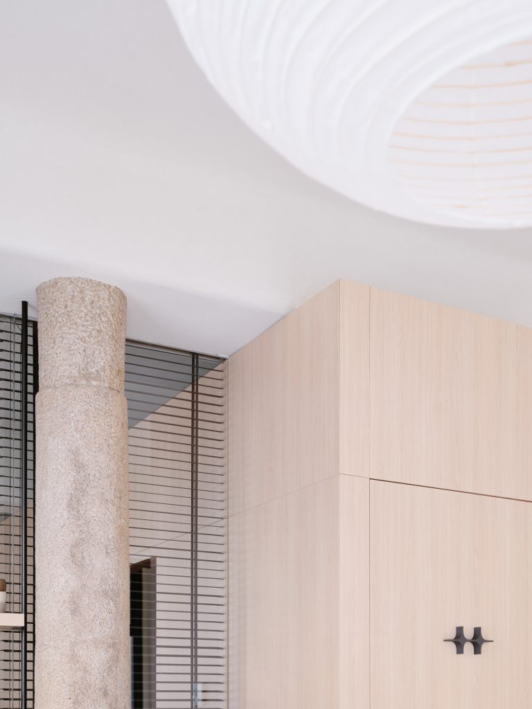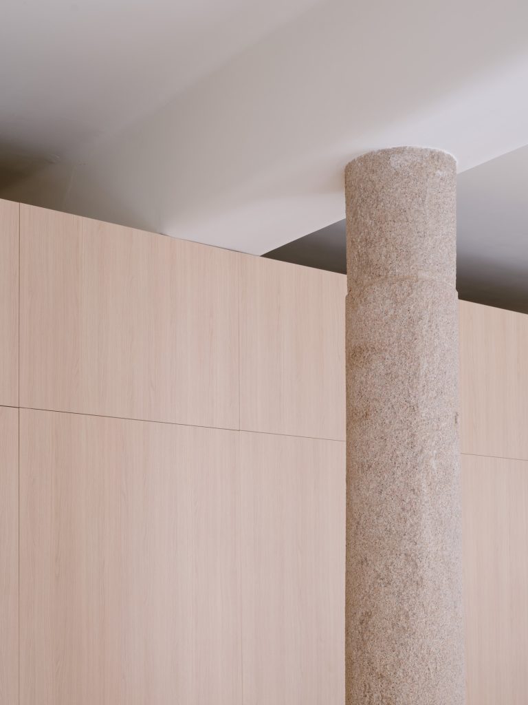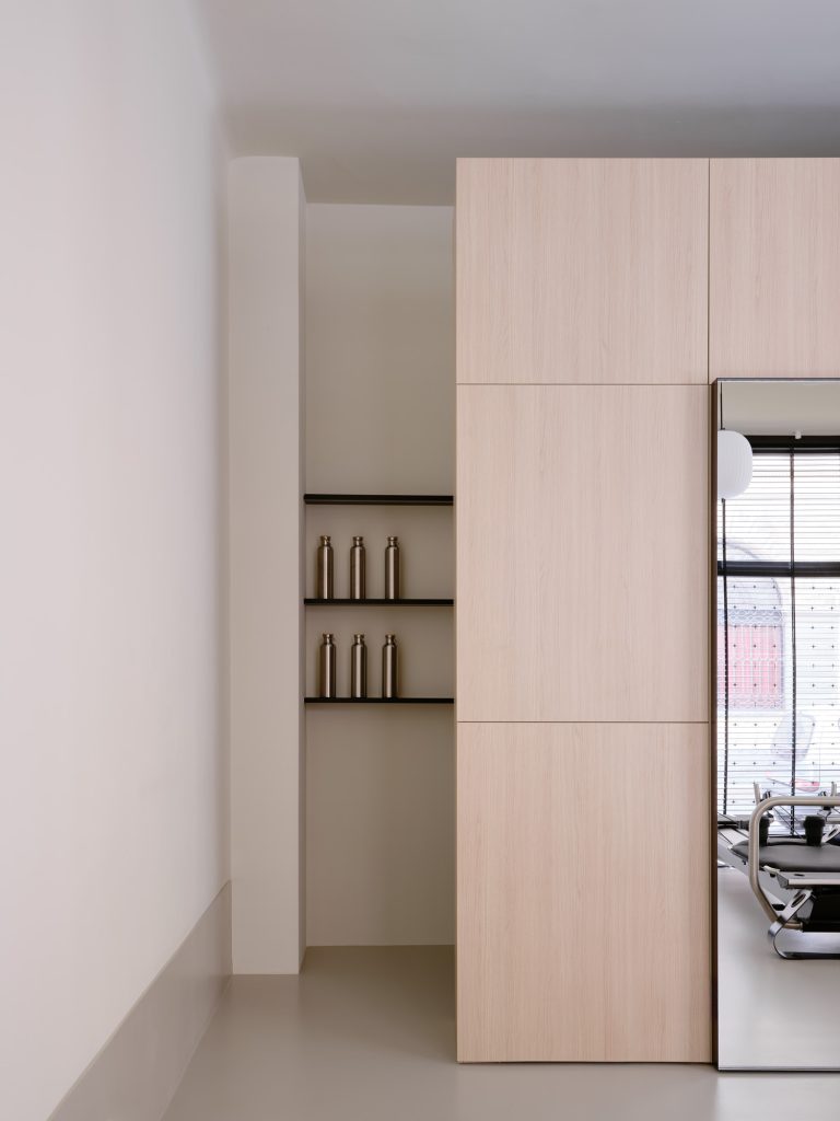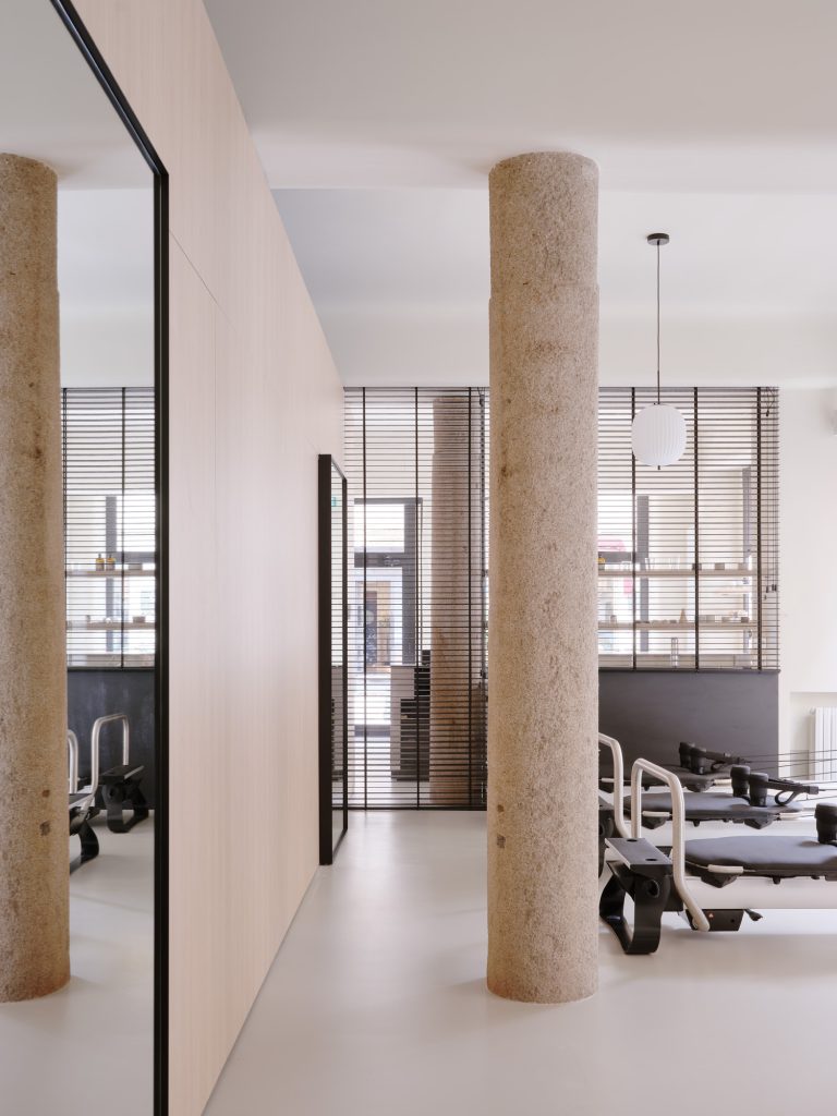 Within the pilates room, the material palette remains consistent with the tea house, reinforcing a unified identity. Existing structural elements, including an exposed granite column and an arched opening, are left visible. These features anchor the new intervention within the original building, maintaining continuity across time.