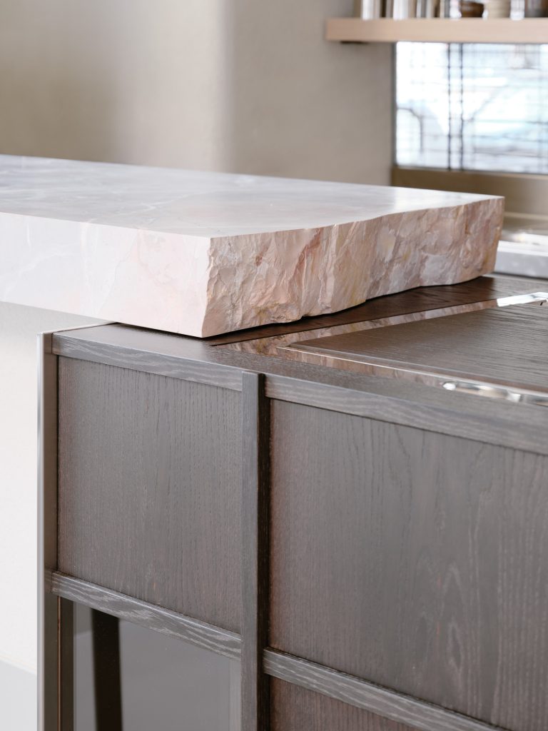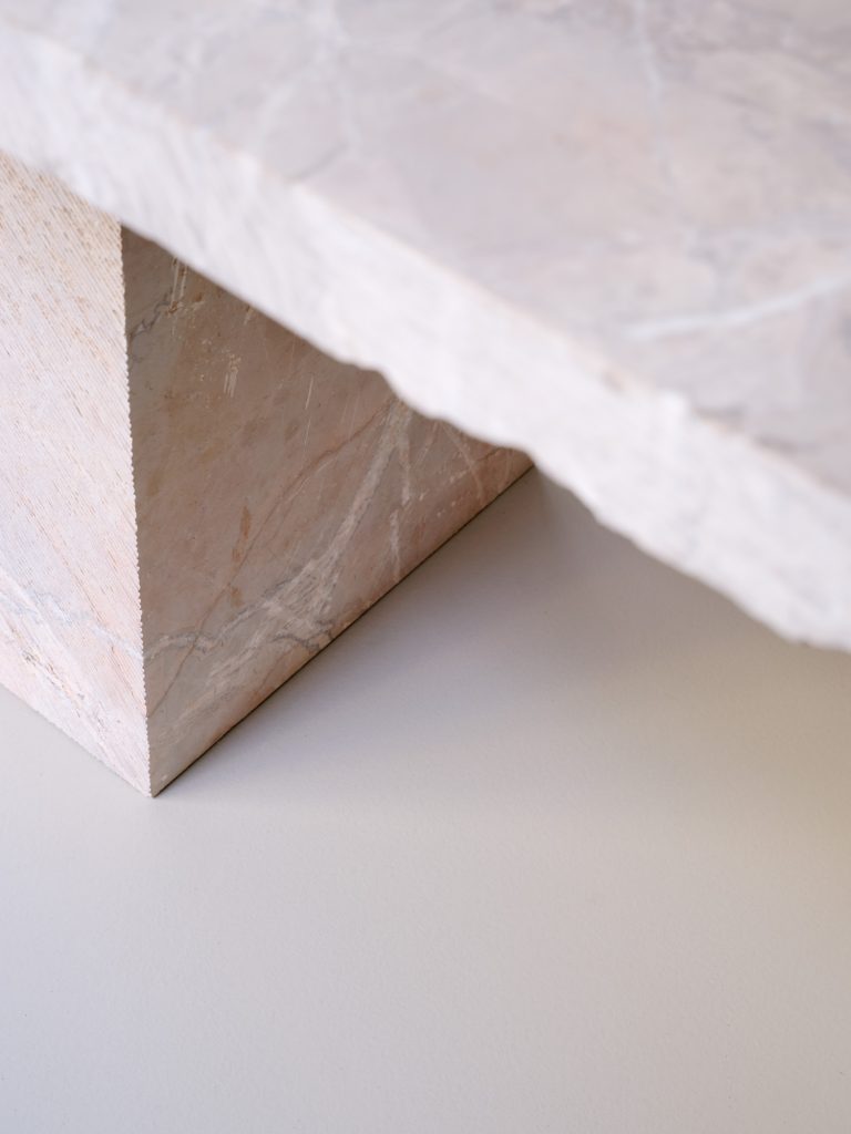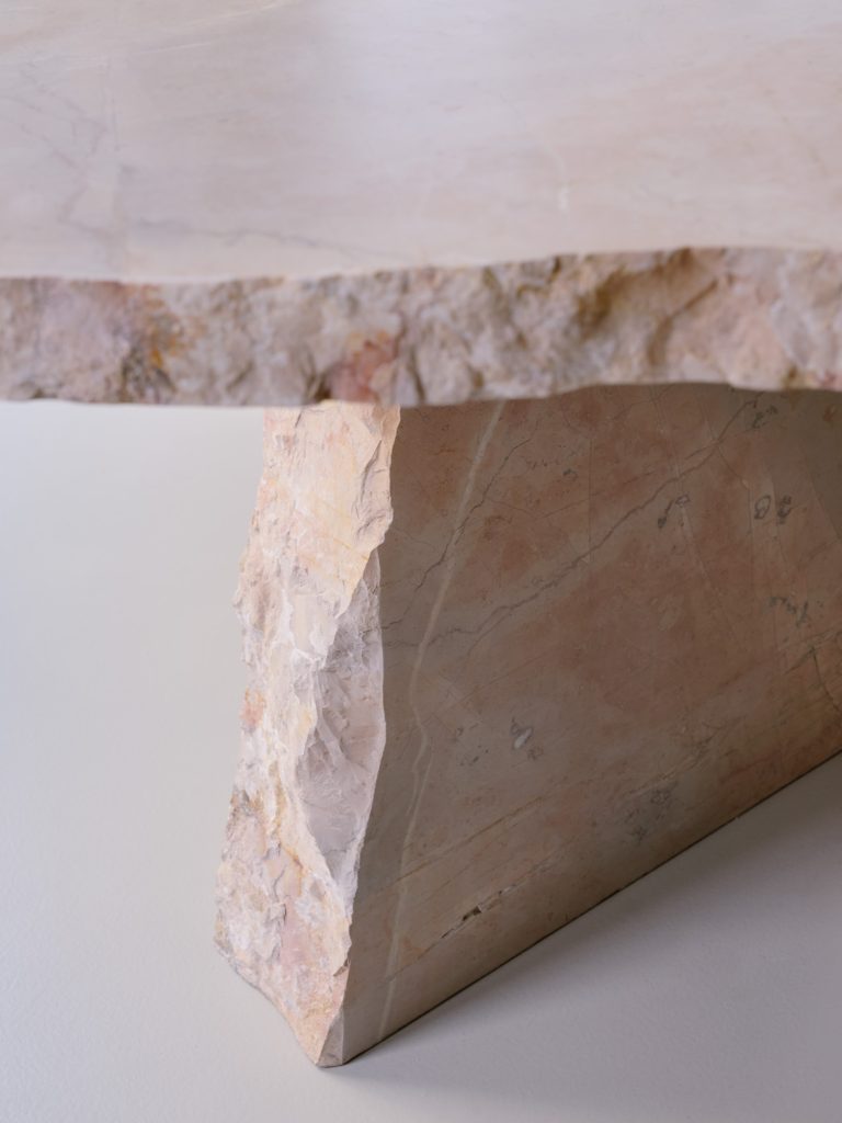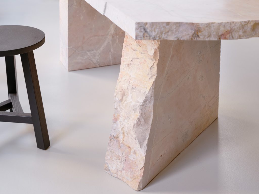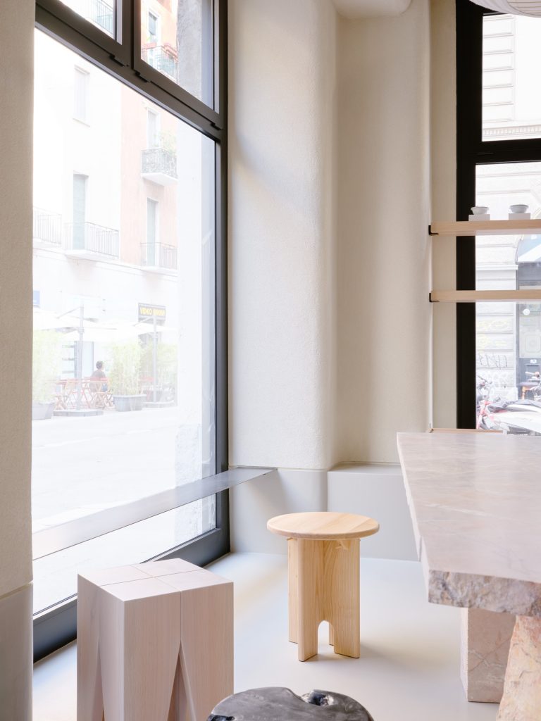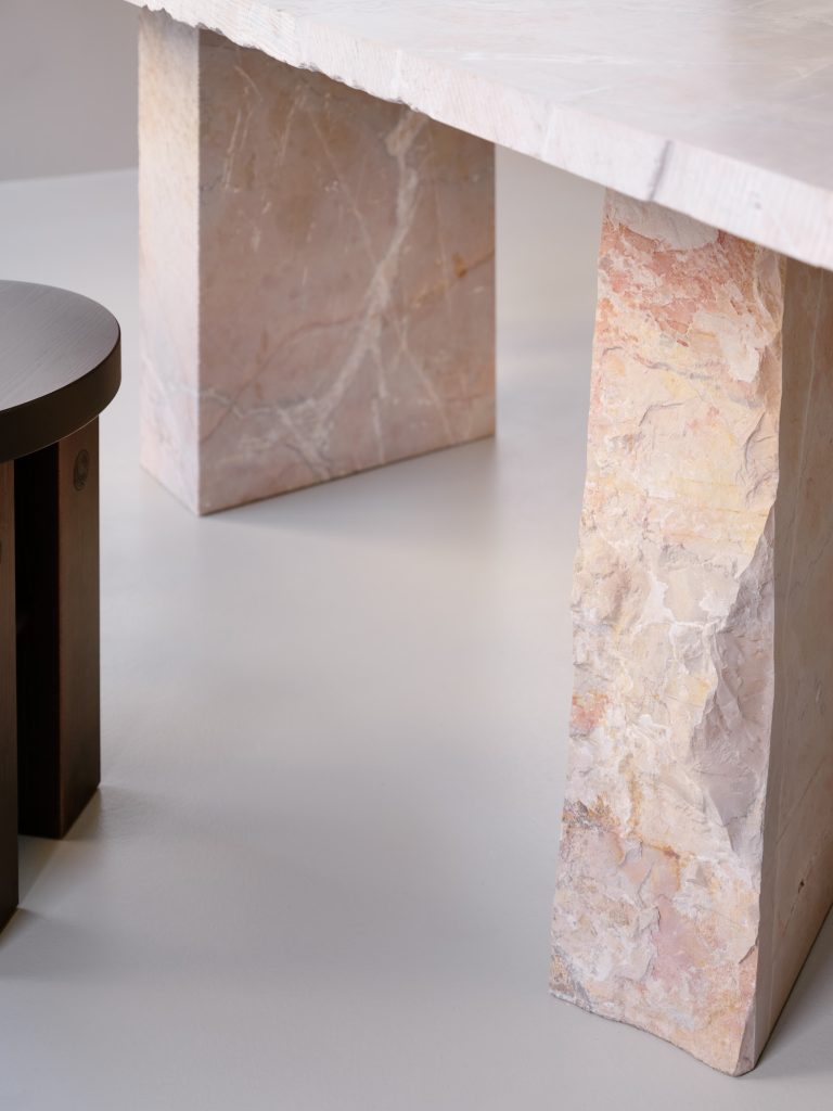 Further inside, a large communal table in raw marble occupies the center of the room. Formed from three stacked volumes, it reads as both furniture and sculpture. The presence of mismatched stools introduces a subtle disruption, softening the monolithic quality of the table and encouraging informal use.