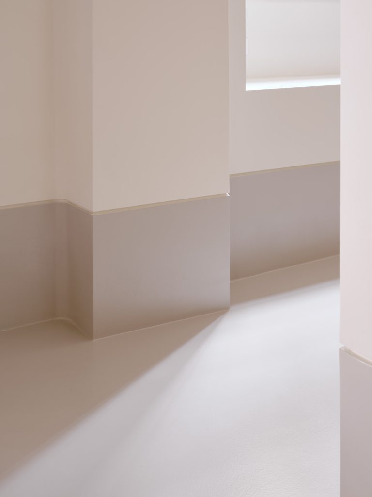 A horizontal datum line runs across the entire space, dividing it into two distinct material conditions. Below, a compact and smooth resin base defines a grounded plane. Above, coarse lime plaster interacts with light, transparency, and layered screens. This juxtaposition between density and lightness generates a suspended atmosphere, where solidity and permeability coexist.