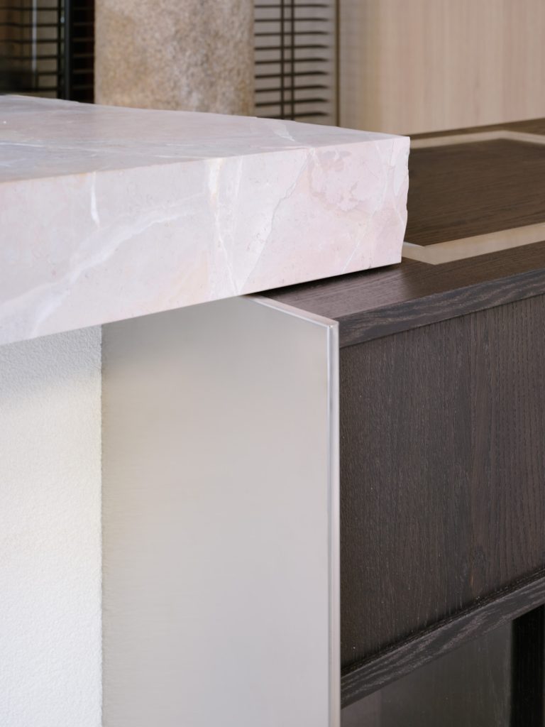 At the entrance, the bar counter becomes both visual anchor and conceptual synthesis. Its composition integrates a resin and lime finished base, a central raw edged marble block, and a crafted wooden volume containing display elements. This single gesture condenses the project’s material language and spatial logic.