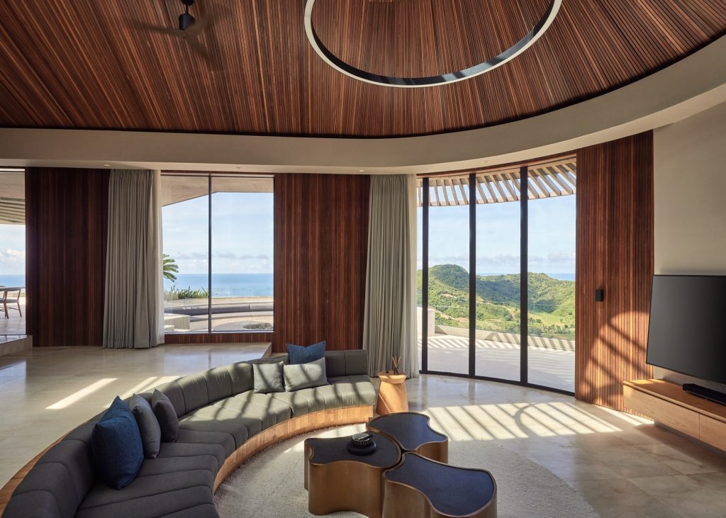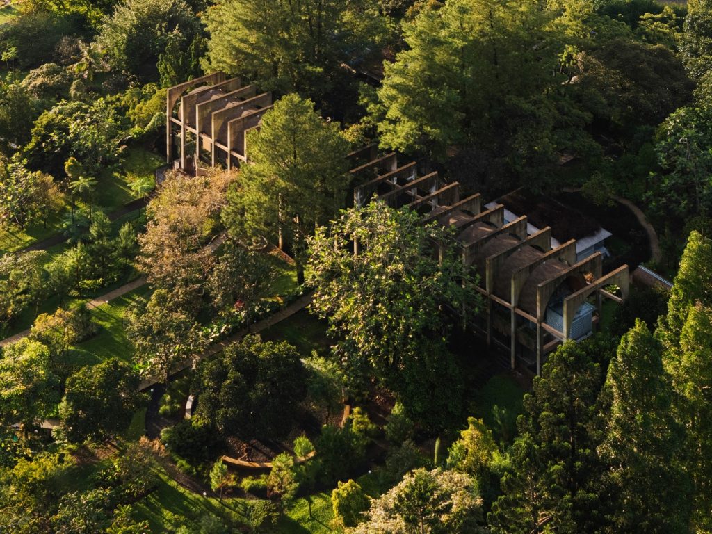 Material choices reinforce the project’s quiet confidence. Warm teak ceilings, off white walls, and pale Palimanan stone floors establish a restrained palette that supports the architecture without drawing attention away from form and landscape. These materials soften the geometry, allowing the building to recede into its surroundings while maintaining a clear silhouette when viewed from afar.
