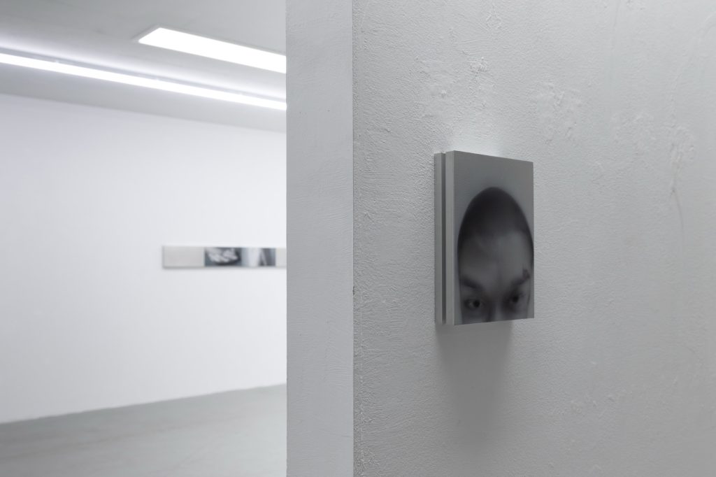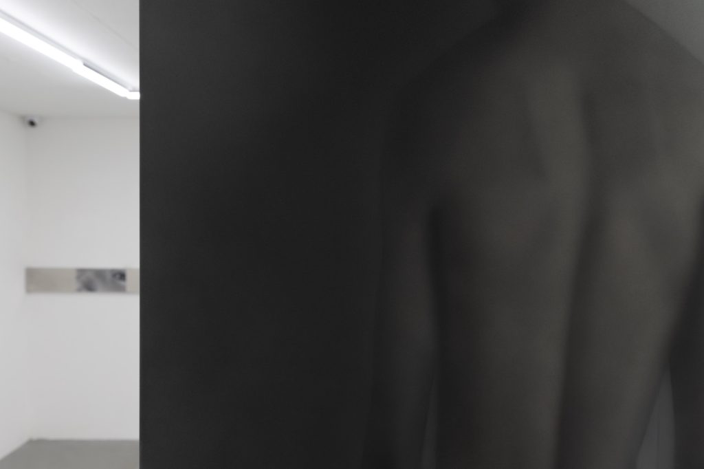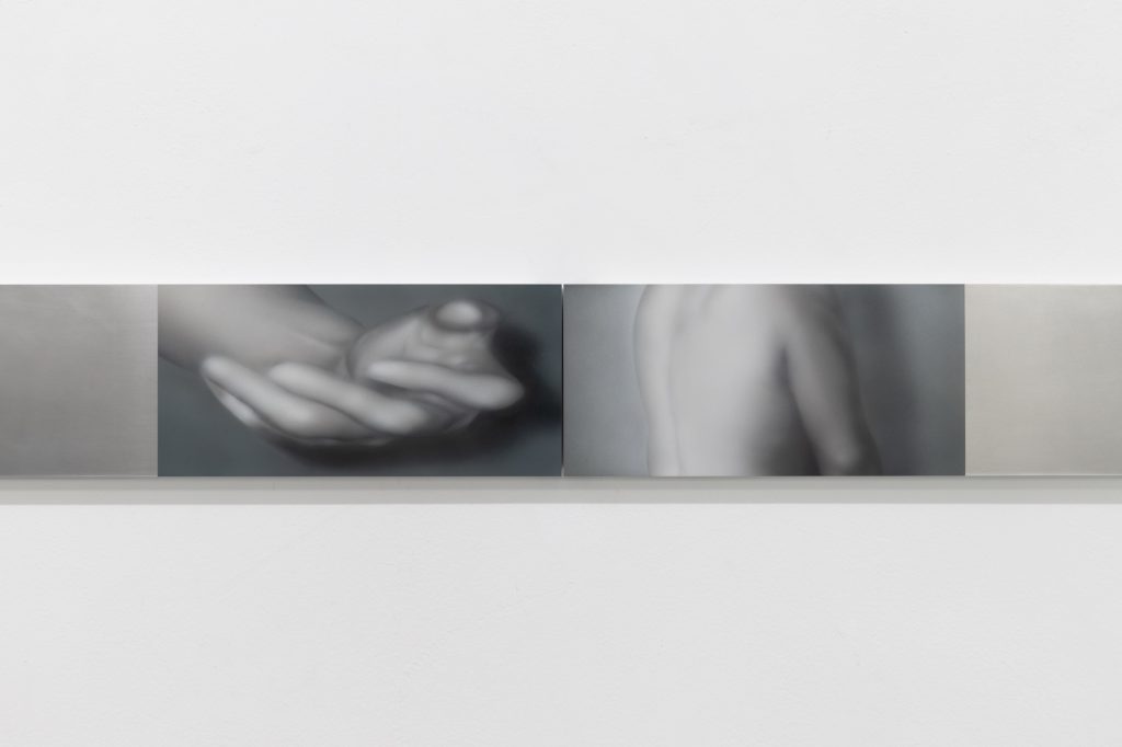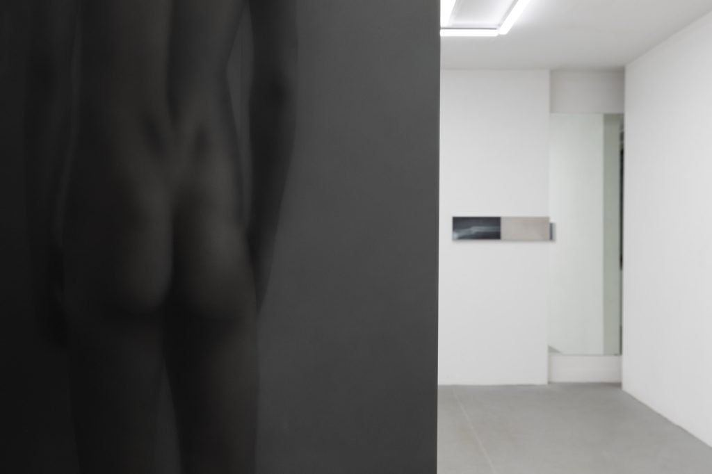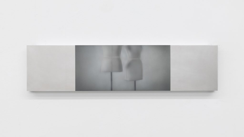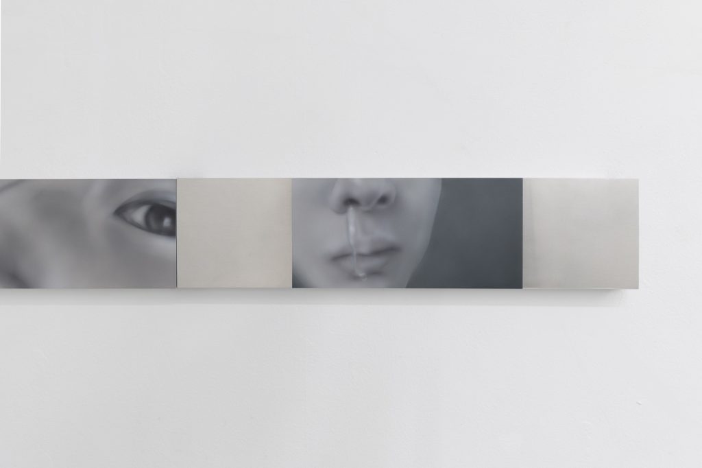 Yet the atmosphere is far from pastoral. Muted, spectral hues seep into the compositions, casting a subdued, almost dystopian light. Figures and forms appear partially dissolved, as if negotiating their own visibility. Fragmented elements, at times suspended on metal supports, introduce a subtle architectural tension within the gallery space. These structural insertions complicate the pictorial field, suggesting a world in which organic matter and industrial systems coexist in precarious alignment.
