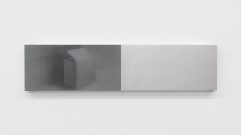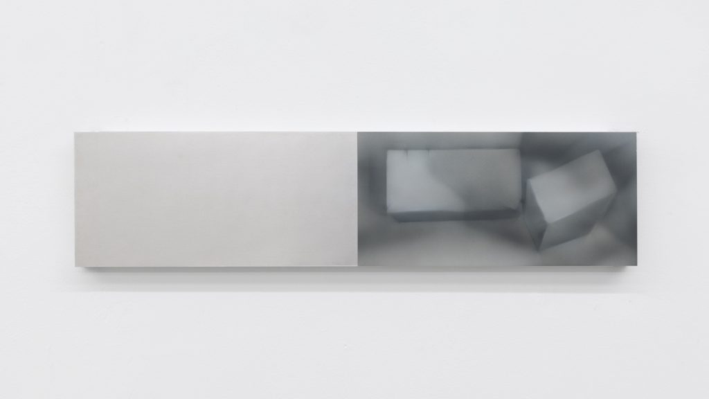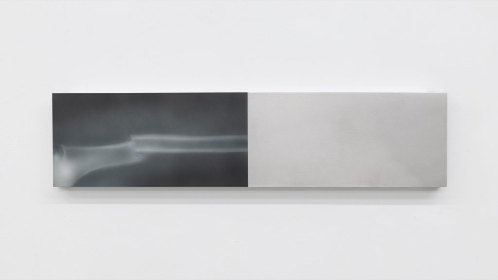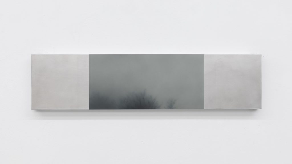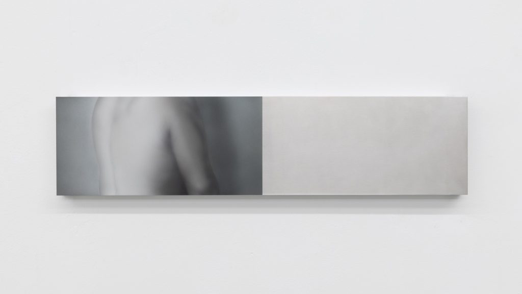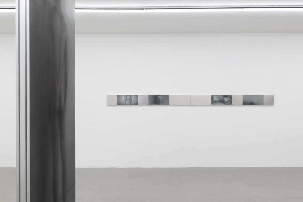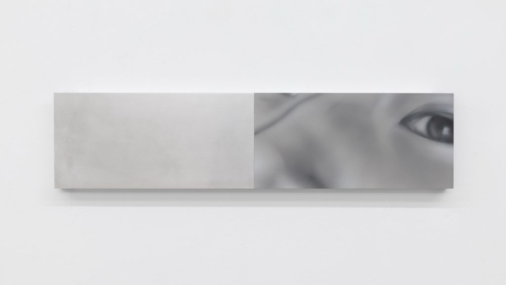 Yet the atmosphere is far from pastoral. Muted, spectral hues seep into the compositions, casting a subdued, almost dystopian light. Figures and forms appear partially dissolved, as if negotiating their own visibility. Fragmented elements, at times suspended on metal supports, introduce a subtle architectural tension within the gallery space. These structural insertions complicate the pictorial field, suggesting a world in which organic matter and industrial systems coexist in precarious alignment.