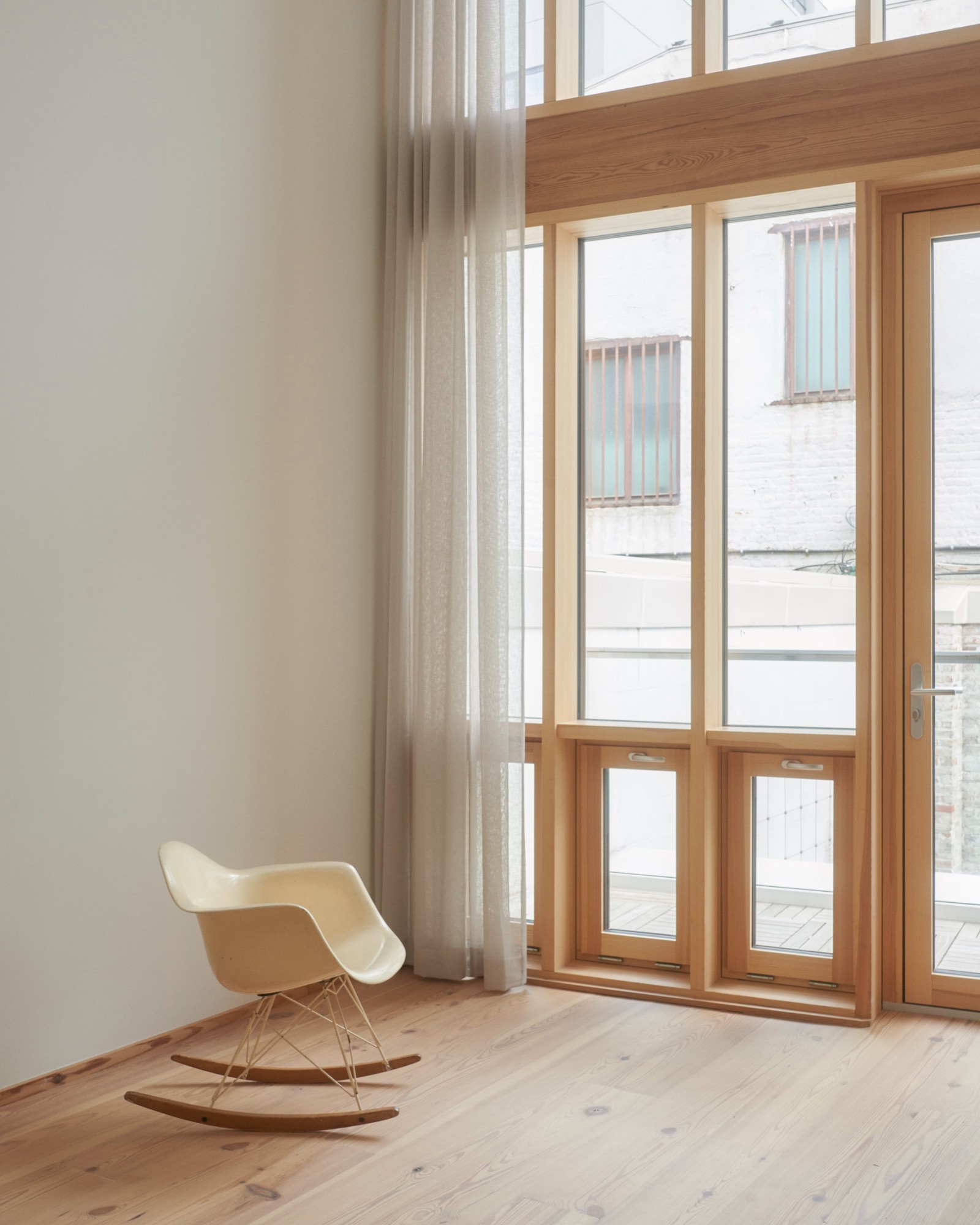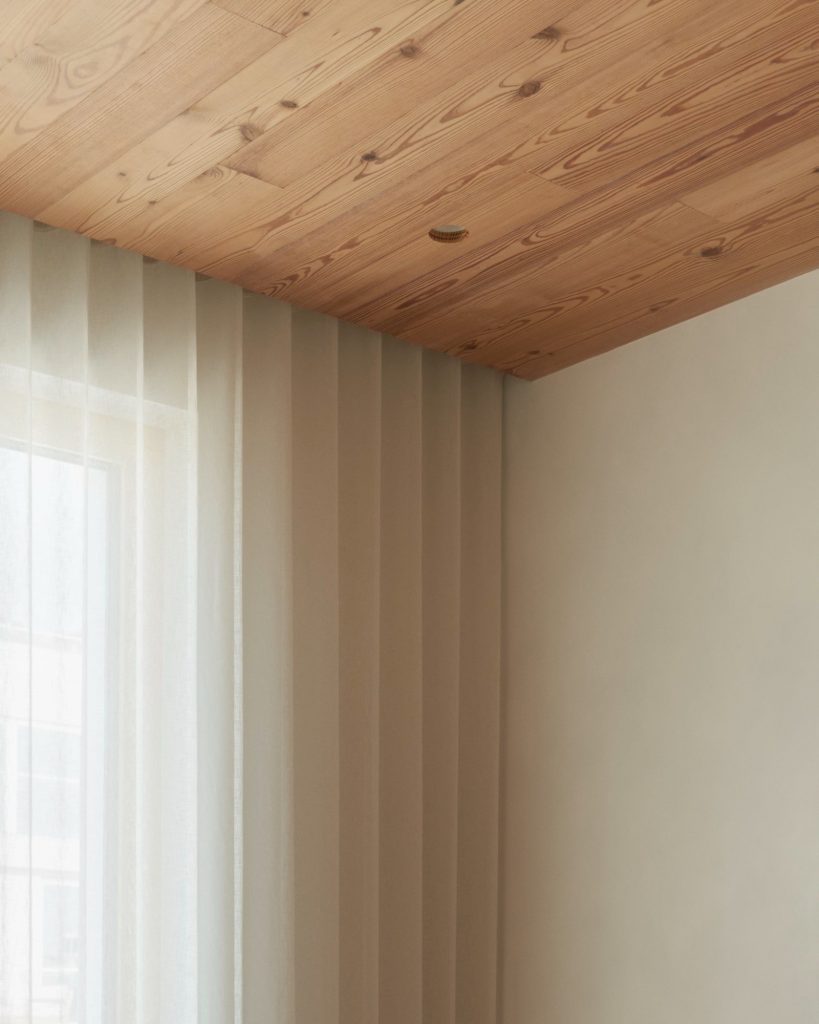 The project was designed to go beyond New York City’s Zone Green standards. High performance triple glazed windows exceed energy code requirements, balancing insulation with increased access to daylight. The building is all electric, using high efficiency heating and cooling systems to support healthier indoor air quality and steady comfort. Reclaimed heart pine adds more than character, reducing embodied carbon while bringing a sense of permanence to the interiors.