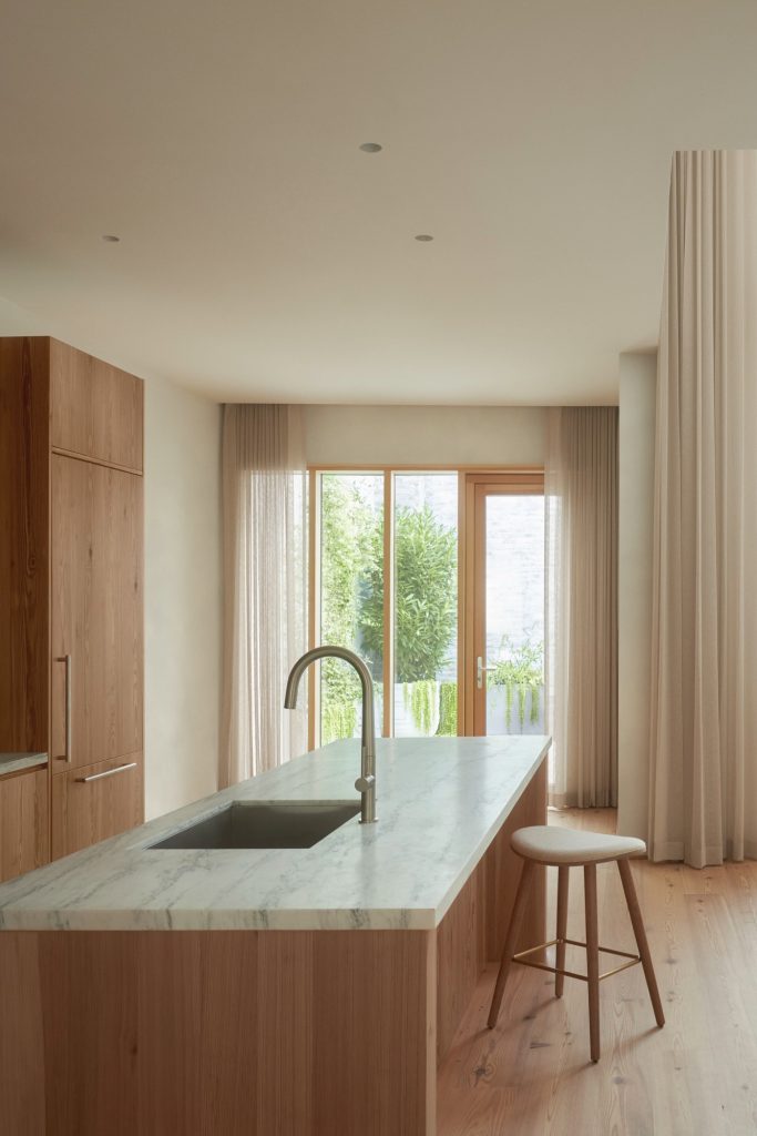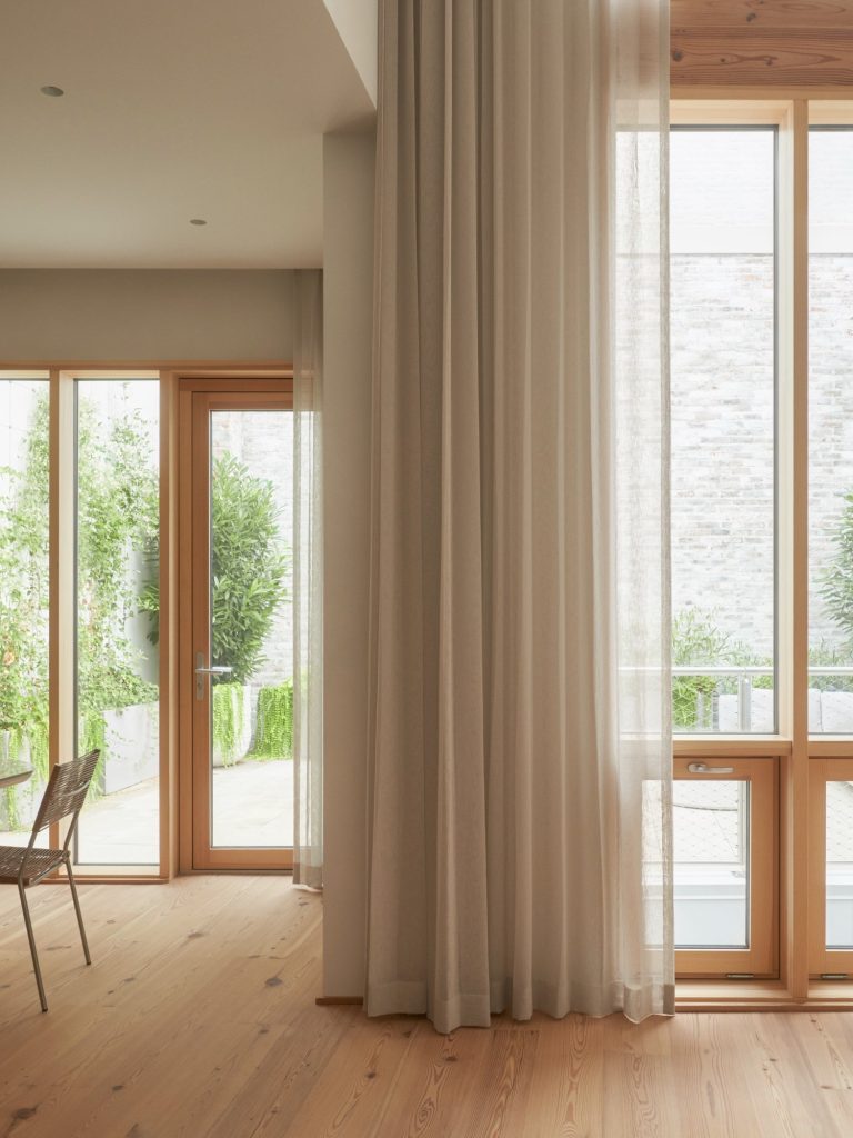 The entire rear is wrapped in fluted terracotta tile by Shildan, detailed with a profile that echoes an S curve found in the interior linen curtains. It is a rare, almost intimate gesture: the exterior does not simply represent the interior, it quietly quotes it.