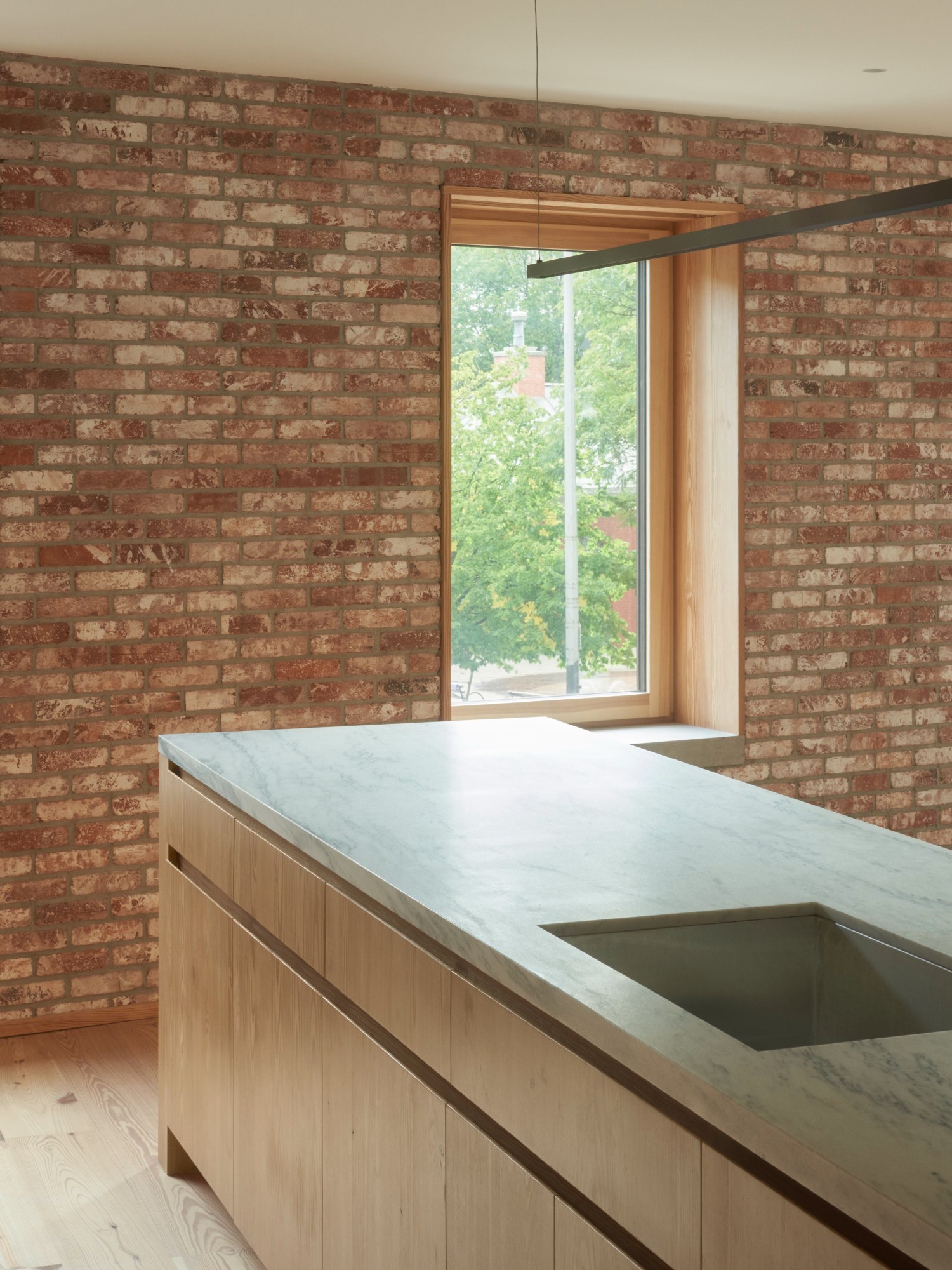 A major part of that atmosphere comes from reclaimed heart pine supplied by Madera Surfaces. Salvaged from a mid nineteenth century building in Queens scheduled for demolition, the wood reappears throughout the project in flooring, cabinetry, window casings, and door surrounds. The choice nods to the original heart pine common in nearby townhouse interiors and former factory buildings, but it also does something more immediate: it softens the glass and volume with a warmth that feels lived in from day one.