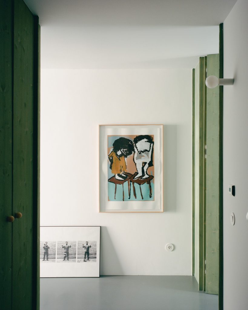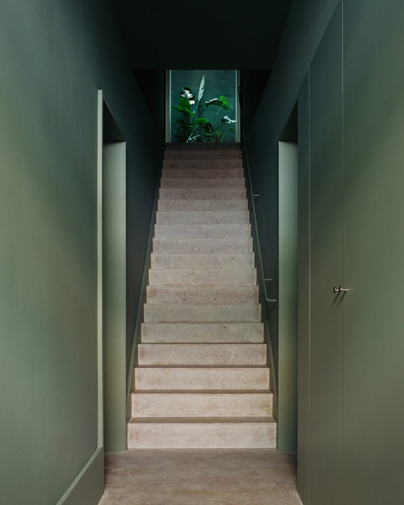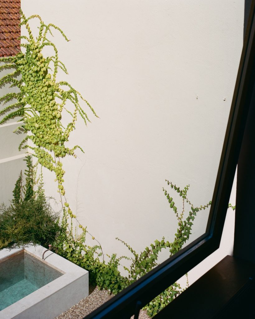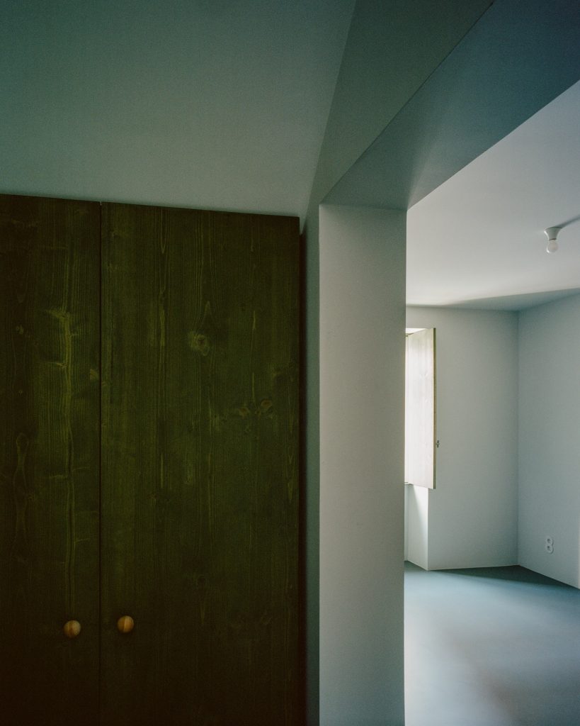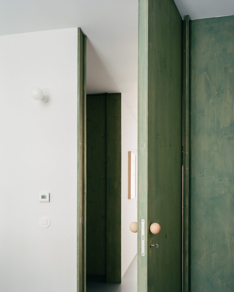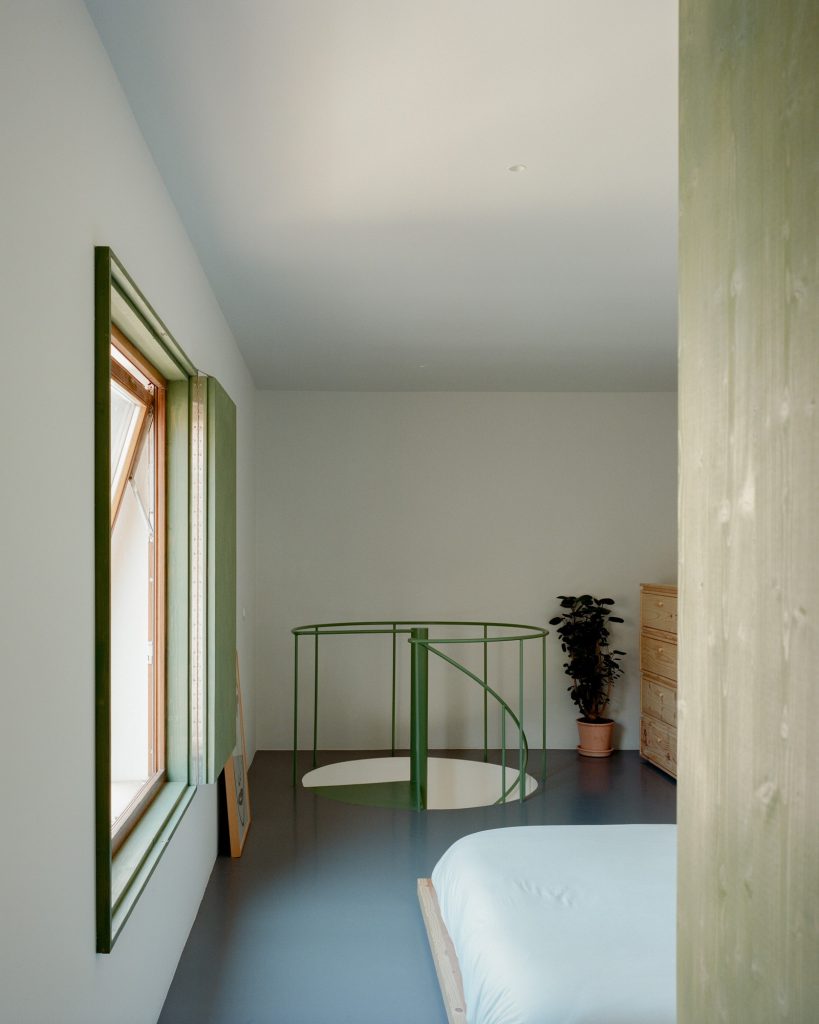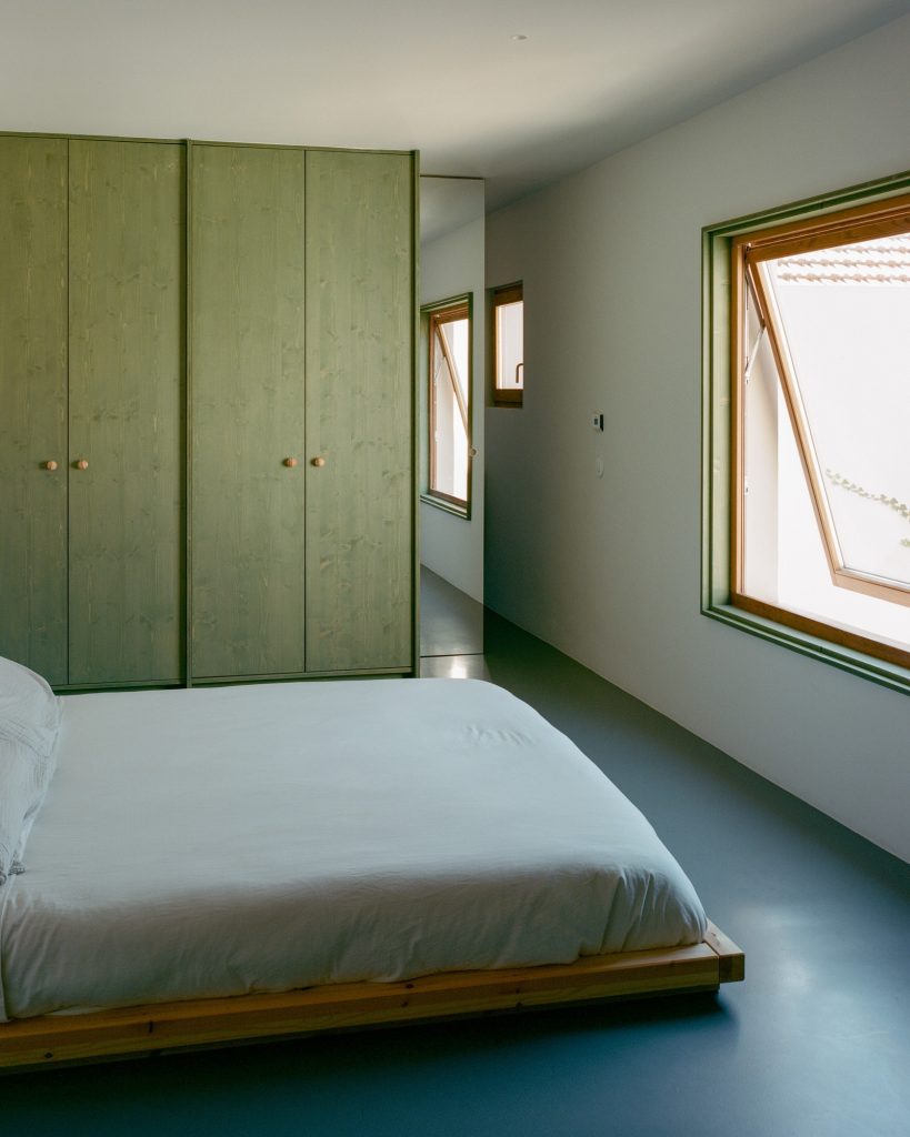 Inside, familiar materials are repeated with care and adjusted until structure and surface feel continuous. Structural wood panels, treated with green oil, introduce a restrained vegetal tint, while a slightly bluish industrial floor steadies the spaces with pragmatic calm. Painted steel sheets add a precise, workmanlike sheen, and wooden frames hold the construction with understated clarity. Natural elements sharpen the sensory register: Sintra limestone brings density and coolness, while river pebbles add texture underfoot and a quiet reminder of water’s presence. Together, these choices form a palette that balances utility with pleasure, privileging touch, light, and time over effect.