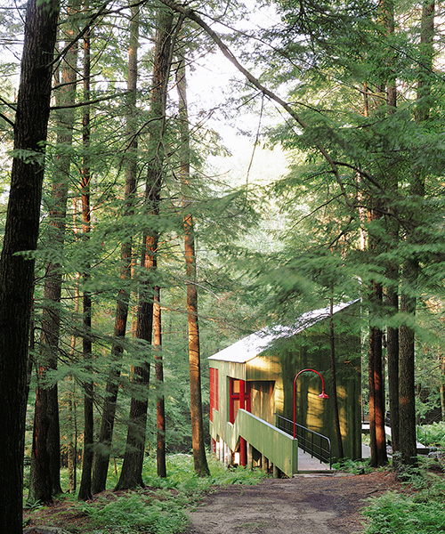 Detail of the green-stained cedar exterior hovering above boulder-strewn ground. Credit: Photo courtesy of Buildings of New England / Bohlin Cywinski Jackson.