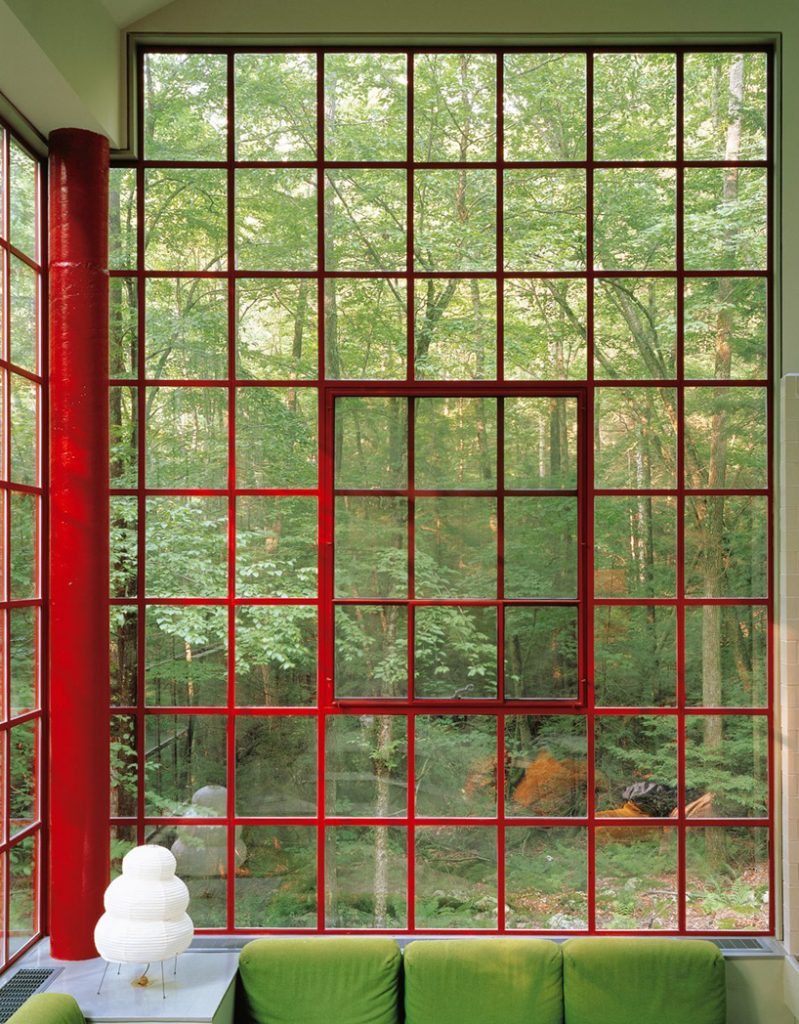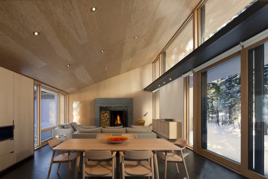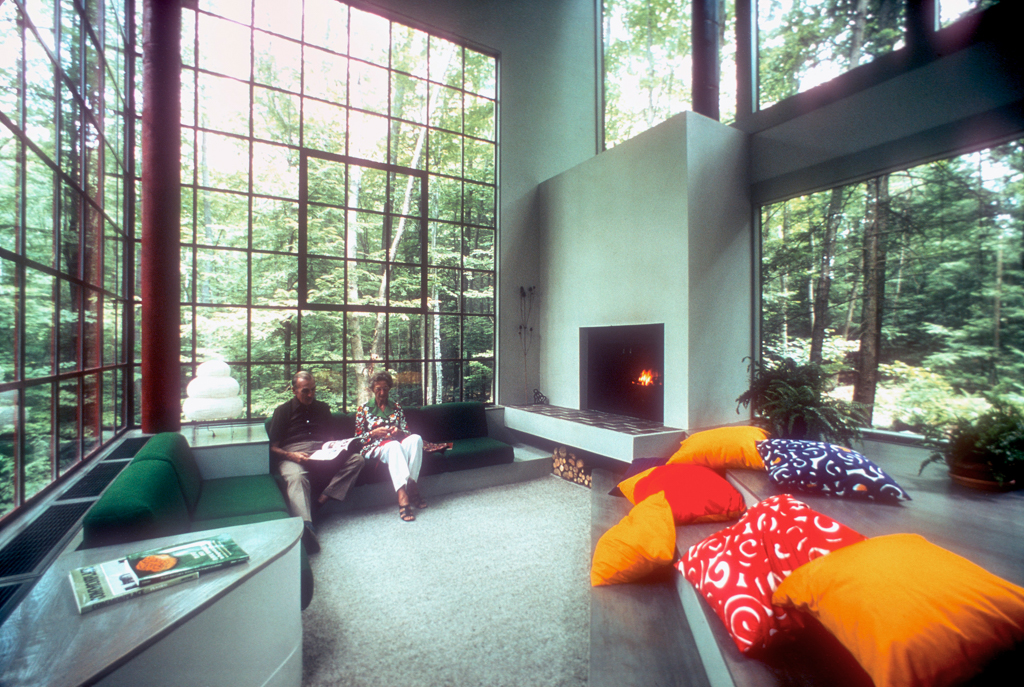 Interior living space with large grid windows inviting forest light, shadow, and seasonal change. Credit: Courtesy of Bohlin Cywinski Jackson.