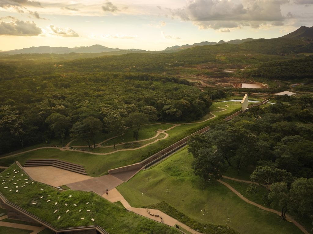 Designed by Gustavo Penna Arquitetos Associados, the memorial is structured less as a standalone object than as a sequence. The visitor is drawn from an entrance pavilion in concrete stained with mining waste into a landscape of pause points, grove, exhibition rooms, and water.