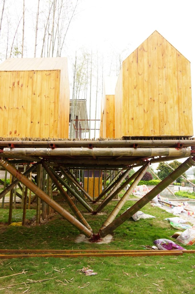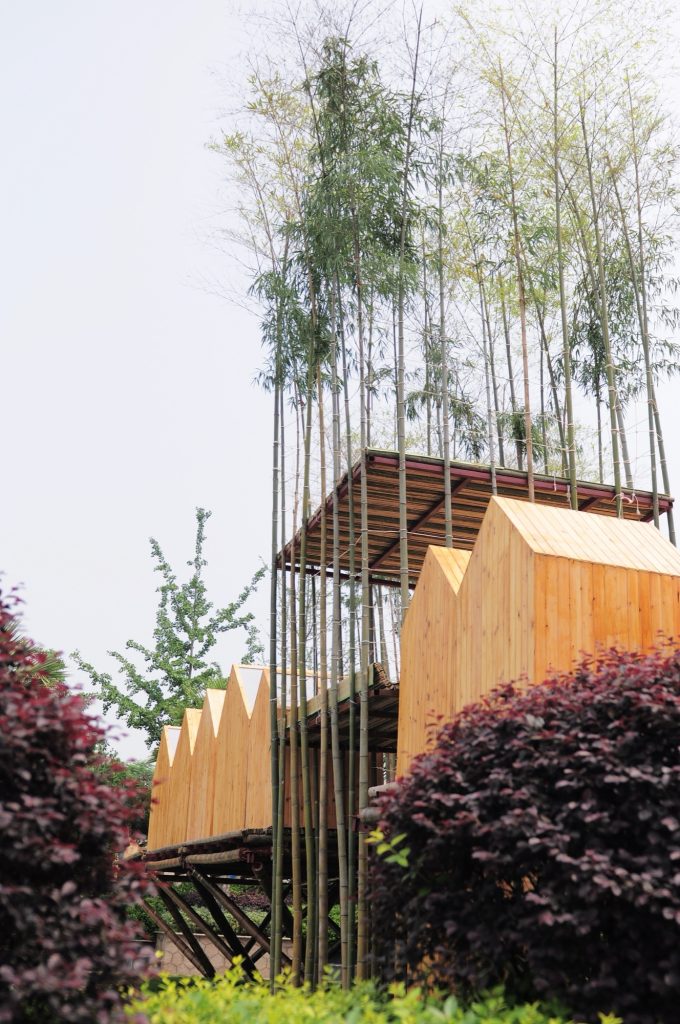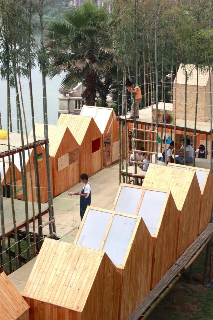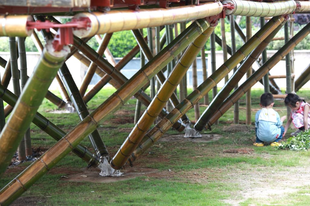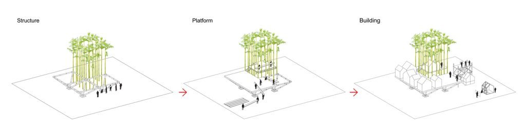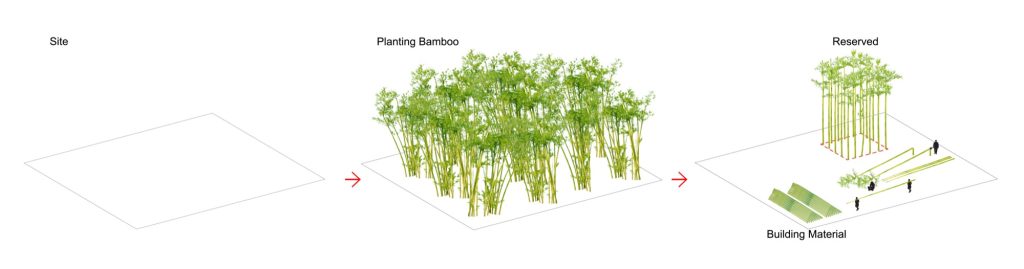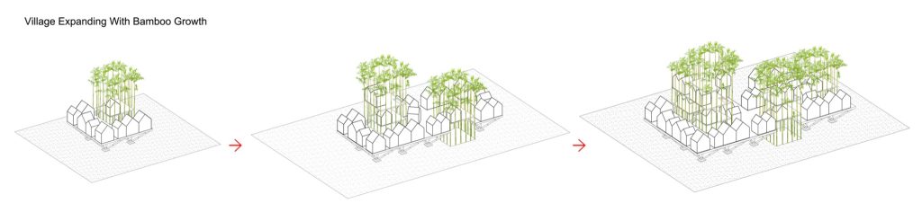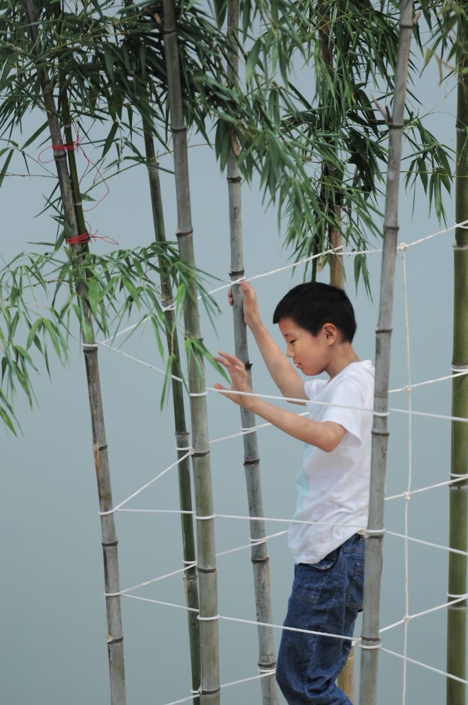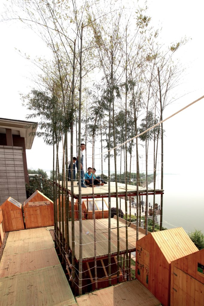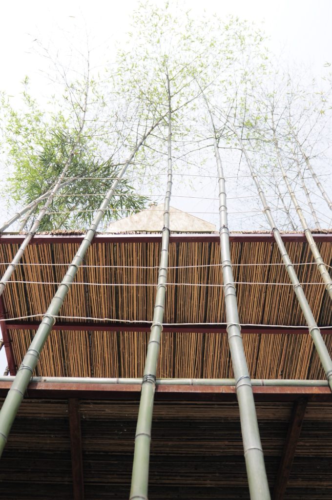 The workshop began by transplanting living bamboo to form two bamboo “houses” built to a repeated module of 3 by 3 by 8 meters. Transverse elements joint and fix the frame, opening it into outdoor terraces and play rooms. These bamboo houses sit within the wider landscape as both architecture and environment, part structure, part grove.
