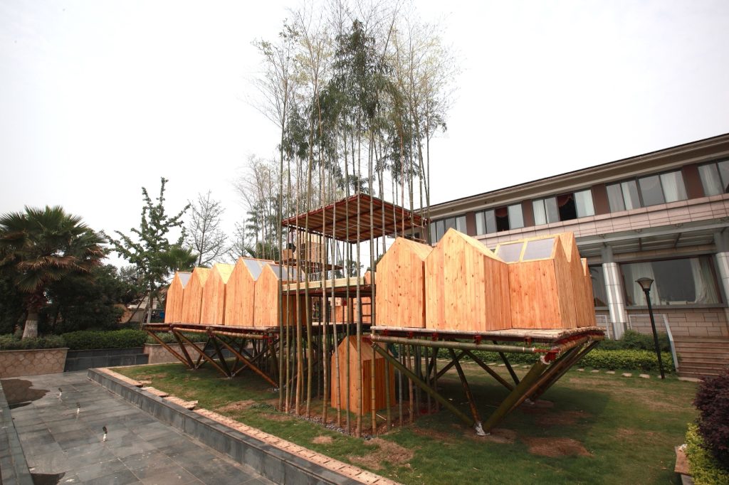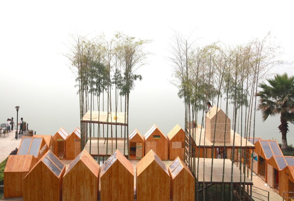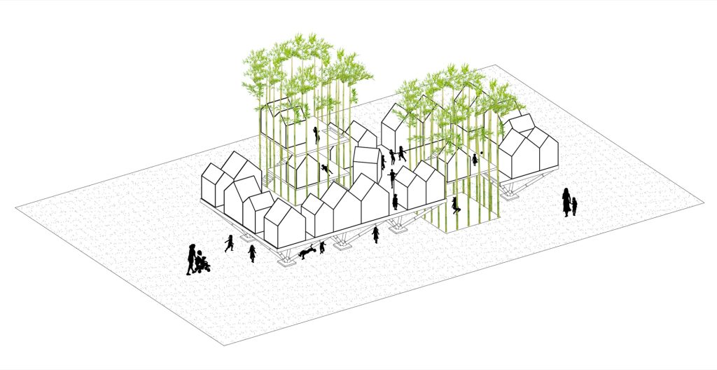 From there, natural bamboo becomes the primary load bearing system of City in Sky. The larger structure is organized into eight units based on the same 3 by 3 meter logic, a disciplined grid that children can understand and occupy without losing orientation. The project claims a striking efficiency: about 90 square meters of floor area created from a footprint of roughly 3 square meters of foundation. An inverted pyramid profile amplifies the sensation of hovering, making the “houses” read as if they are suspended rather than planted.