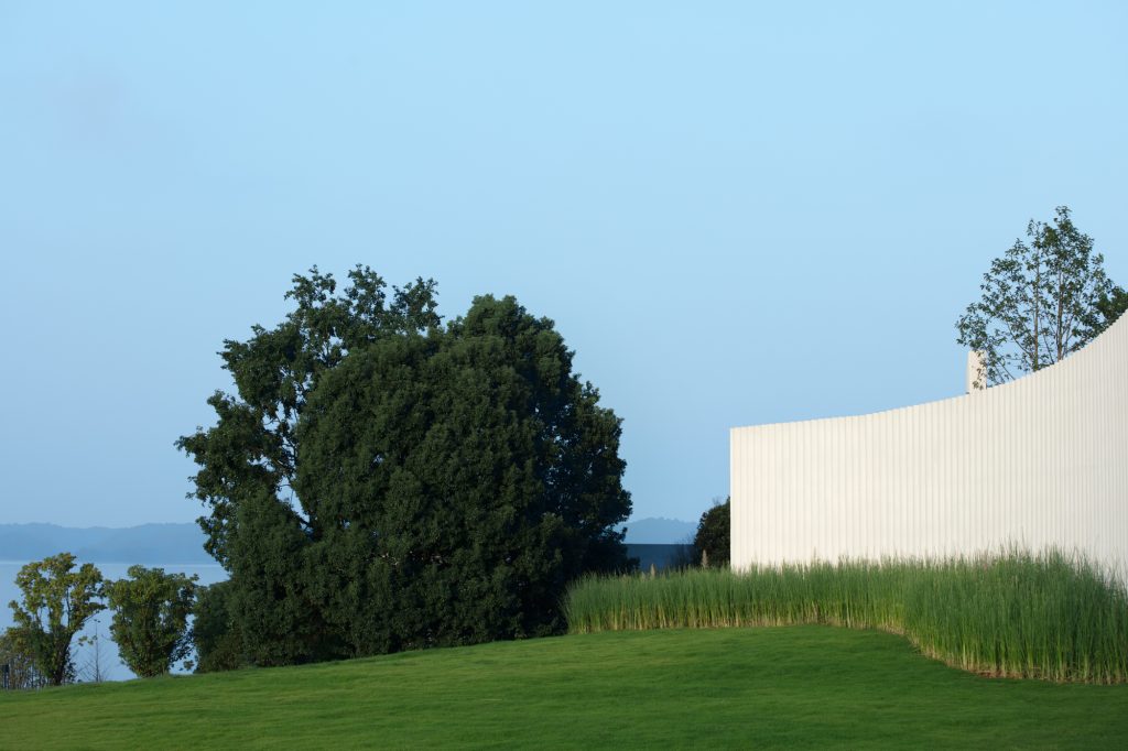 Interventions to the existing building are equally precise. A small western structure was removed to reopen sightlines and restore a clearer relationship between the volume and the landscape. Extensions to the east and west strengthen the building’s connection to the site, while the interior largely retains its original structure, supplemented by a cross-arch system that echoes the ridge language outside. New transparent façades make the art center deliberately permeable, allowing views to pass through galleries and public rooms toward the lake and horizon beyond.
