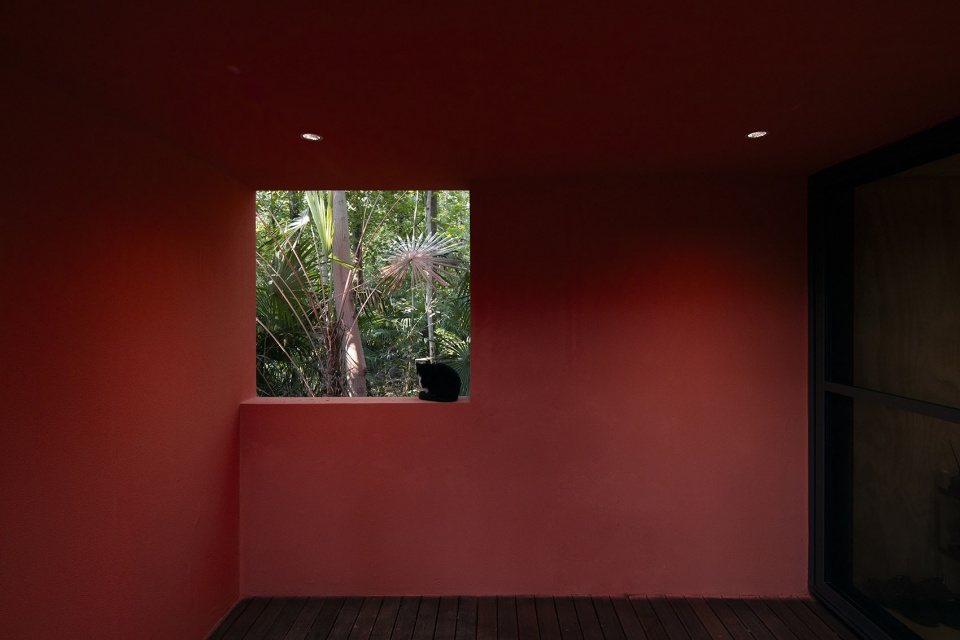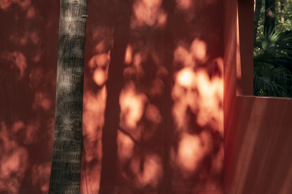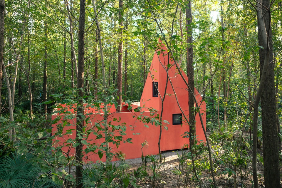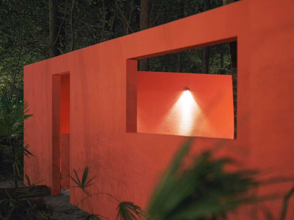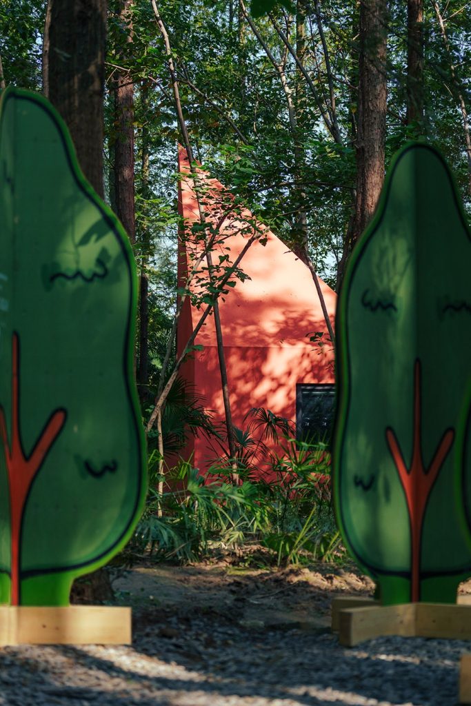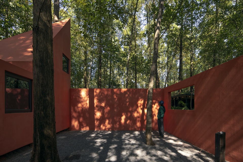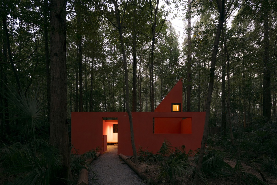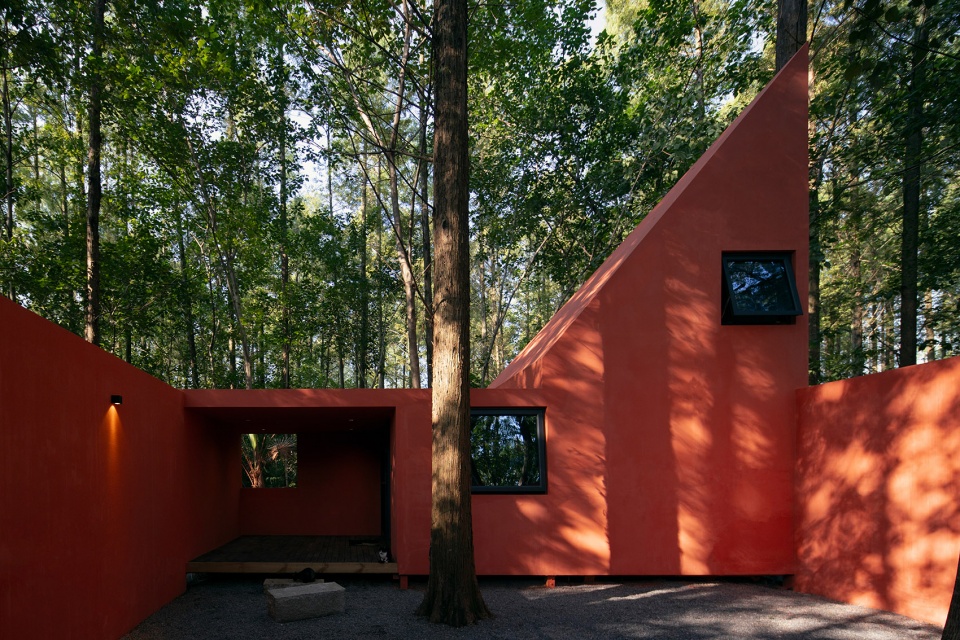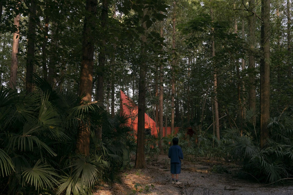 Wiki World describes Red Cabin as a dancer of the forest, wrapped in pure red, and imagines the form as evolving from a red migratory bird. The metaphor is fitting, not because the building tries to mimic nature, but because it treats colour as atmosphere. In the middle of a metasequoia grove, the red envelope reads like a theatrical device, turning trunks, palm leaves, wind, and shifting light into a slow choreography beyond the walls.