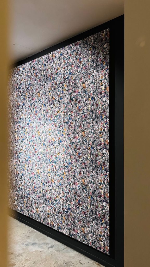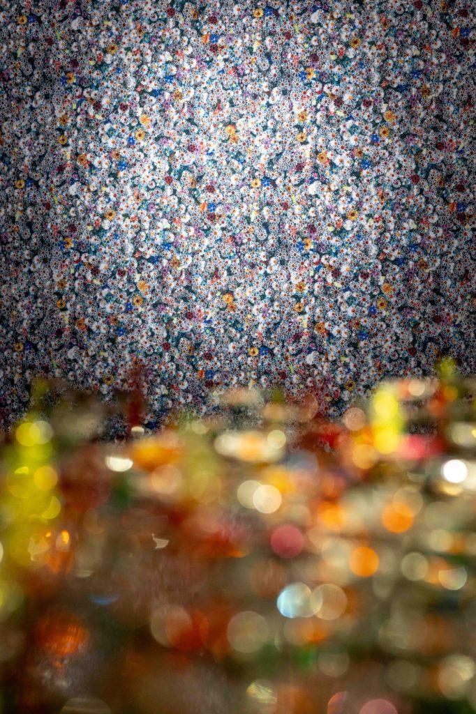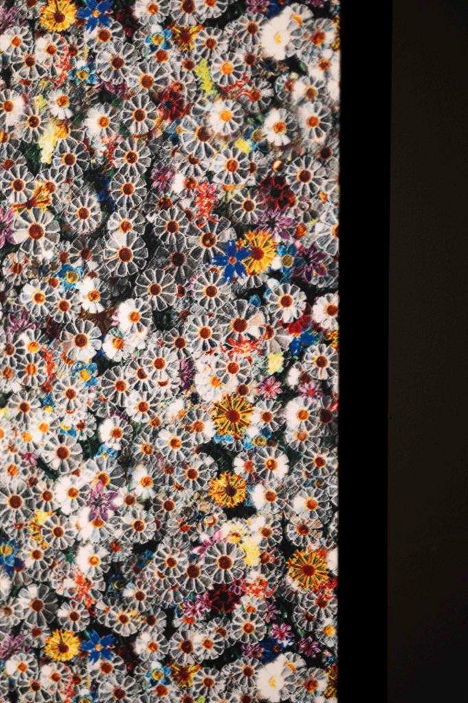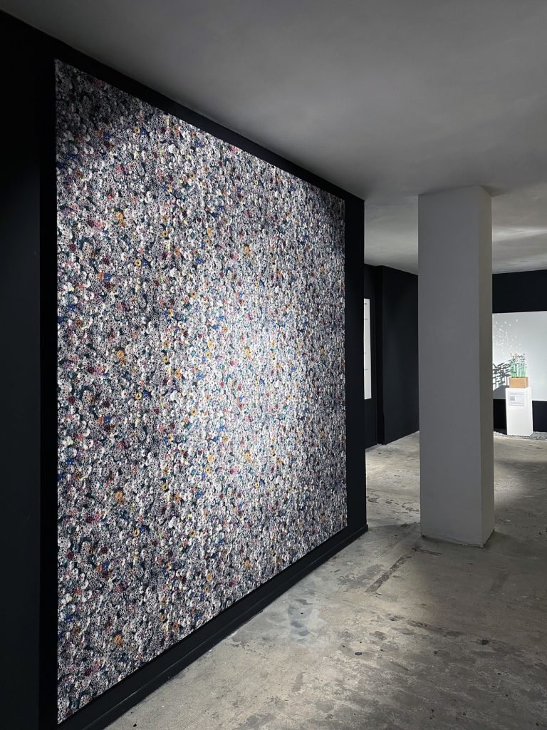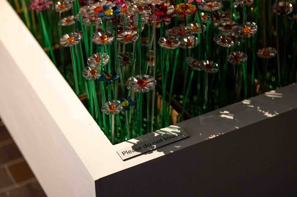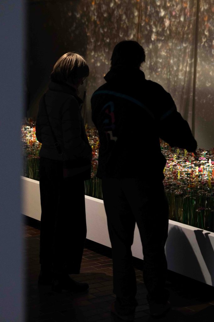 The installation unfolds within a theatrically lit space, where mirrored surfaces amplify light and multiply perception. Reflections ripple across walls and ceilings, creating a pixelated, almost digital surface that contrasts with the handcrafted nature of the flowers themselves. Visitors instinctively respond by photographing the space, capturing its visual intensity, before engaging more deeply with its conceptual foundation.