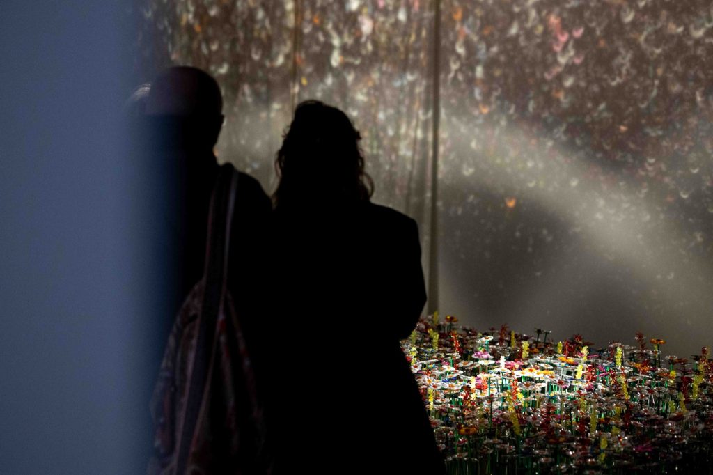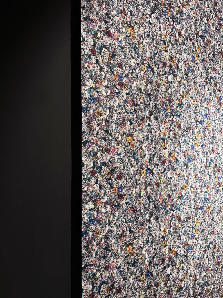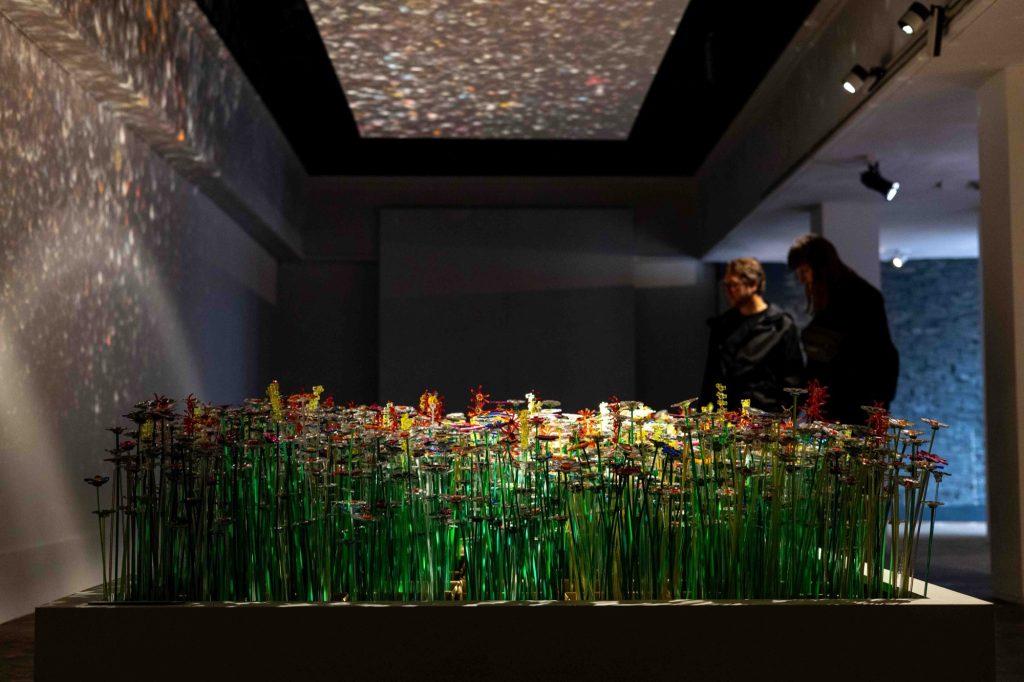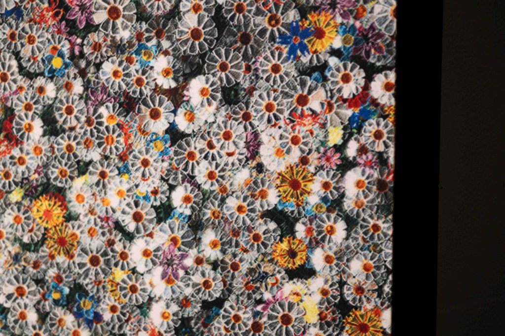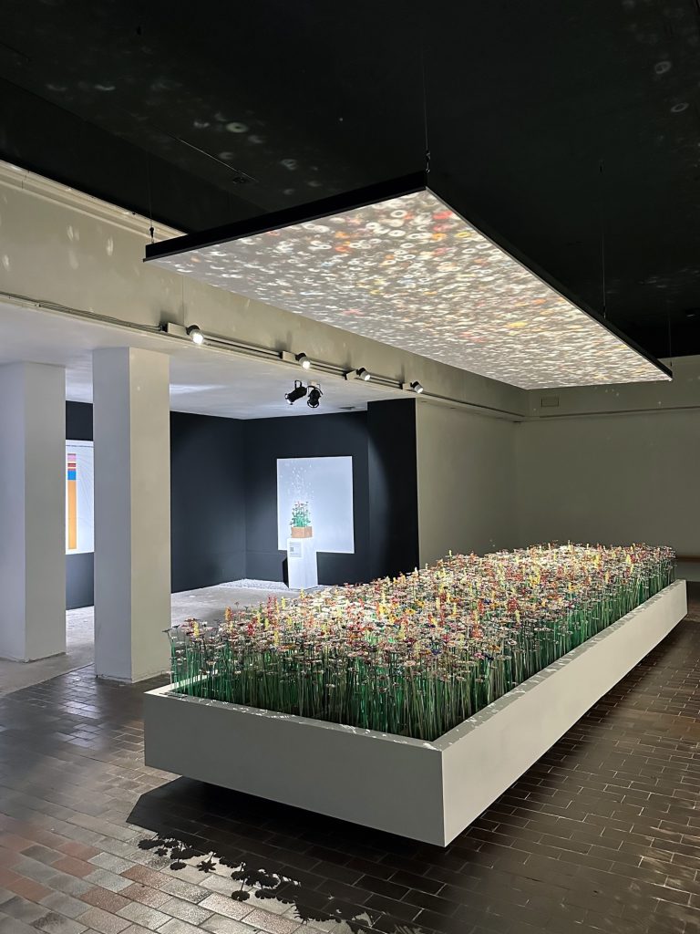 The installation unfolds within a theatrically lit space, where mirrored surfaces amplify light and multiply perception. Reflections ripple across walls and ceilings, creating a pixelated, almost digital surface that contrasts with the handcrafted nature of the flowers themselves. Visitors instinctively respond by photographing the space, capturing its visual intensity, before engaging more deeply with its conceptual foundation.