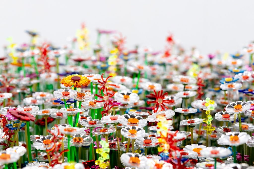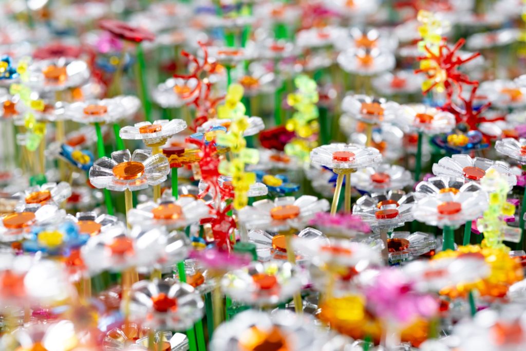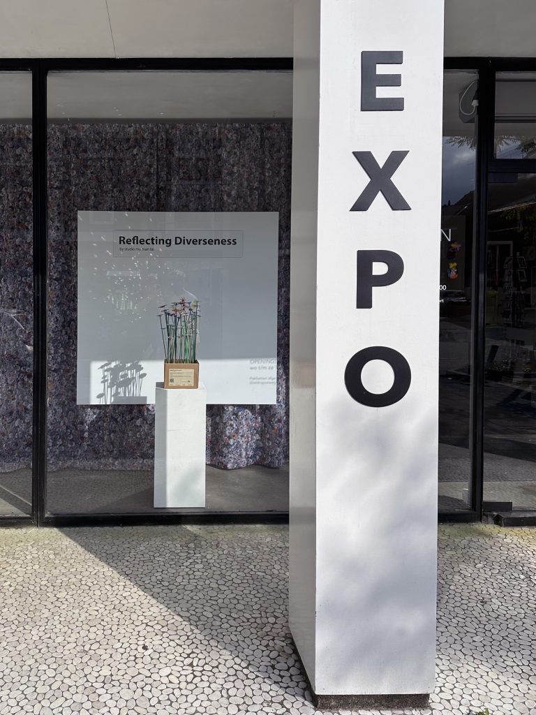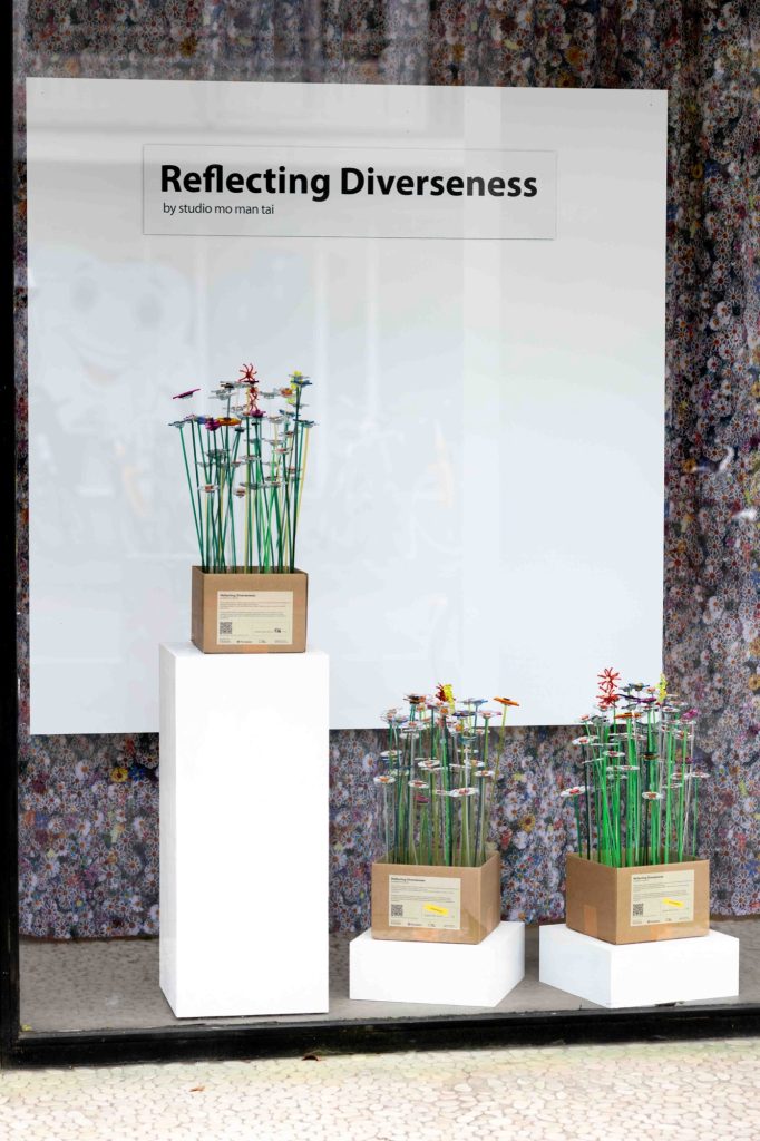 The choice of flowers is deliberate. Diversity, by definition, describes a state composed of many different elements or types. In this installation, that definition becomes spatial and experiential. Individual flowers vary in form, reflection and colour, yet together they construct a balanced visual ecosystem, mirroring the social structure they represent.
