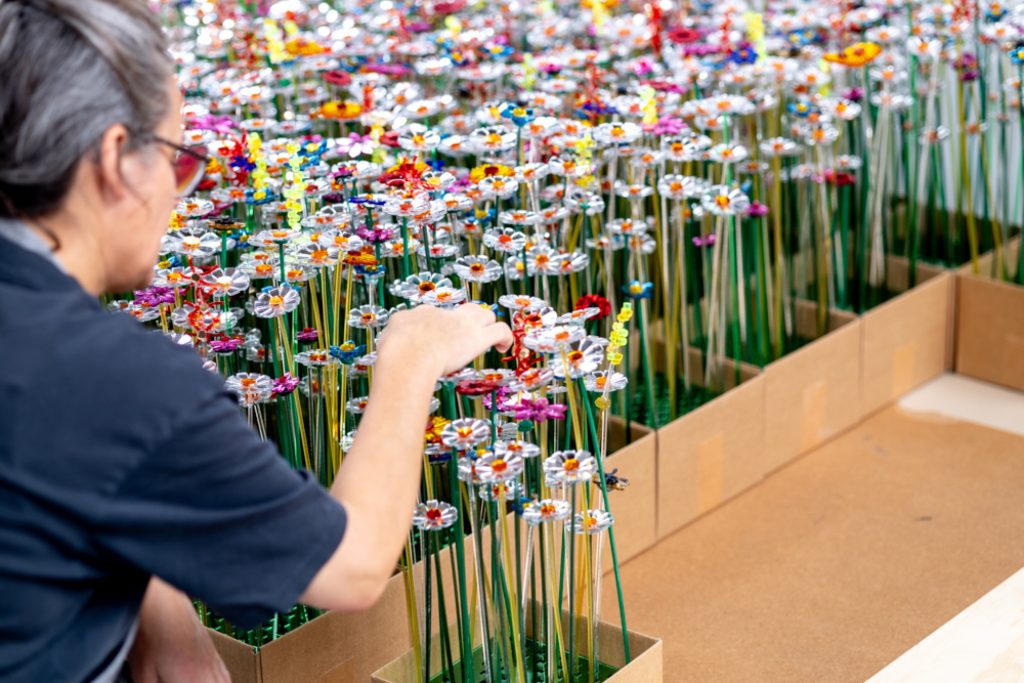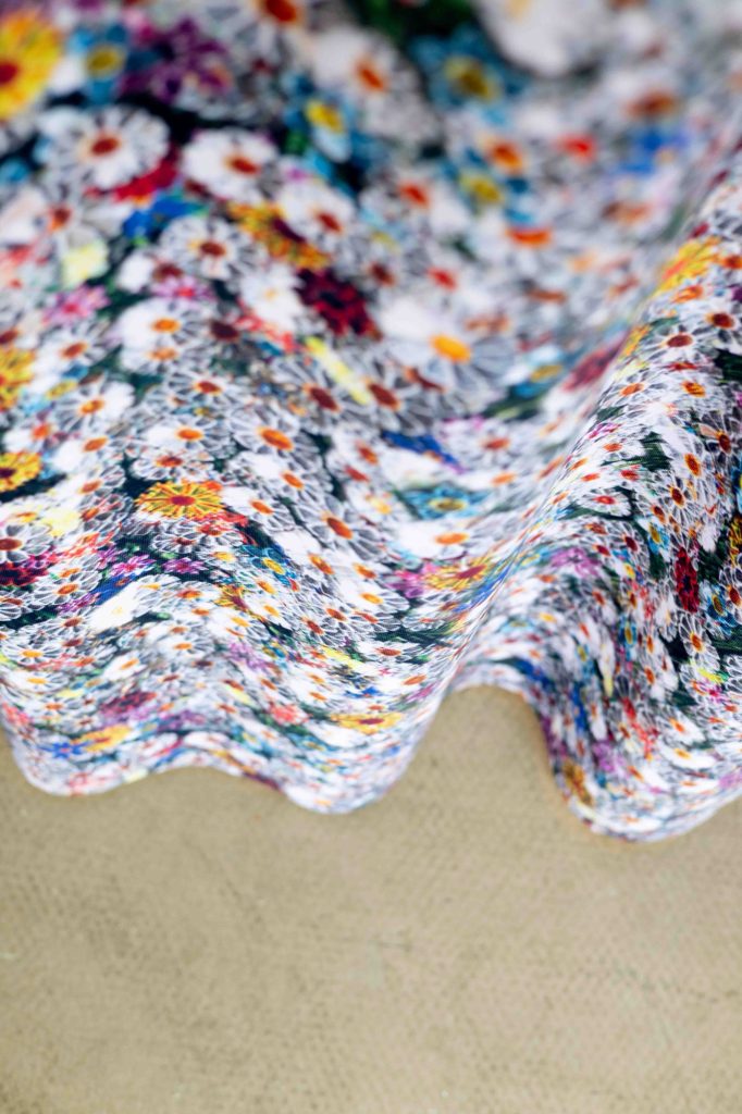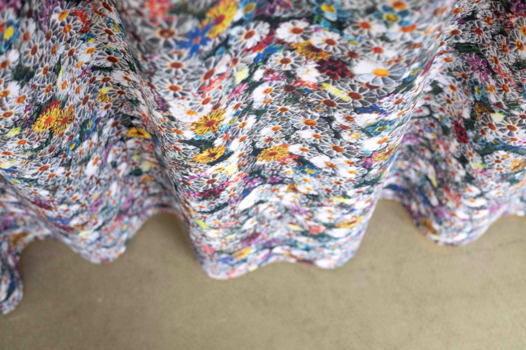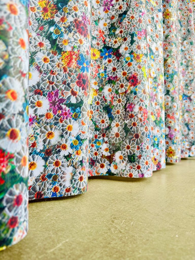 Once a critical mass of flowers was completed, the installation was documented from above and translated into a series of graphic patterns. These patterns extend the project beyond the exhibition space, appearing as fabric for the Pennings Foundation shop window and as a custom wallpaper developed with BIG Impact.