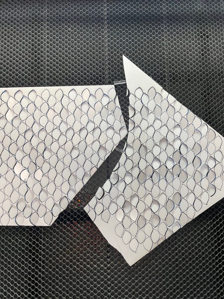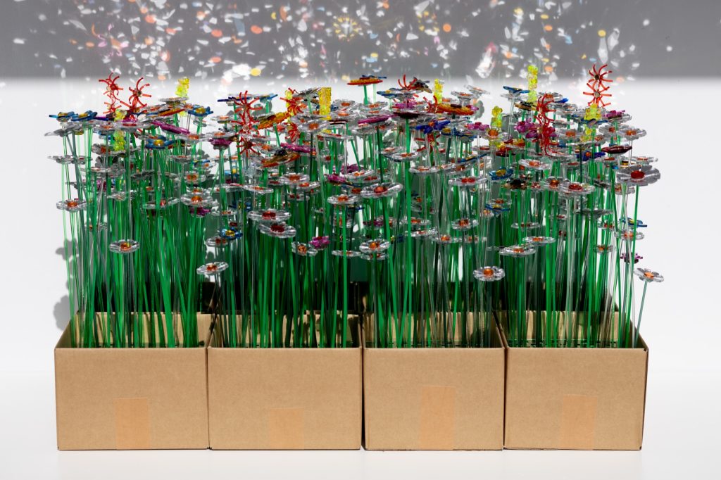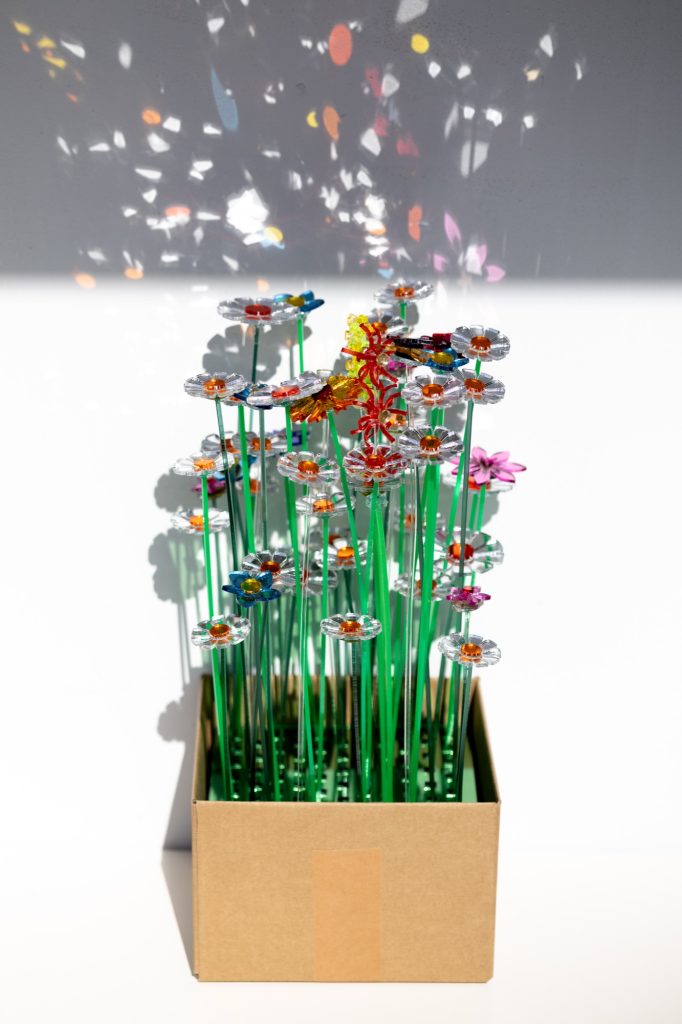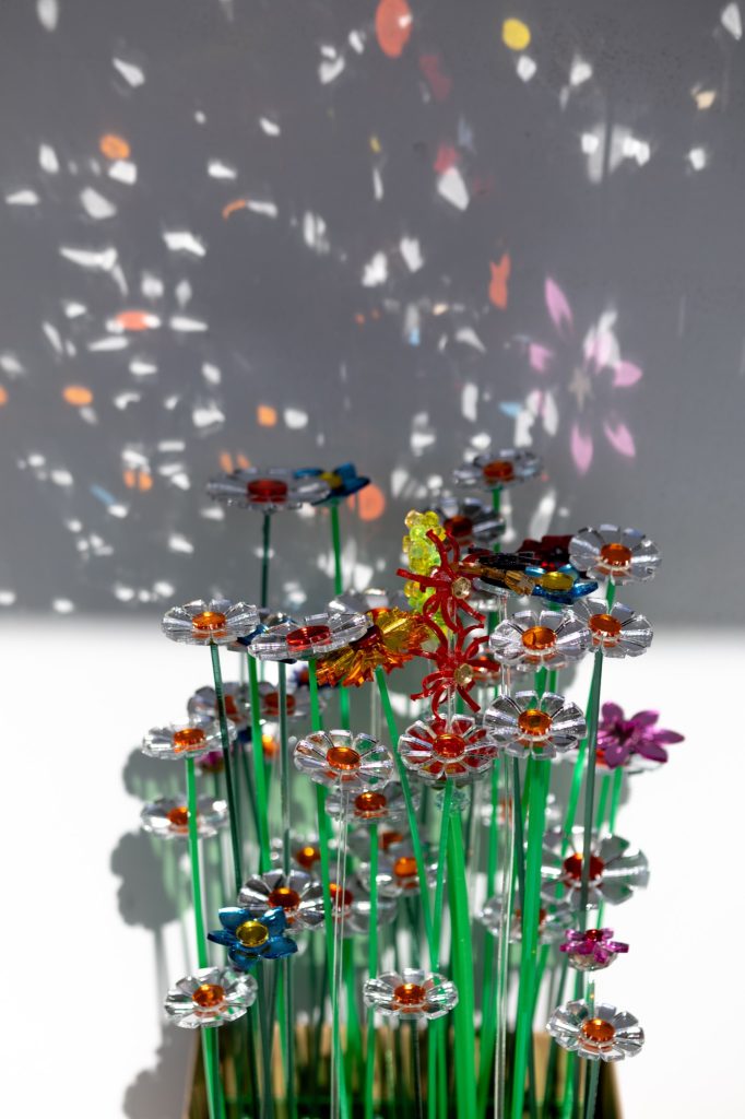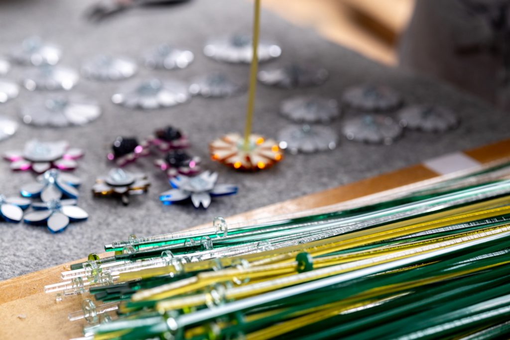 Material reuse is central to the project’s construction. Leftover acrylic mirror sheets, typically discarded as industrial waste, are laser cut into organic and geometric forms designed to maximise material efficiency and minimise loss. Each fragment is assembled by hand into flower like structures, producing subtle variations in reflection and light behaviour.
