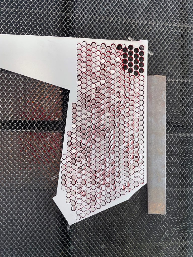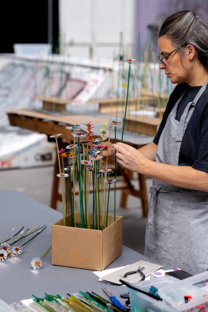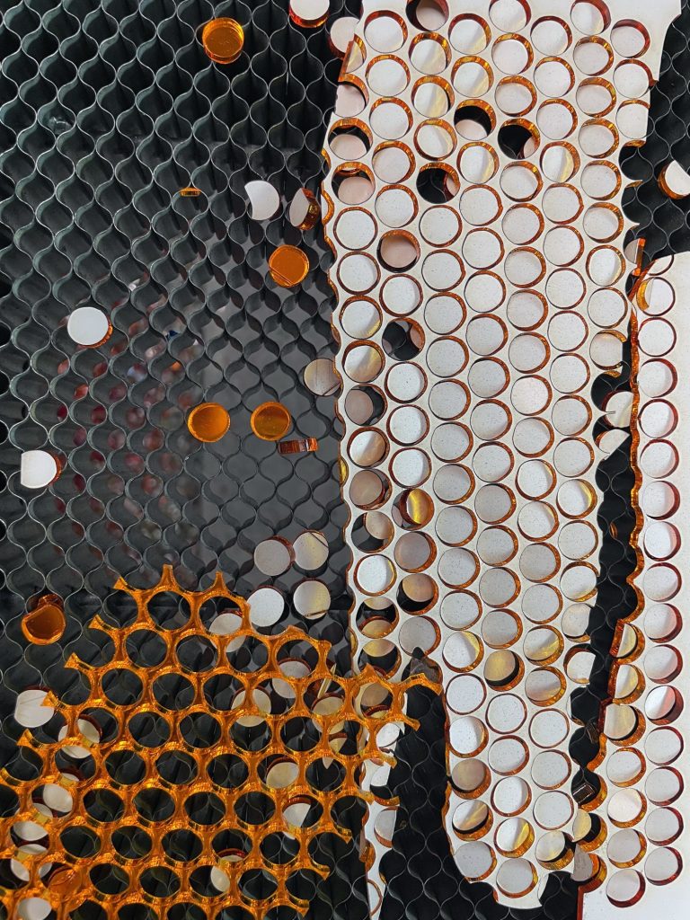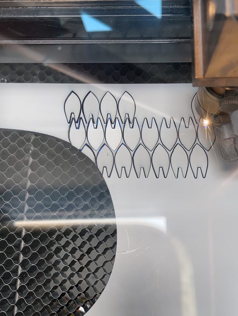 Material reuse is central to the project’s construction. Leftover acrylic mirror sheets, typically discarded as industrial waste, are laser cut into organic and geometric forms designed to maximise material efficiency and minimise loss. Each fragment is assembled by hand into flower like structures, producing subtle variations in reflection and light behaviour.