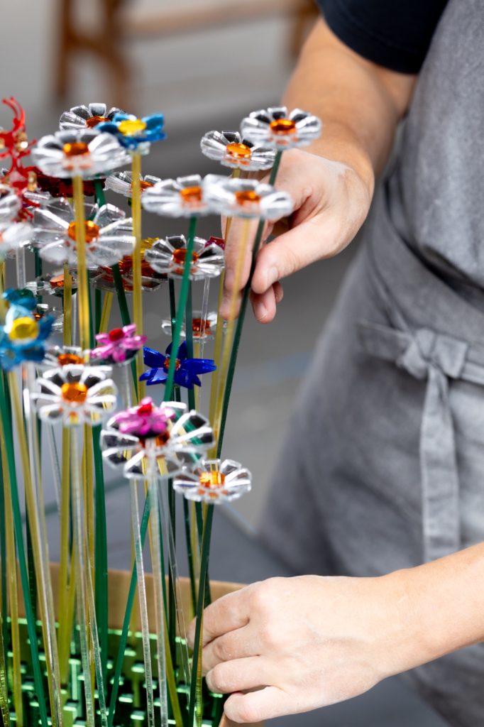 Arranged together and activated by carefully positioned spotlights, the flowers generate a dynamic field of glimmers and sparkles. Light scatters across surfaces, transforming recycled material into an ethereal environment that feels both delicate and expansive. Sustainability here is not didactic, but experiential, demonstrating how circular production can result in visual richness and spatial impact.