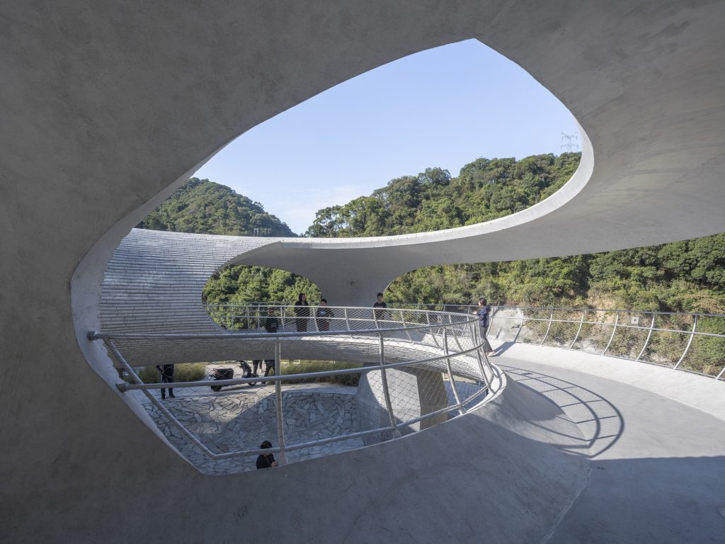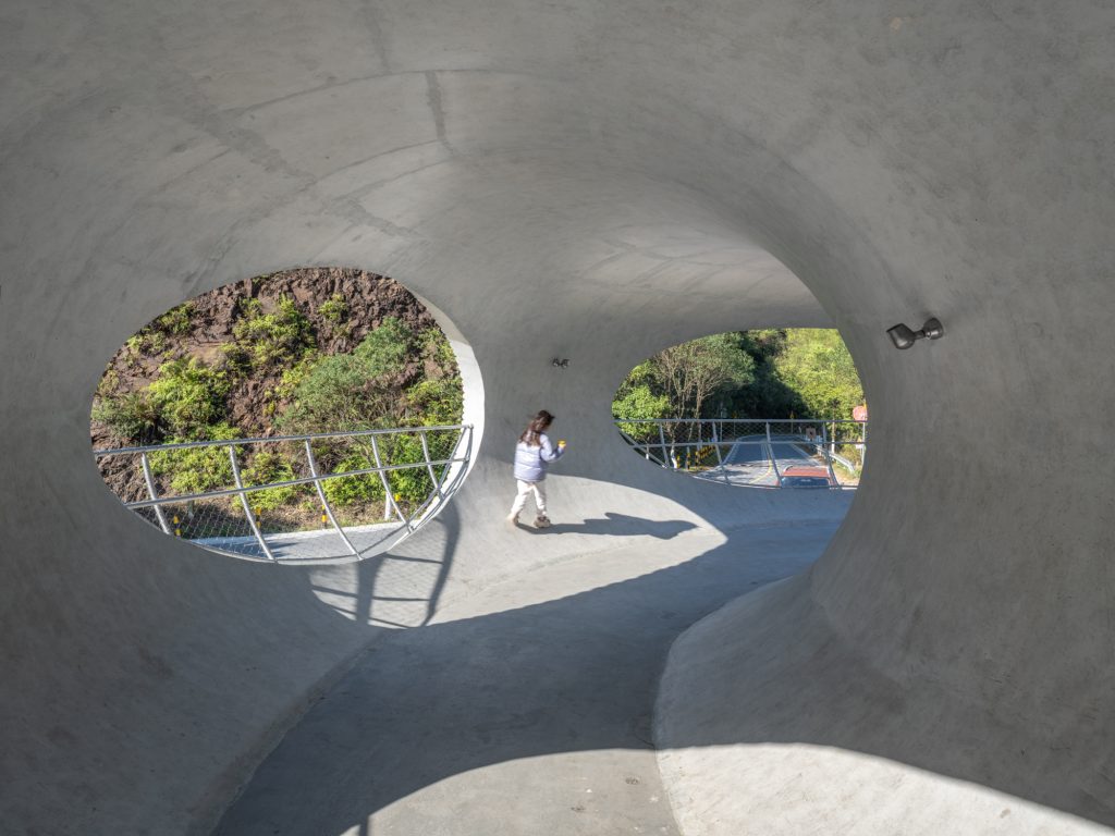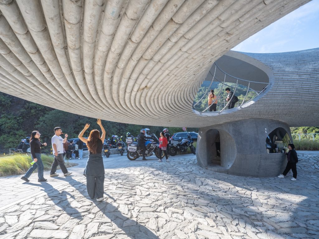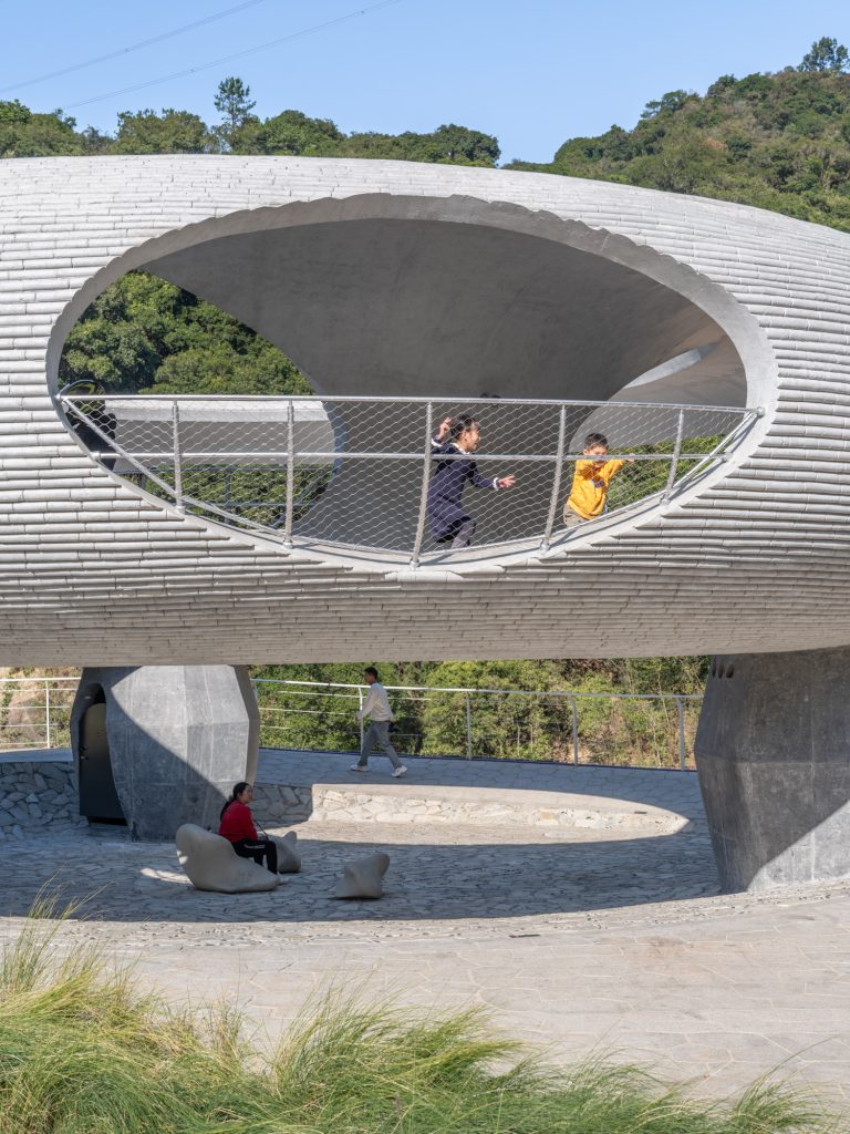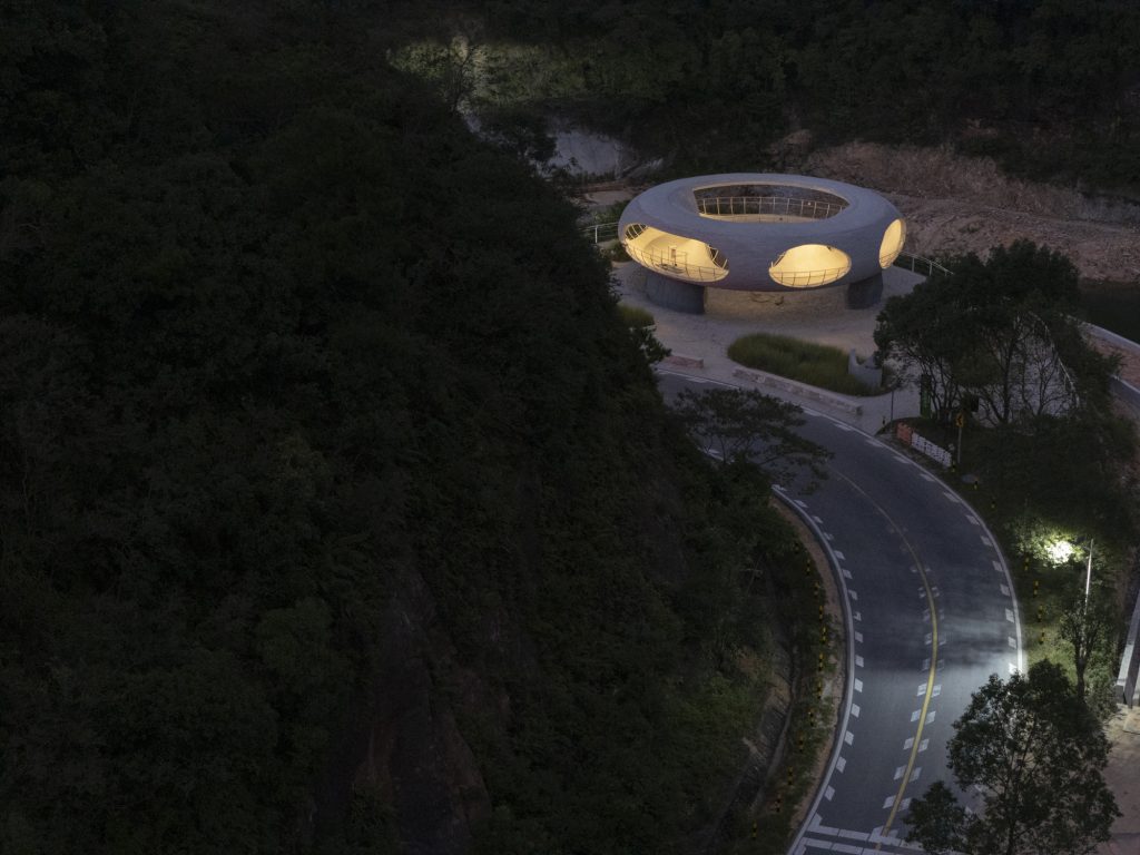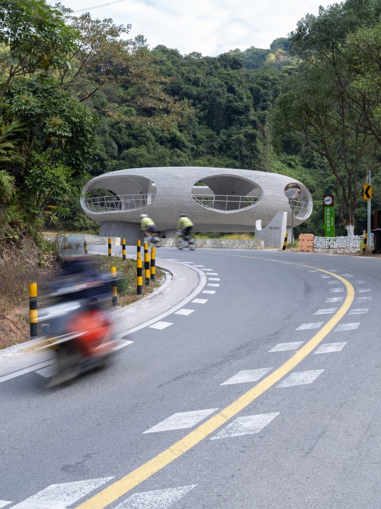 Perched on a stone platform at the foot of Mount Luofu, this project occupies an unlikely leftover. Squeezed between a highway and a parallel river, the site once worked as a buffer zone and an informal parking pocket at a tight bend. Today, it has been reimagined as a cycling rest stop and lookout, pairing practical services with a carefully staged relationship to water, sky, and hills.