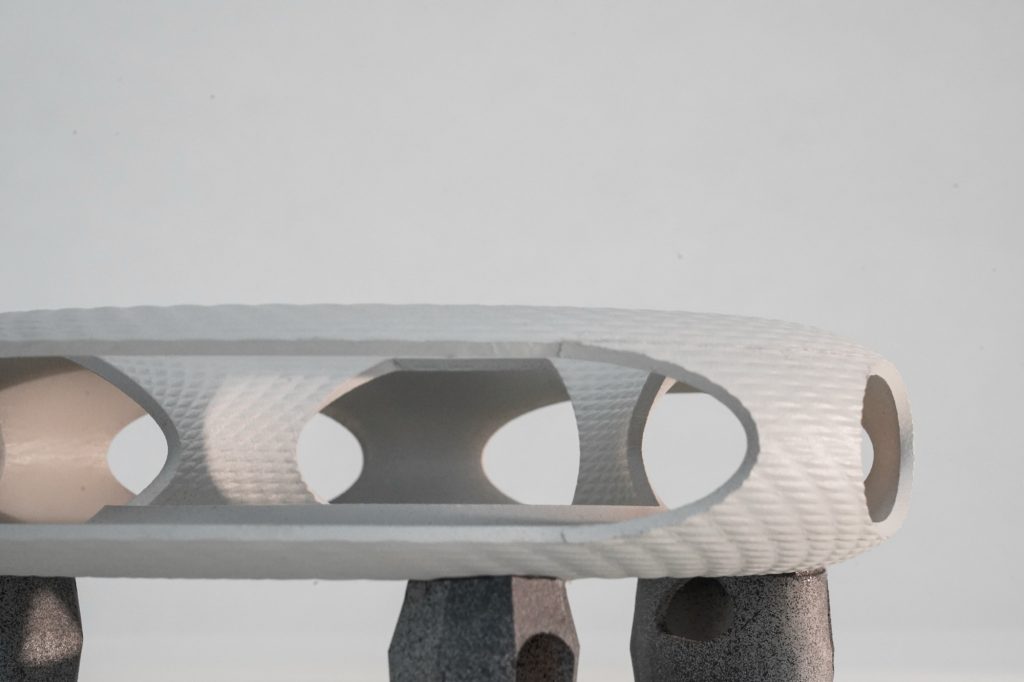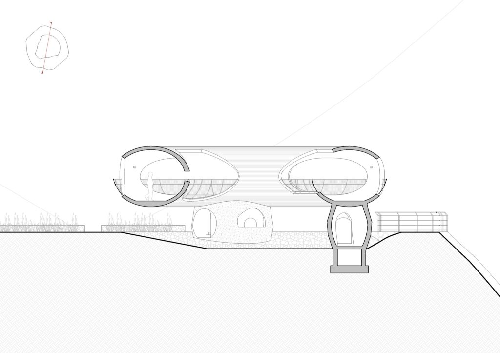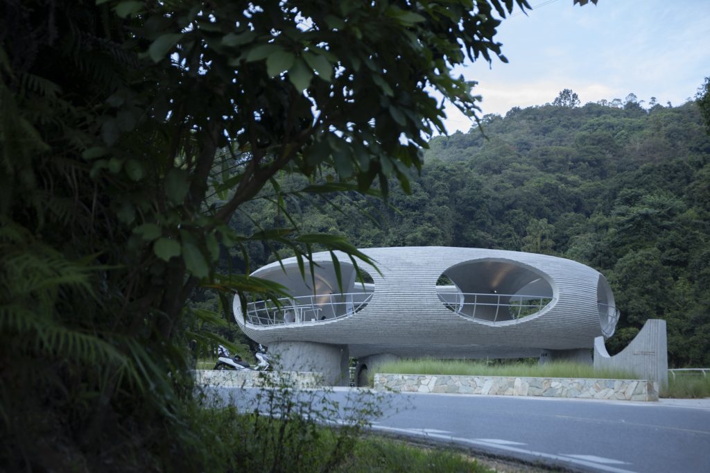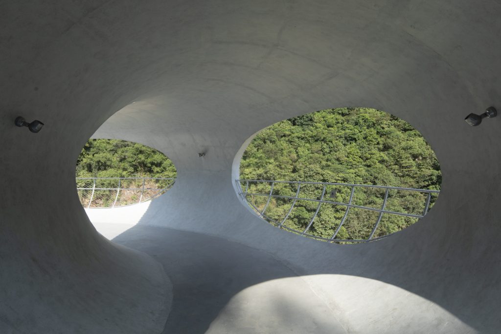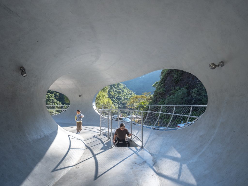 Material contrast sharpens the experience. The exterior surface was cast on site using moulds made from raised texture bamboo, with an approximate section diameter of 7 centimetres, giving the concrete a tactile skin that resonates with the site’s wild edge. Inside, the concrete turns smooth and seamless, producing a quieter, more abstract atmosphere. The transition is most vivid along the oval cuts, where the ruffled edge brings the bamboo imprint into crisp relief.