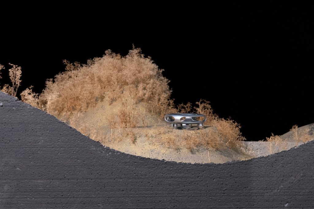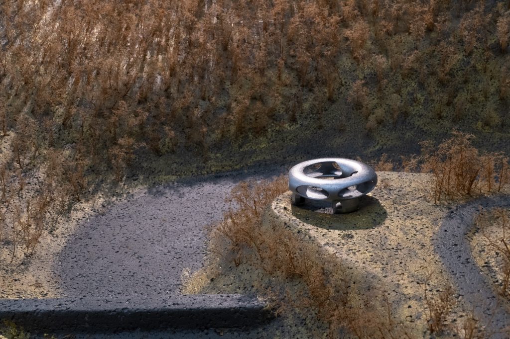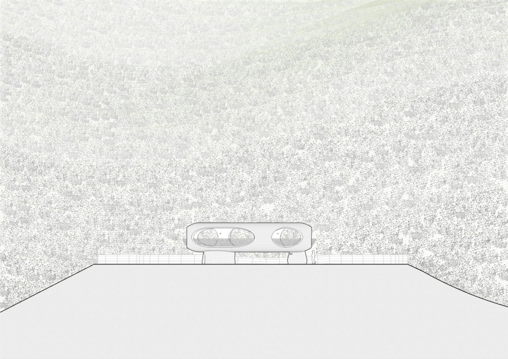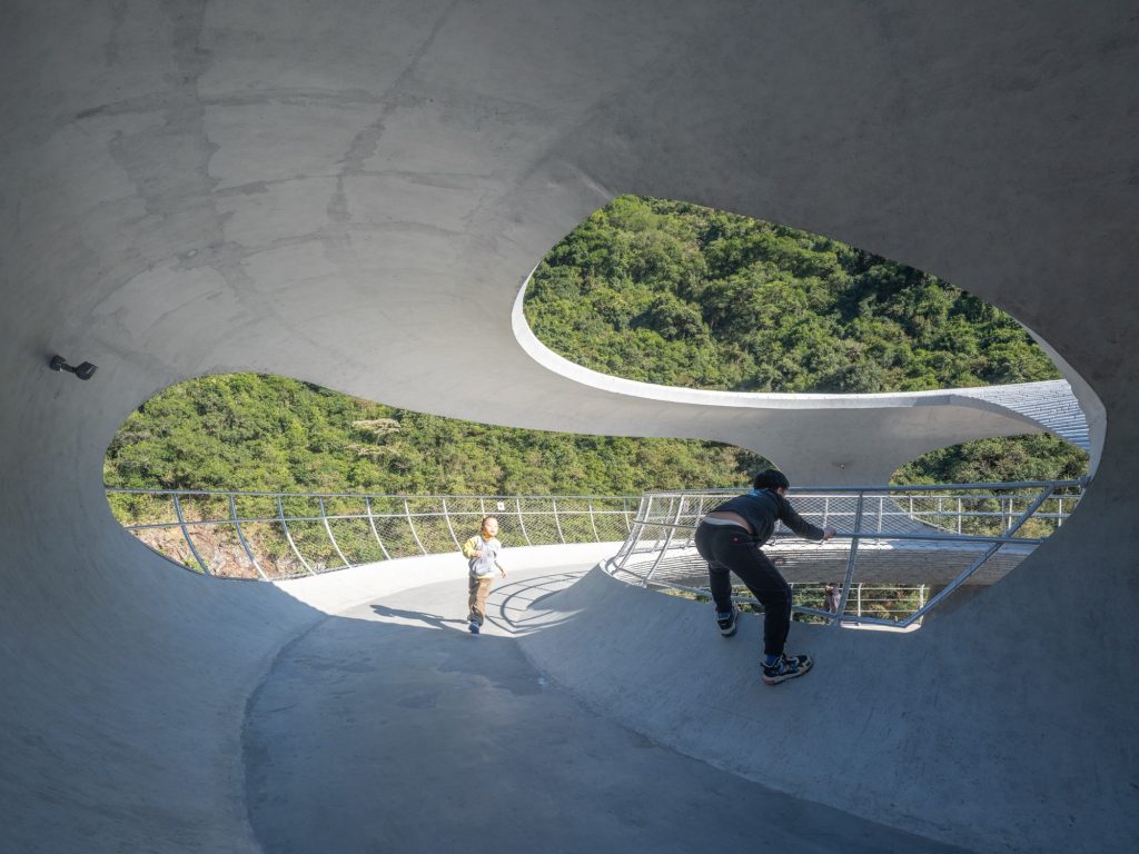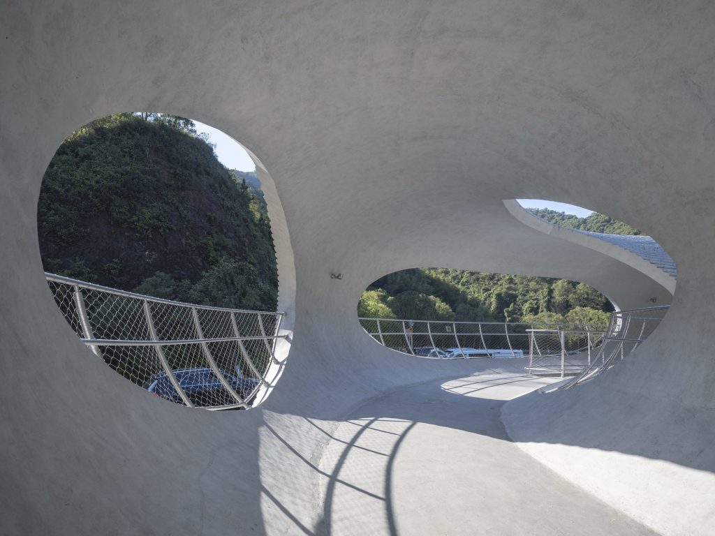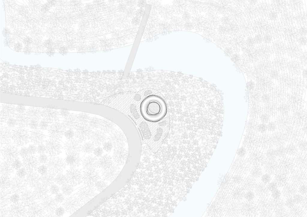 The pavilion reads as a concrete donut hovering just above the ground plane, an object with a faintly otherworldly presence, as if it has landed rather than been built. Its circular promenade turns the sharpness of the road into a slow experience, offering a pause without fully withdrawing from movement. From the riverbank edge to the rising mountain backdrop, the architecture is calibrated to make looking feel effortless.