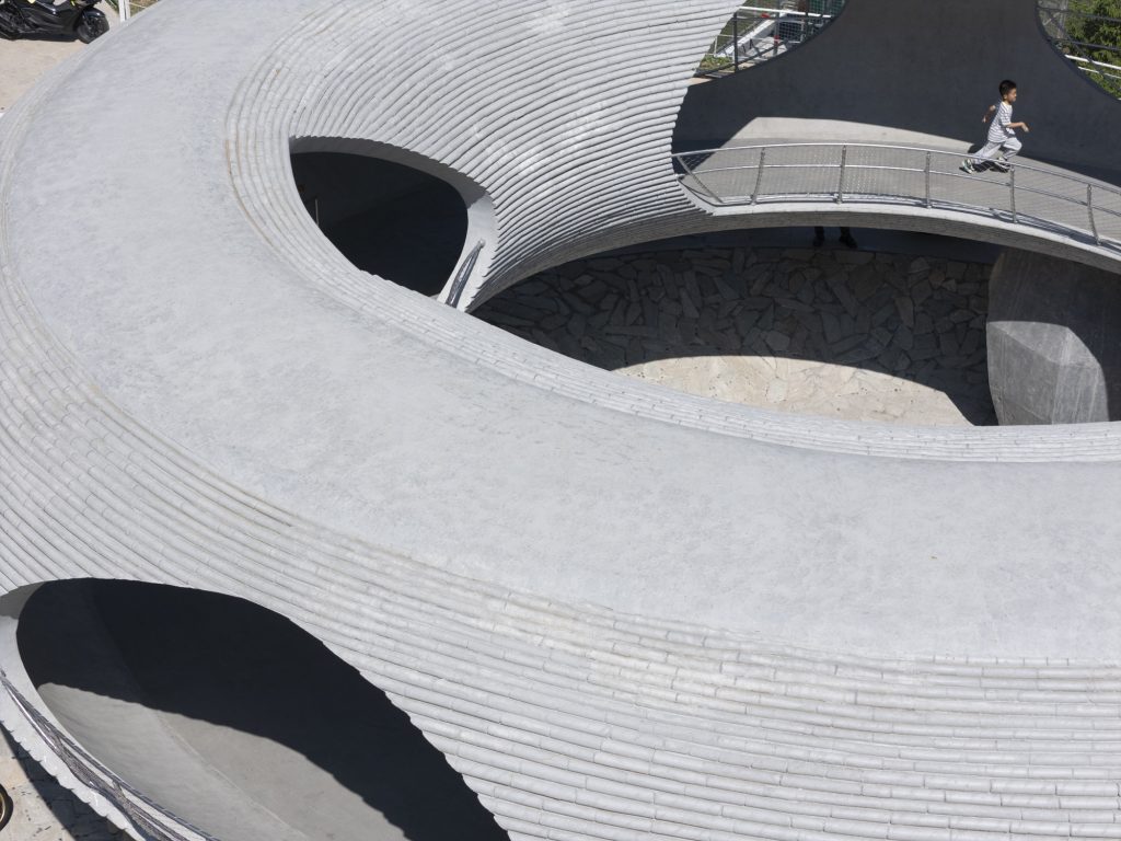 Three supporting concrete volumes stand within the sunken plaza, containing a compact cafe, a public toilet, and storage. Their doors and windows align to create sightlines through and across the service core, keeping the lower level connected to the wider setting. A dark, hammered finish on these volumes echoes the stone paving underfoot, and sits alongside the sculptural seating titled Social Stone by Shanghai based artist SU Chang.