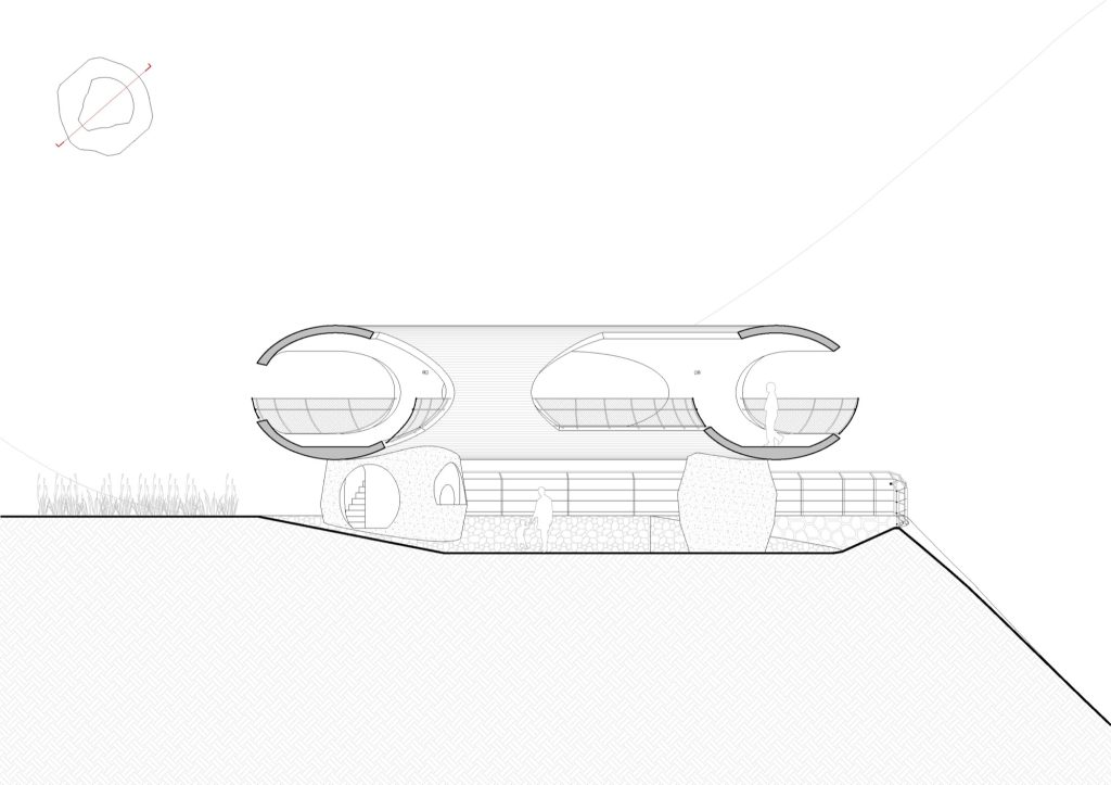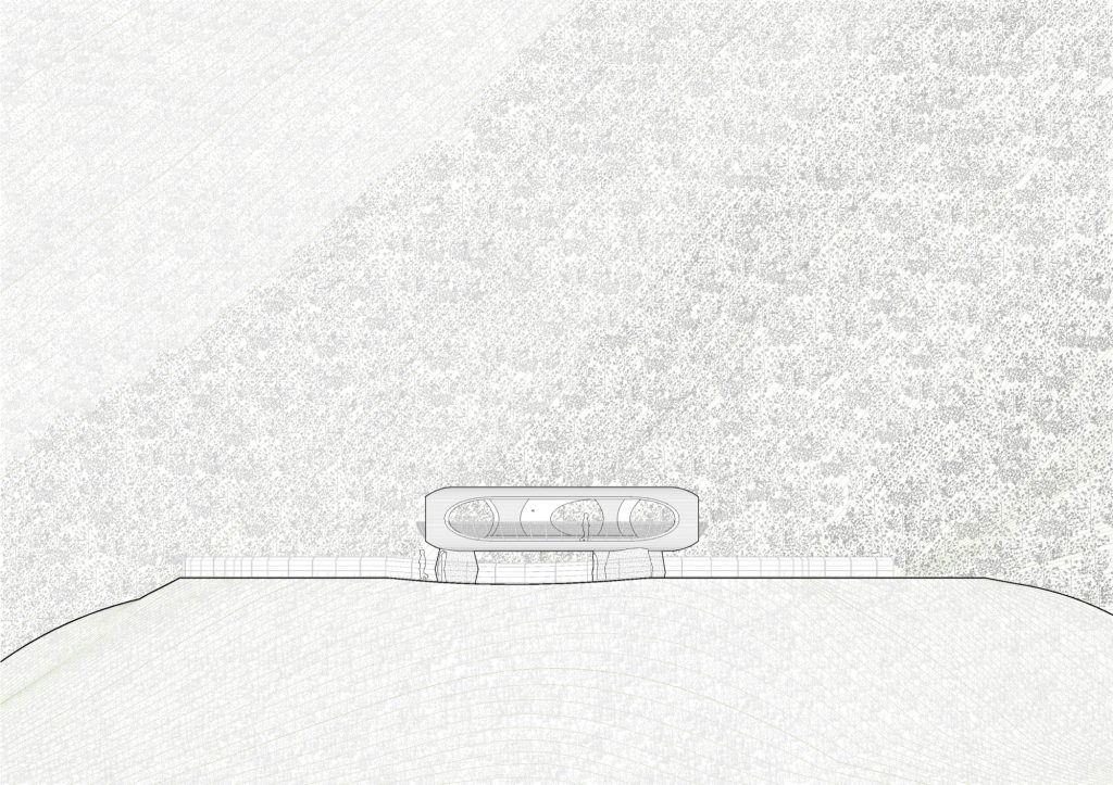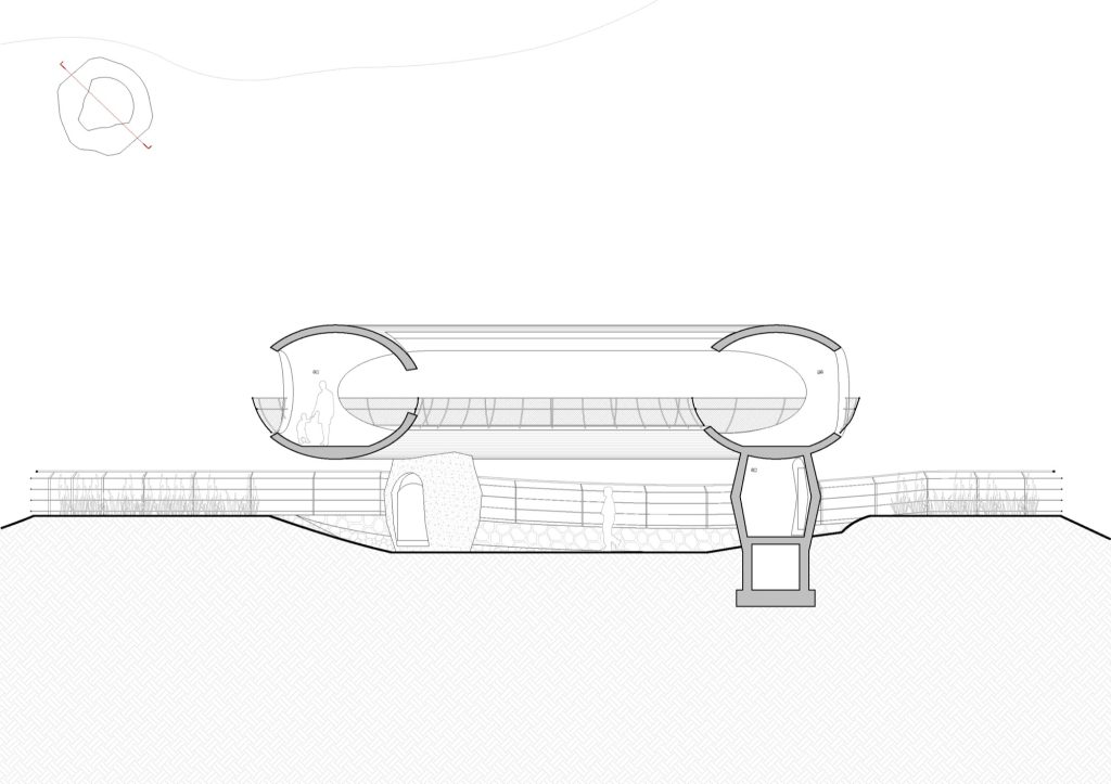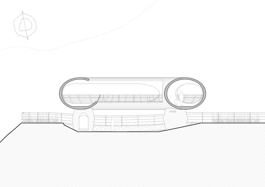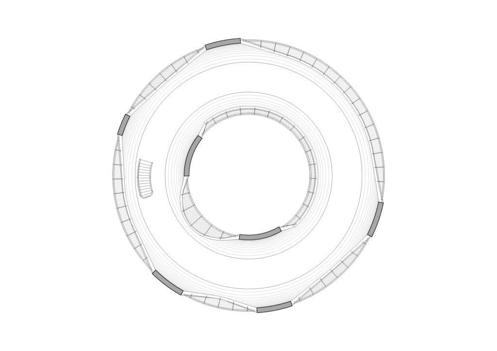 The project’s scenic frames unfold across two levels. Below, a sunken plaza becomes a sheltered place to sit, drink, and regroup, protected by the mass of the ring overhead. Above, the roof level is a continuous loop for walking, an unbroken circuit that encourages lingering and return. The result is both a rest point and a viewpoint, where the act of stopping becomes part of the route.