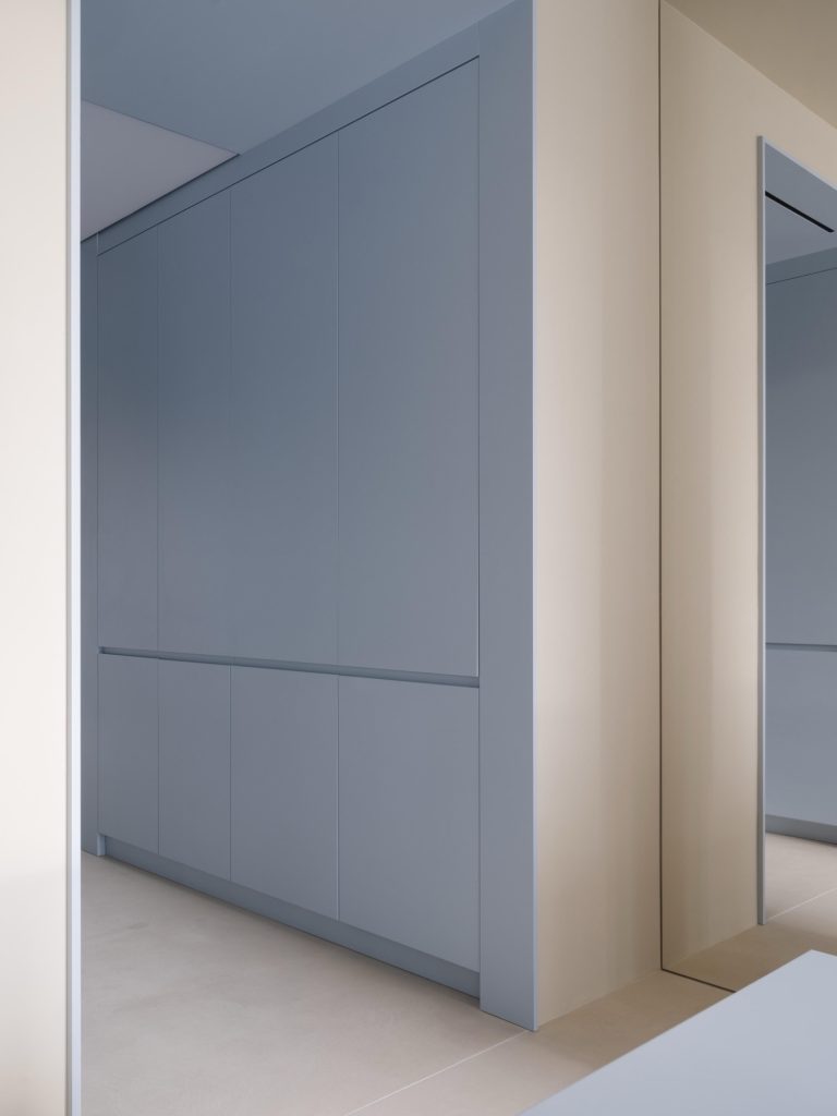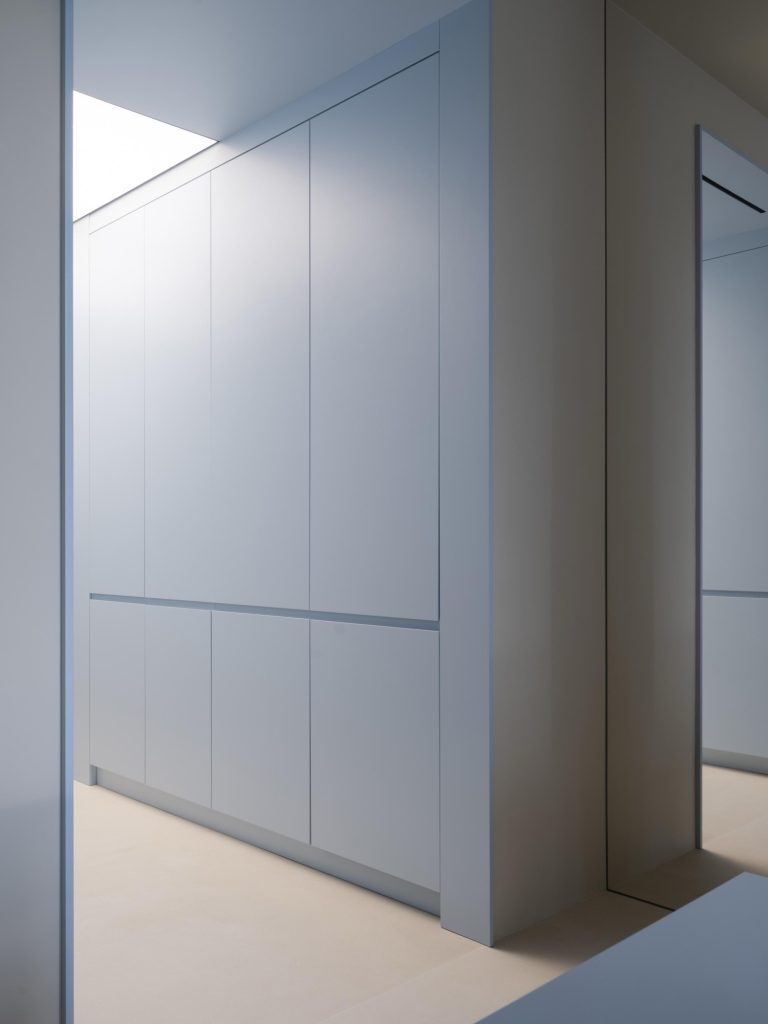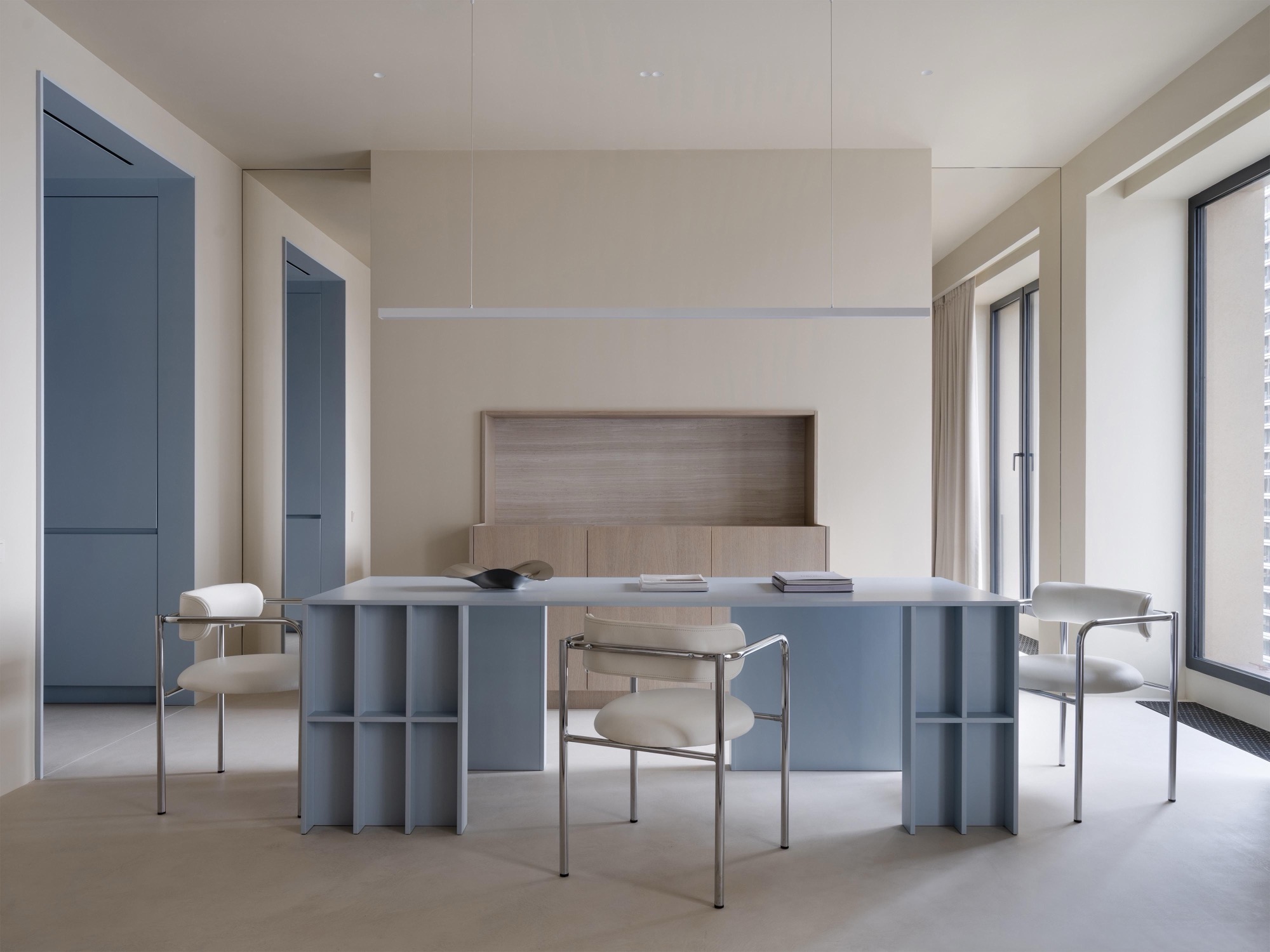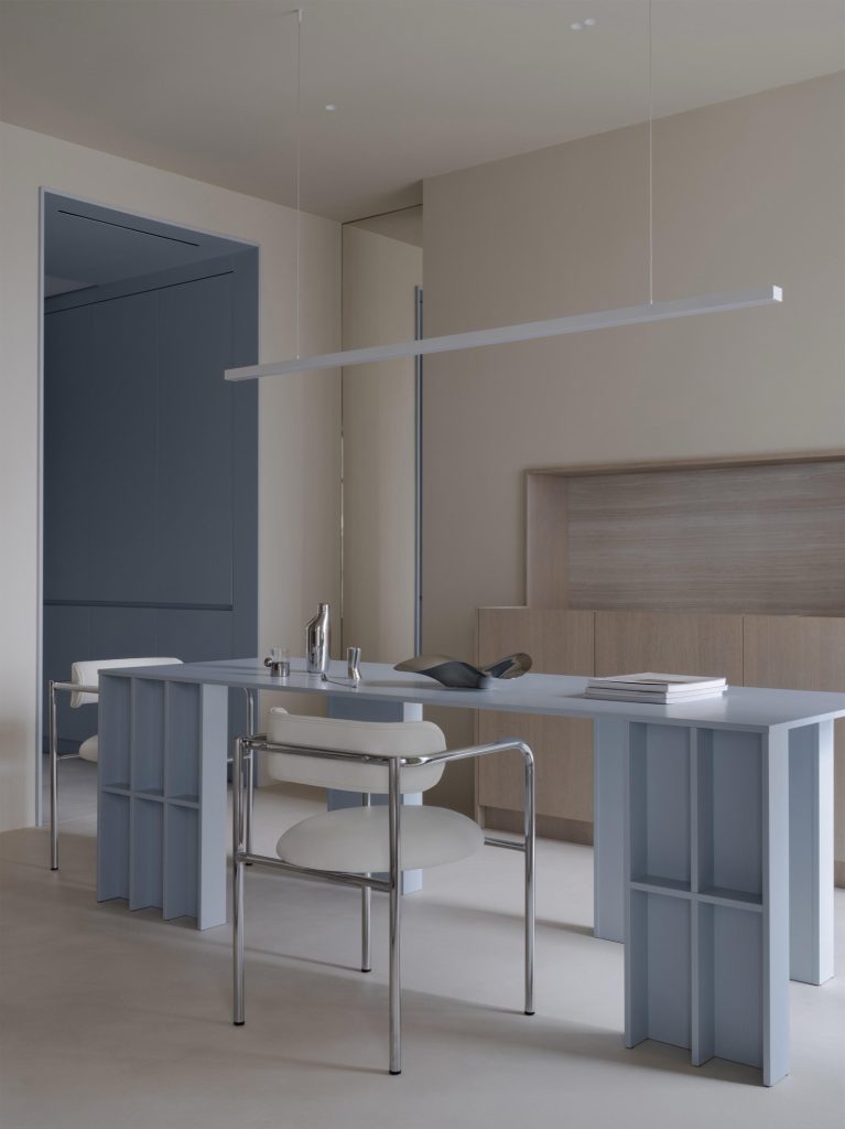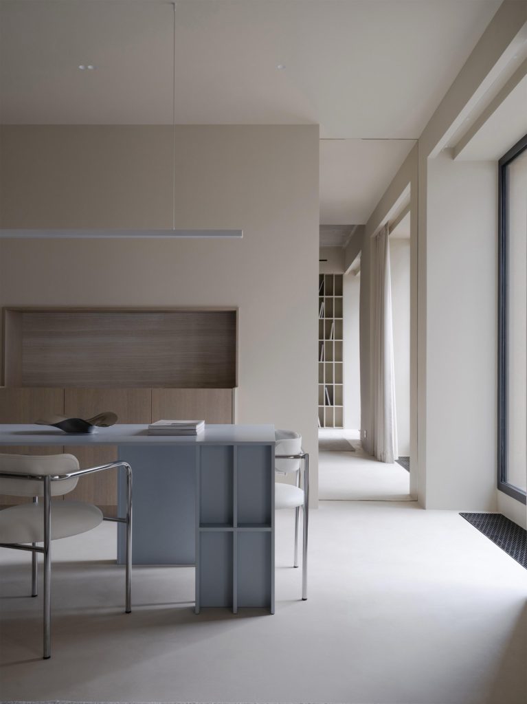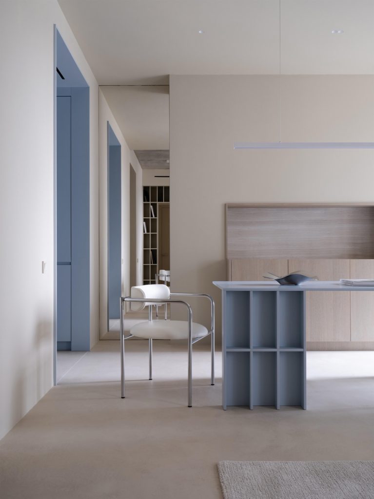 Perhaps the most demanding aspect of the project was the selection of wall color. Approximately twenty variations of beige were tested, each responding differently to changing daylight conditions. In an interior conceived as almost entirely monochrome, with the exception of the sky toned accent volume, tonal precision became critical.