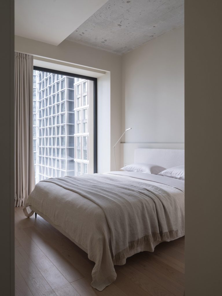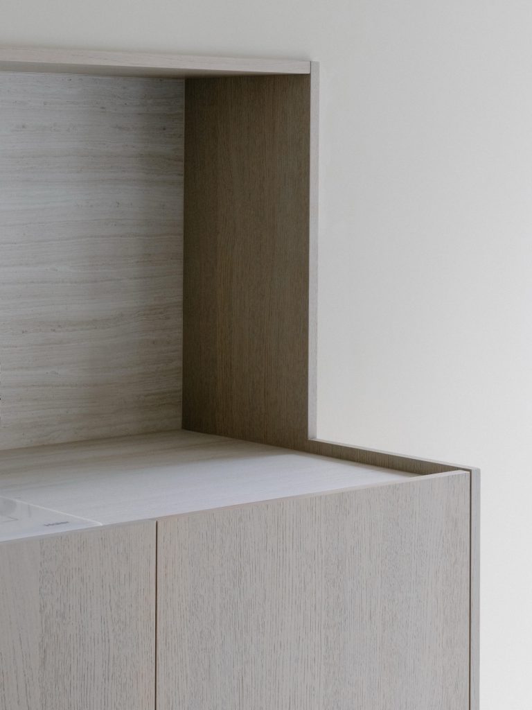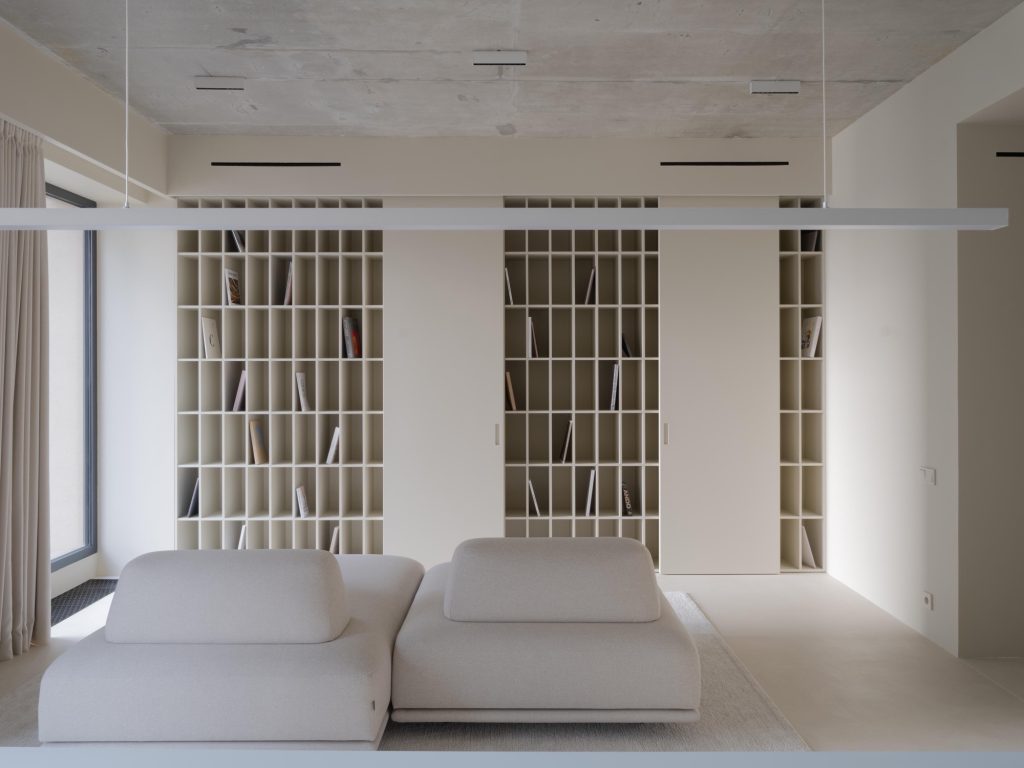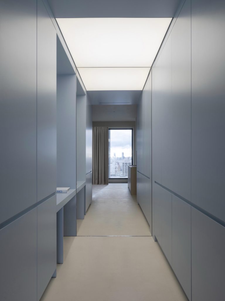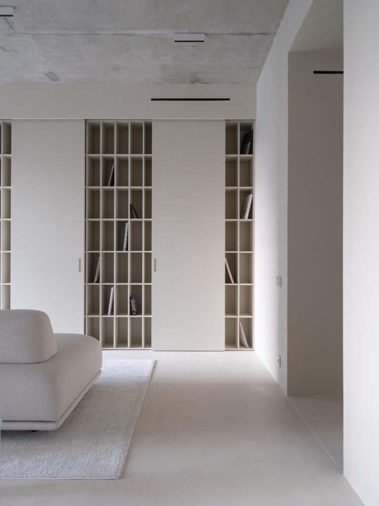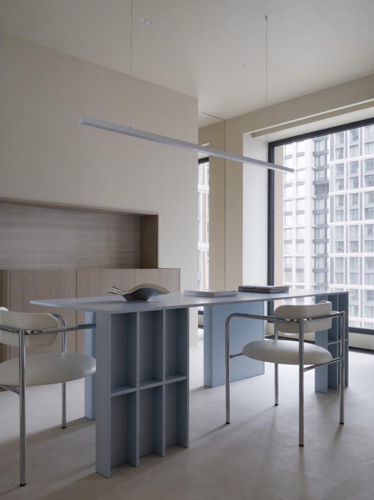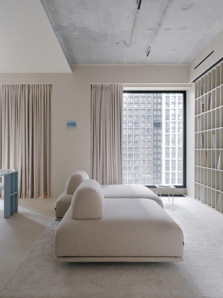 Perhaps the most demanding aspect of the project was the selection of wall color. Approximately twenty variations of beige were tested, each responding differently to changing daylight conditions. In an interior conceived as almost entirely monochrome, with the exception of the sky toned accent volume, tonal precision became critical.