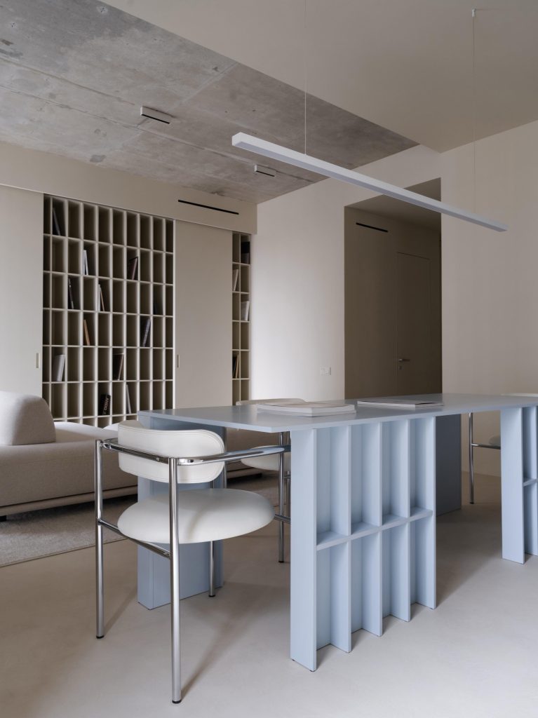 With the exception of upholstered pieces, all furniture was designed from Krisanova’s sketches. The dining table and library reinterpret the structural language of Kikutake’s Sky House. The table legs, inspired by the original project’s portal supports, appear to shift depending on the observer’s position, introducing a dynamic reading of an otherwise stable object.